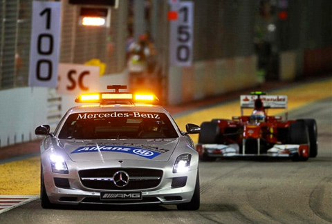 Старт, данный в 20:00 по местному времени, прошёл вполне мирно, хотя обломки углепластика в хвосте пелотона полетали. Все лидеры остались при своих. Только участники гонки успели вытянуться в унылую процессию, как Force India Витантонио Лиуцци встал на трассе, и главный инструмент по созданию интриги в Сингапуре — серебристый SLS AMG был пущен в ход. И поставил гоночных инженеров перед любопытным выбором — переобуть болиды без потери времени, но обречь их на прохождение большей части дистанции без смены шин, или подождать ещё.
