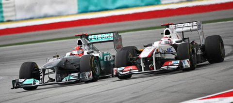 Калейдоскоп остановок в боксах породил волну красивых дуэлей по всему пелотону и высветил прелести второй новинки — управляемого заднего крыла (DRS). Обгоны, безусловно, стали проще — разница в скорости на прямой между обгоняющими и обгоняемыми была просто пугающей. Как оказалось, даже Red Bull Уэббера не сможет отстоять позицию против Заубера Кобаяси, если тот вдруг окажется сзади в пределах секунды.