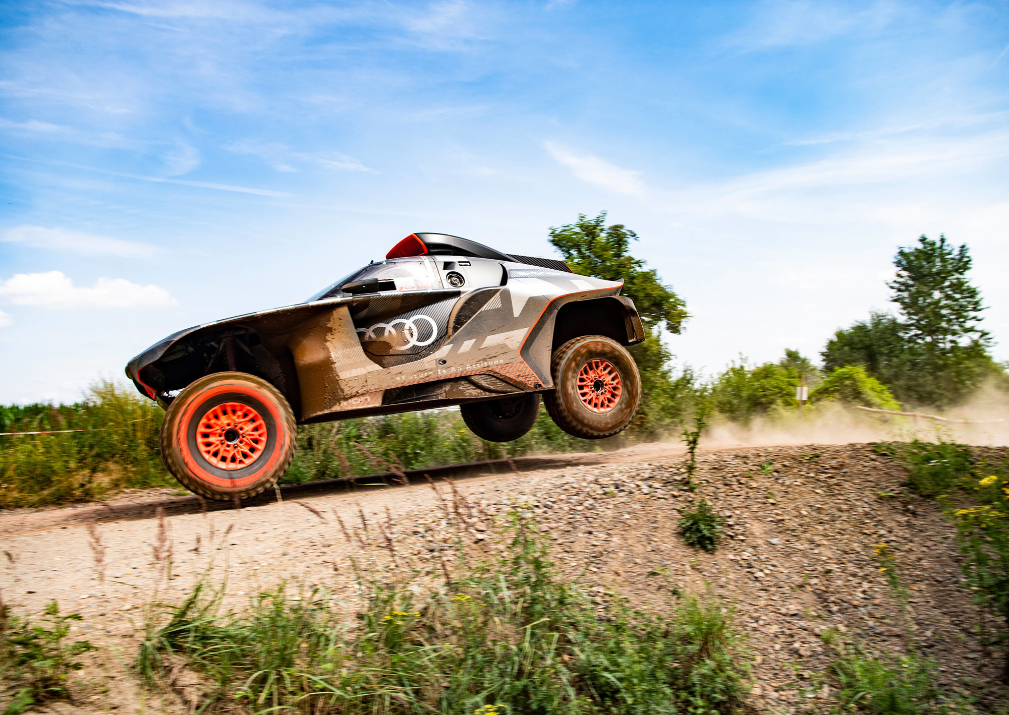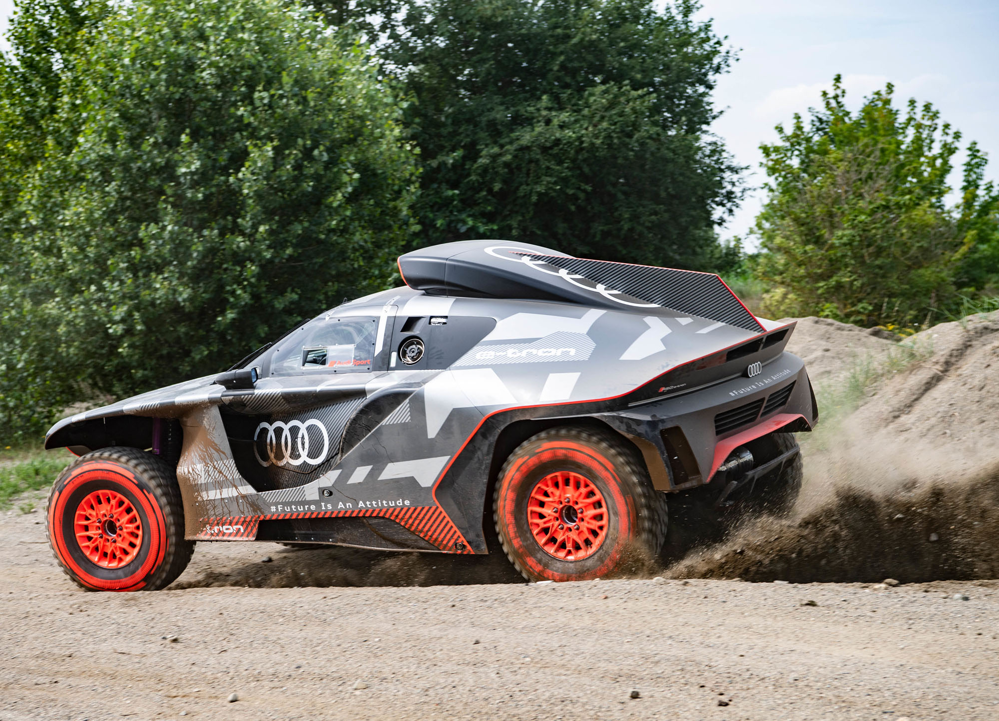 Модель Audi RS Q e-tron по названию напоминает мультипликационный RSQ e-tron, однако не имеет с ним ничего общего. Представленный сегодня автомобиль — это гибрид последовательного типа (или электрокар с бортовым генератором). Здесь ДВС вращает генератор для пополнения заряда батареи. Немцы назвали эту систему «энергетический конвертер». Колёса приводятся только от электромоторов (на передней и задней осях стоят отдельные модули привода). Если судьи не отклонят заявку, этот аппарат будет сражаться за победу в абсолютном зачёте «Дакара» в январе 2022 года под флагом команды Q Motorsport.