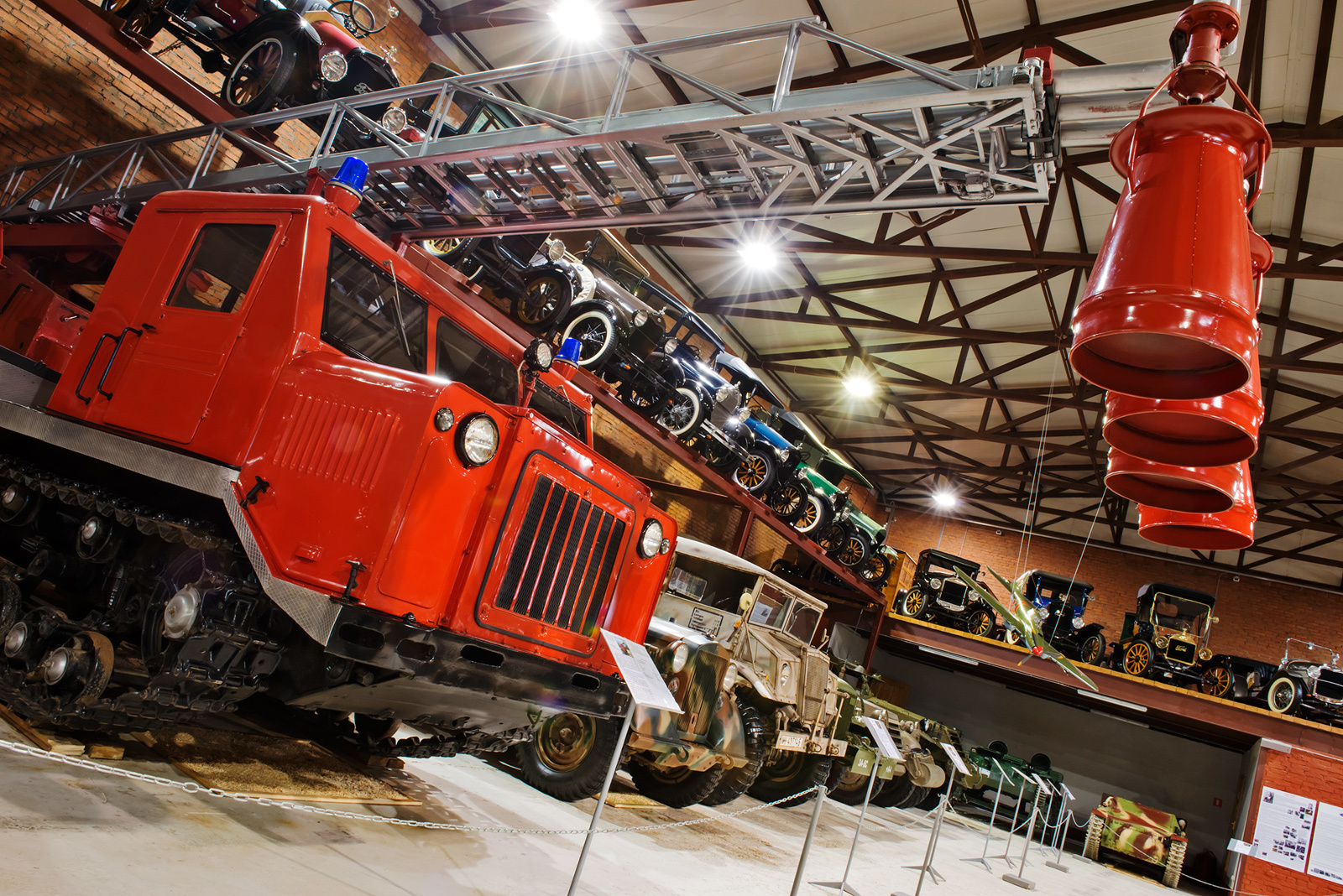 Знаменитая коллекция пожарных машин разместилась в специально построенном просторном и хорошо освещённом ангаре. Тут же выгорожена антресоль, на которой выставлены в ряд два десятка автомобилей Ford T разных модификаций. Очень нарядно! И для такой внушительной коллекции доля частных экспонатов невелика — около 30%. До 80% единиц хранения — на ходу.