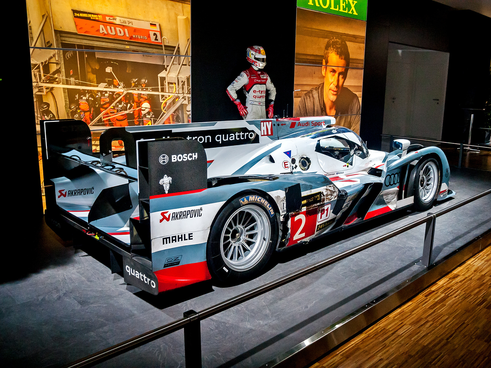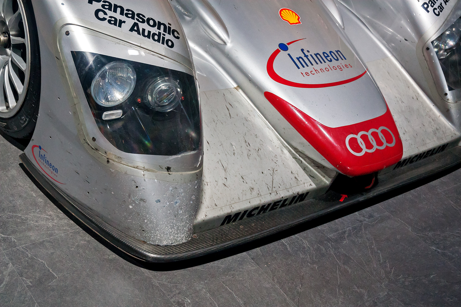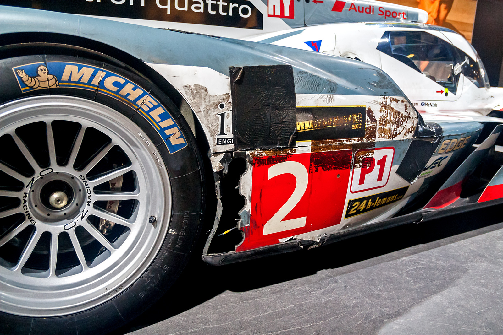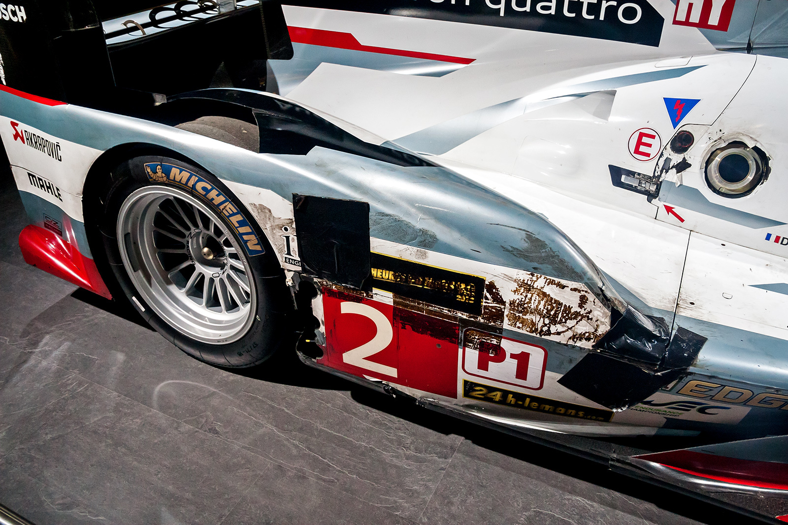 В зале прототип Audi R18 e-tron quattro оказался самым искалеченным из всех. Проломленный местами кузов не везде заклеен заплатками, автомобиль исцарапан, в грязи, в копоти — полное ощущение, будто он только что вернулся с передовой. Организаторы правильно сделали, что не стали приводить машину в порядок. Новёхонький с иголочки Audi R18 e-tron нам встречать приходилось. Так вот, чистюля хорош, но измученный оставил неизгладимое впечатление.