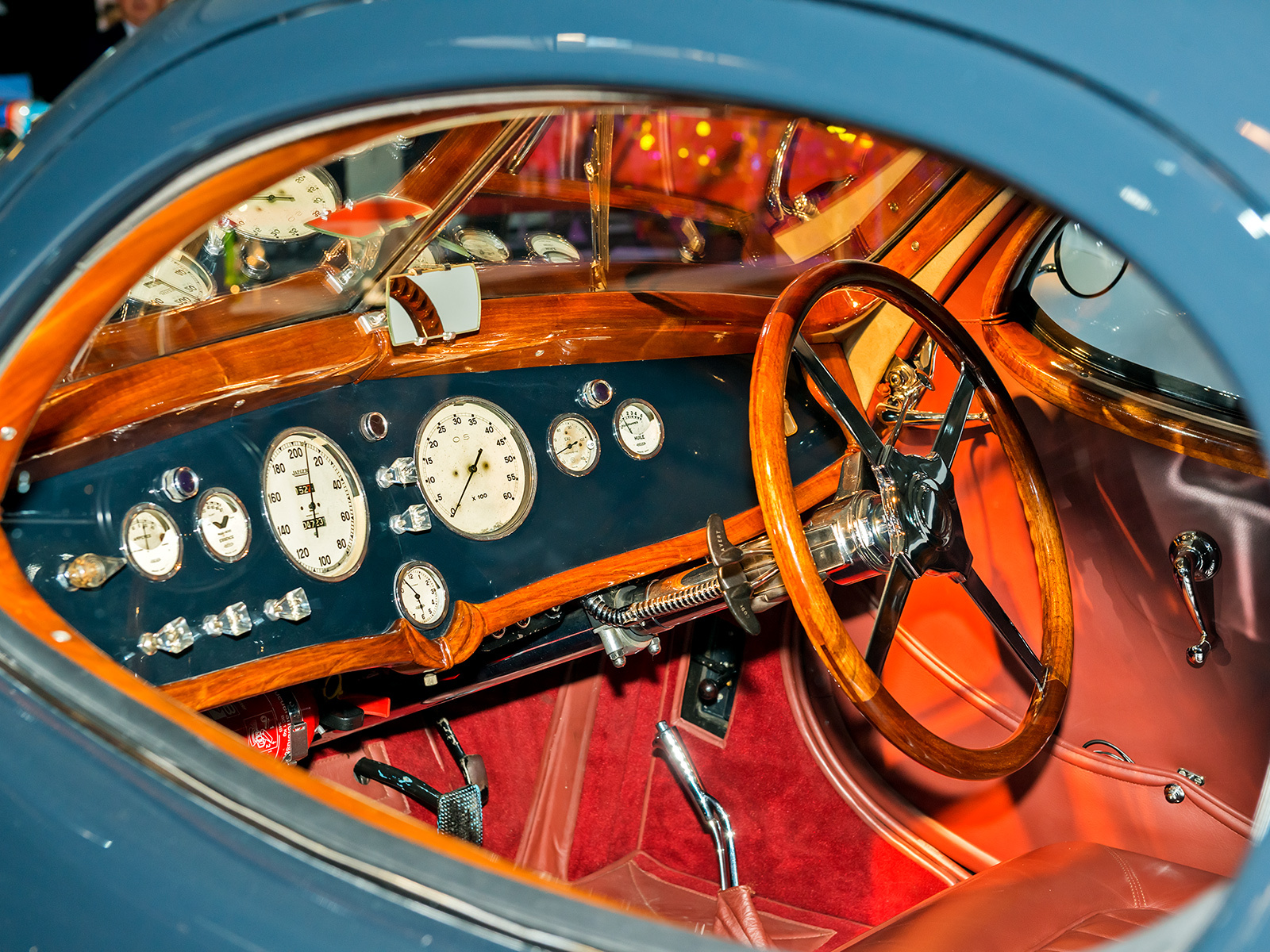 Родстер Jaguar XK 120 OTS (1951) — великолепный образец из семейства 120, первого послевоенного спортивного Ягуара, появившегося в 1948 году. Число 120 означает паспортную максималку в милях, стало быть, это 193 км/ч. Ещё более впечатлял современников разгон до сотни за 9,5 с. Мотор — рядная «шестёрка» объёмом 3,44 л (160 л.с.).