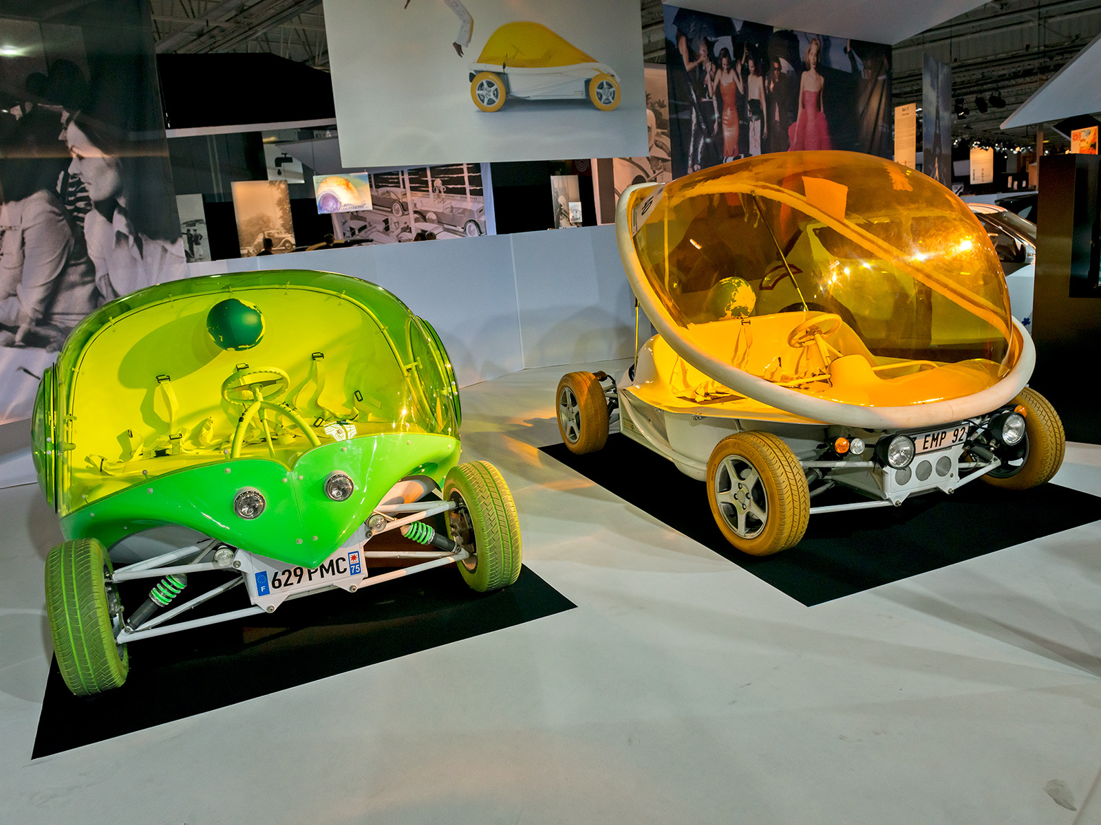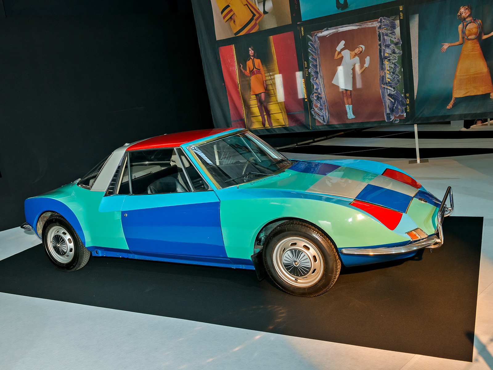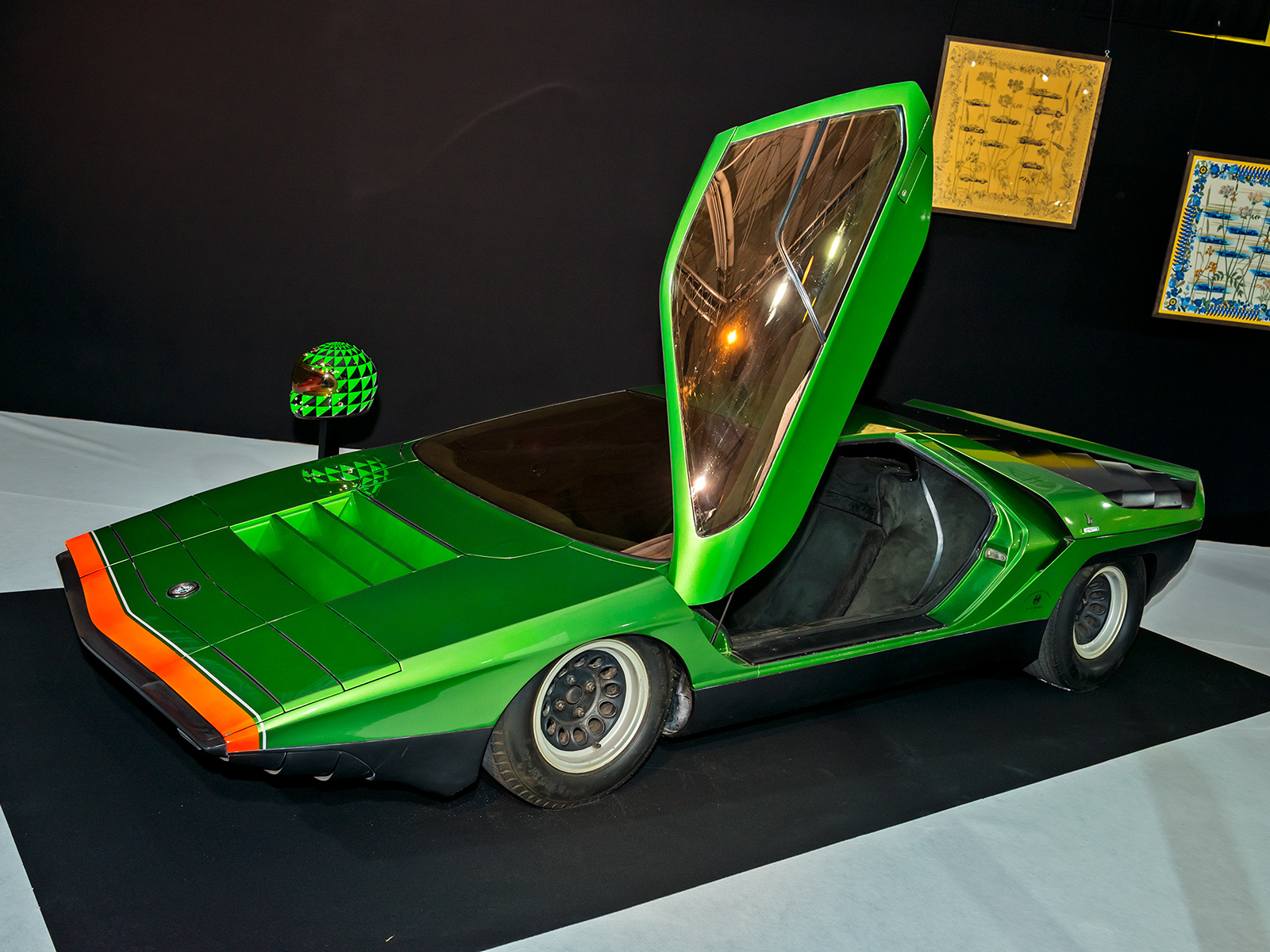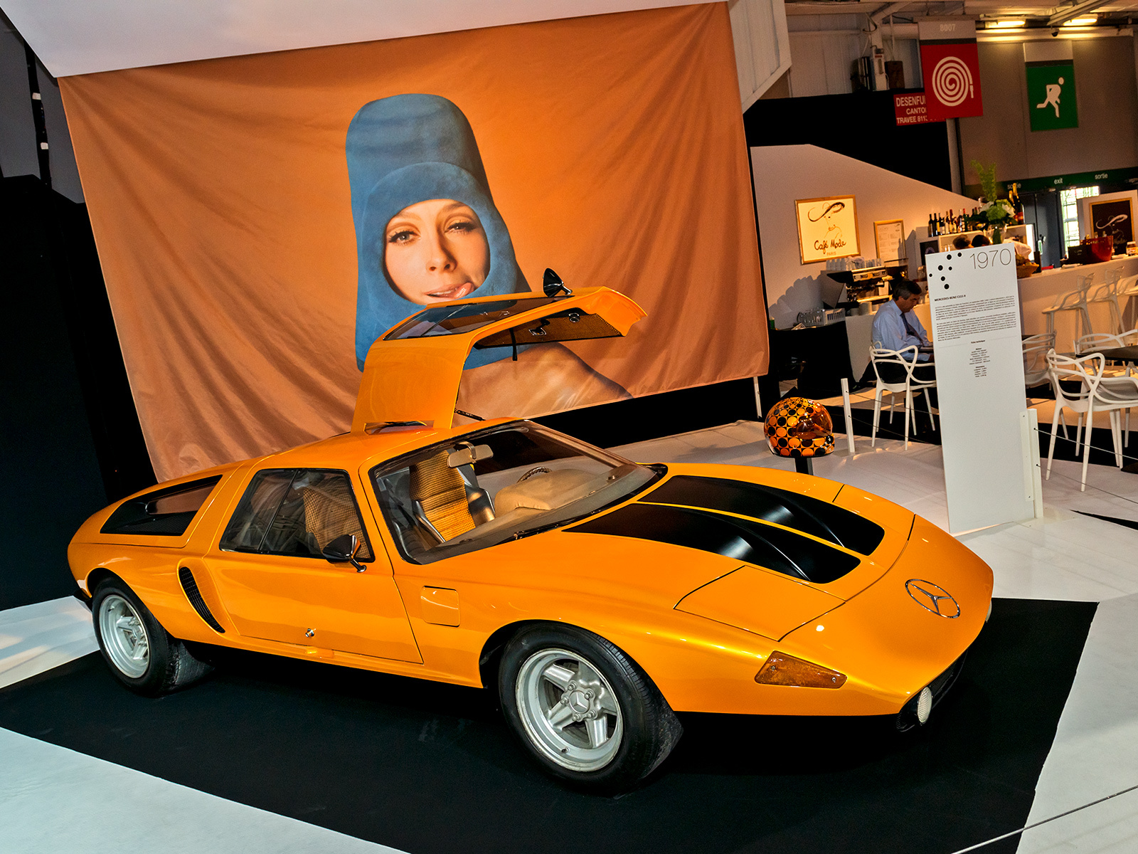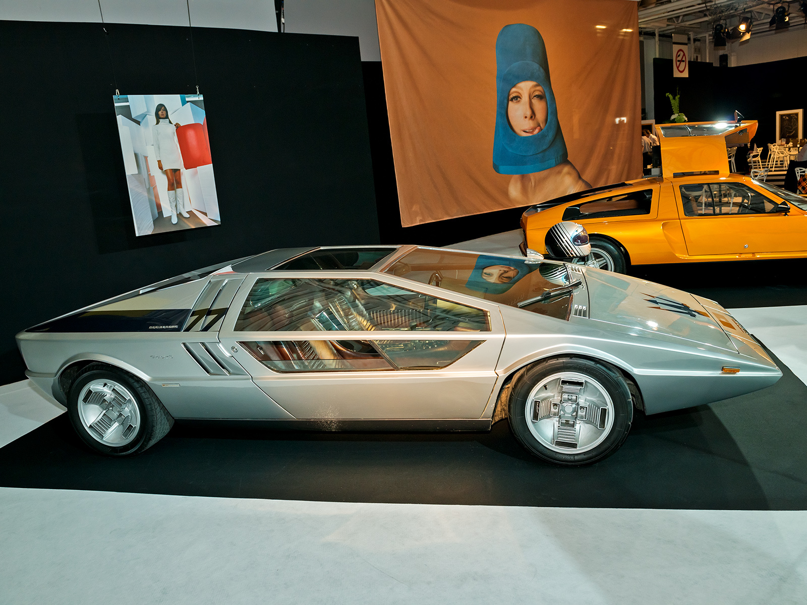 Концепт Alfa Romeo 33 Carabo (1968) кисти Марчелло Гандини (первенец эпохи клиновидного дизайна) и Maserati Boomerang (1971) работы Джорджетто Джуджаро — попытка автомобильных дизайнеров заглянуть в далёкое будущее. Подобным стремлением были одержимы и модельеры 1970-х. Для этой эпохи характерны эклектичность, разноплановость, неутомимые поиски нового. Главное — отличаться от других. Тот же Boomerang, с его теоретической максималкой 300 км/ч, вполне подходил под такое определение. Компанию «итальянцам» на стенде составил немецкий концепт Mercedes-Benz C111-II 1970 года. Позади сидений в нём был установлен четырёхсекционный двигатель Ванкеля, развивавший 350 л.с. С ним купе разгонялось до 300 км/ч, а спурт до сотни давался ему за 4,8 с.