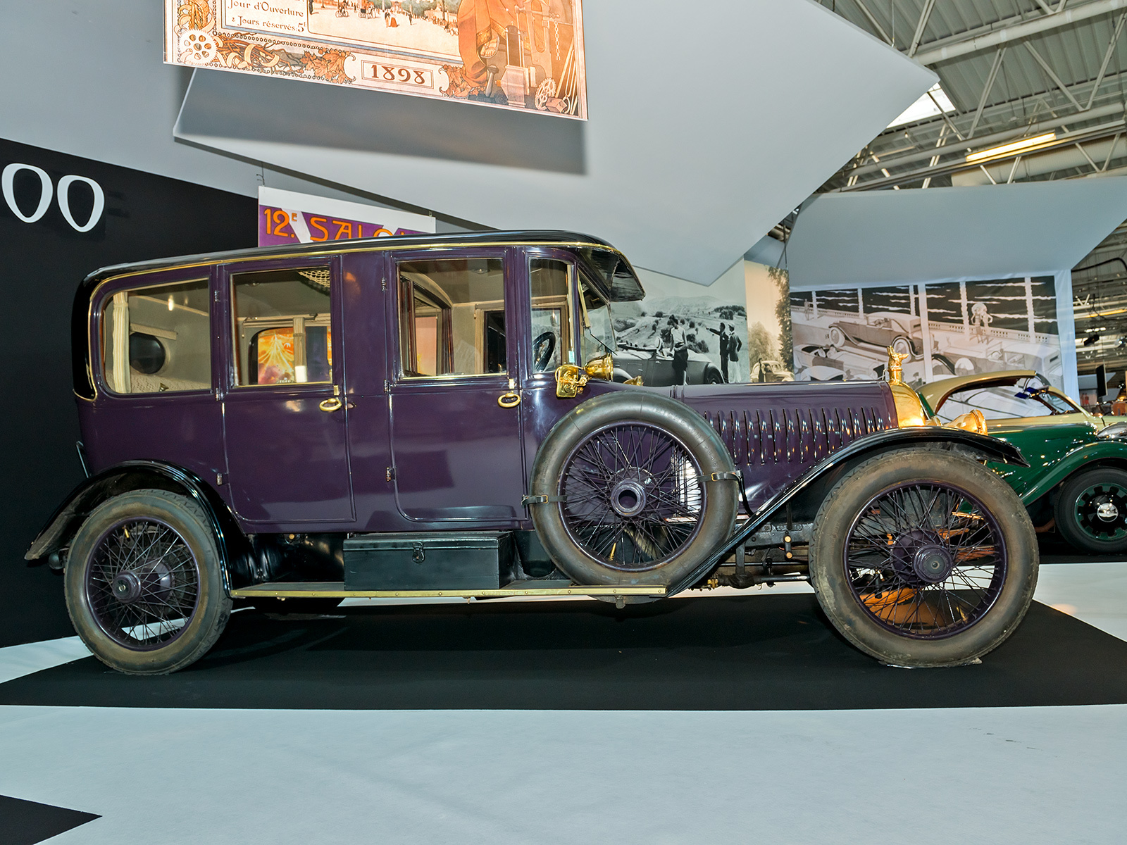 Лимузин Hotchkiss AD 20/30 HP второй серии (1914). Постройка этого экземпляра совпала с началом Первой мировой войны, сразу с конвейера он отправился в армию, где прослужил аж до конца 1950-х, после чего перекочевал в музейные экспозиции (время от времени меняя место жительства). Для самой фирмы Hotchkiss это была во многом пионерская модель. Например, здесь была внедрена смазка под давлением. Двигатель (четырёхцилиндровый, объёмом 5,7 л, 55 л.с.) позволял разгоняться до 85 км/ч, расходуя 25–30 л/100 км (не так уж удивительно при массе в 2120 кг). Проезжать автомобиль мог на одной заправке приличное расстояние: бак вмещал 100 литров.