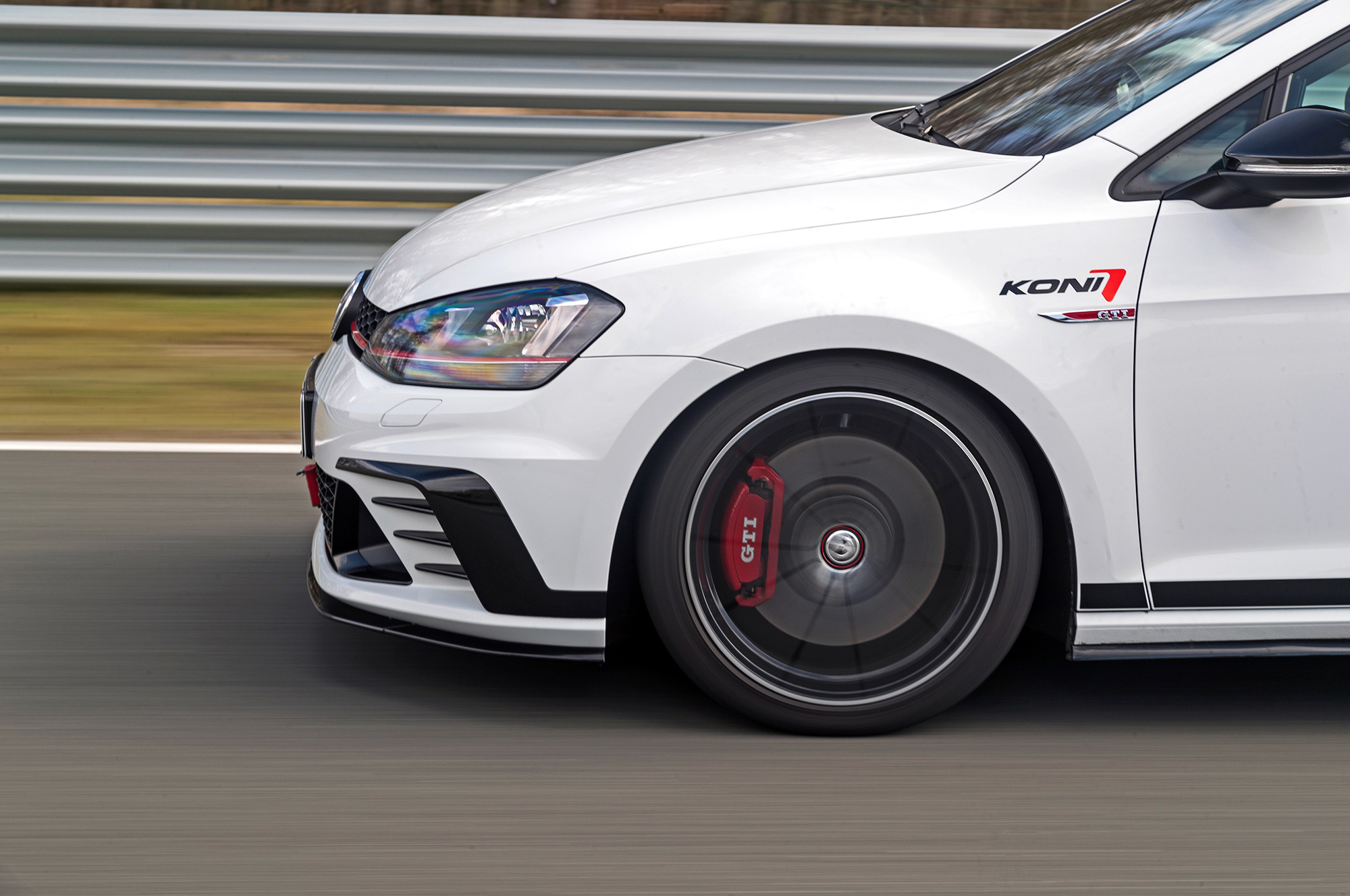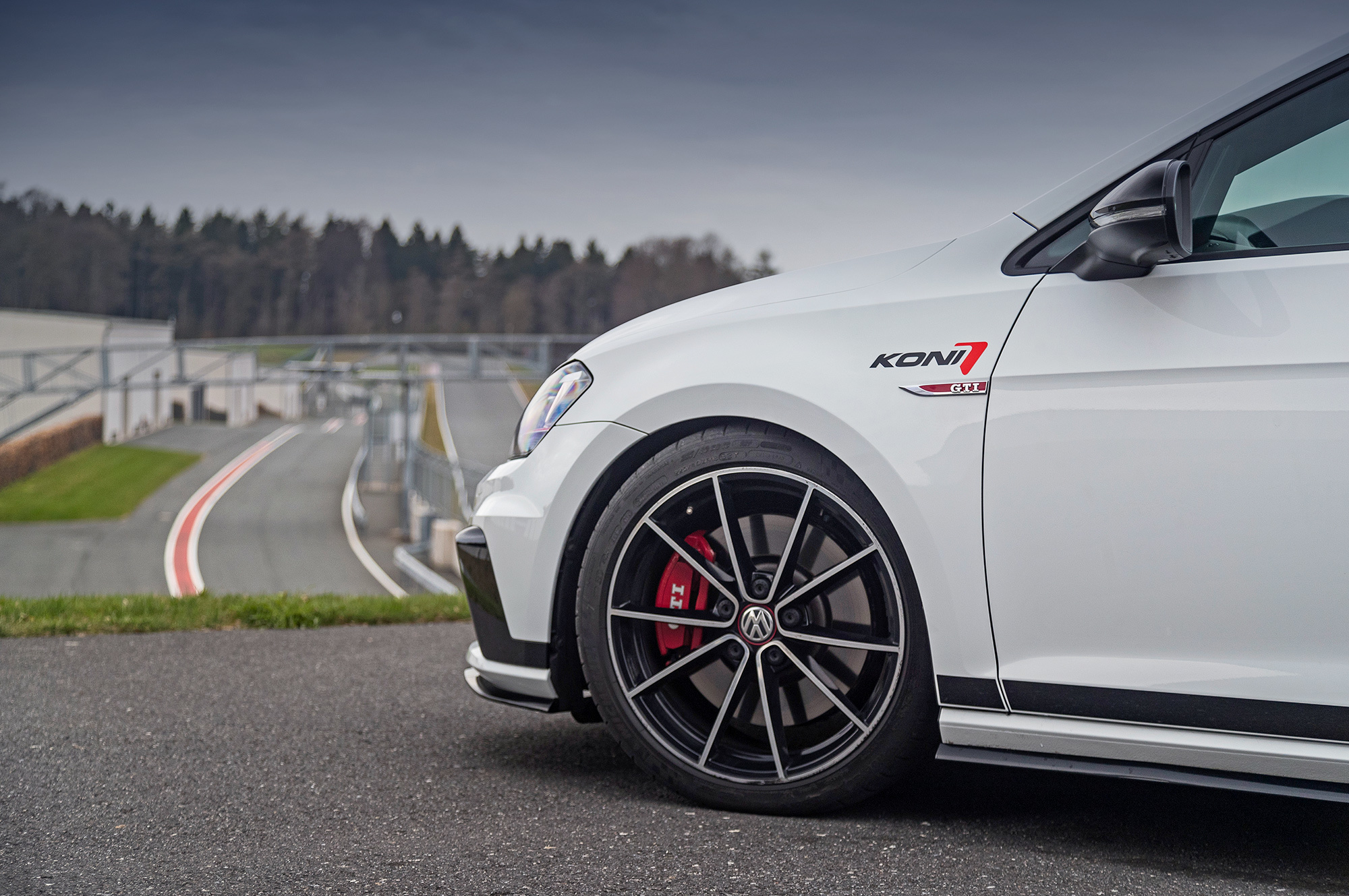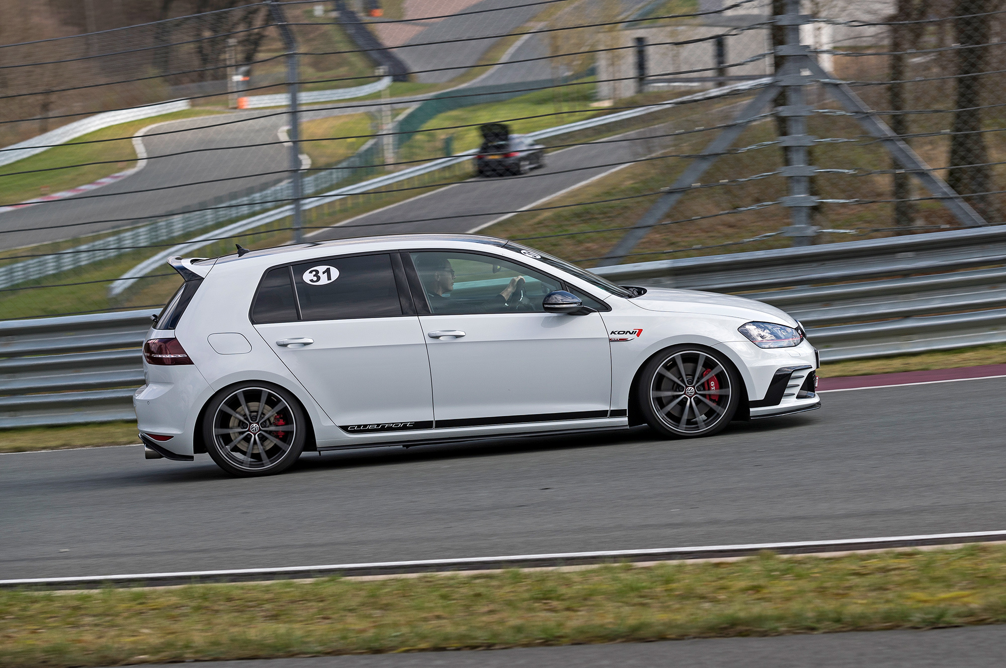 Volkswagen Golf GTI в трековой версии Clubsport великолепен без всяких доработок. Хэтч страстно вгрызается в гоночный асфальт, недостаточная поворачиваемость сведена почти на нет. Жёсткость подвески не чрезмерна ― приемлемый вариант на каждый день. Однако Koni будто выбирают из Гольфа невидимые резервы: держак становится ещё крепче, руль ― точнее, а поведение в повороте нейтральнее. Уходит силовое подруливание, нет-нет да и проявляющееся на стандартной машине. Блеск! Но многое зависит от настроек. Времени играть с ними не было ― мы ездили в пятом положении из восьми и по отбою и по сжатию, а клиренс был выставлен на минимум.