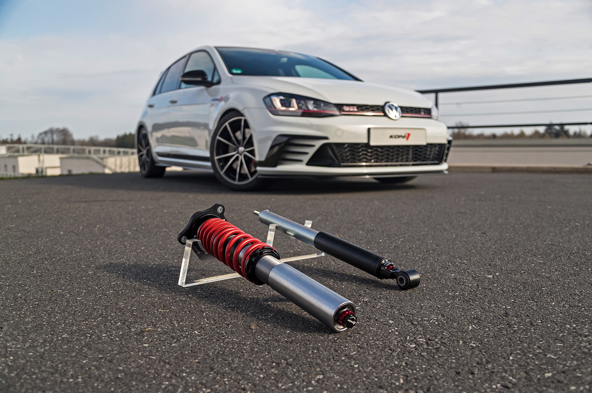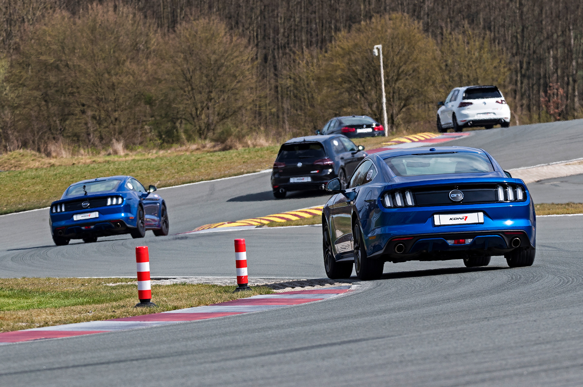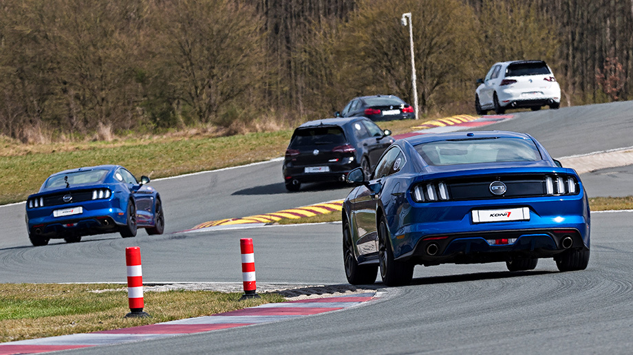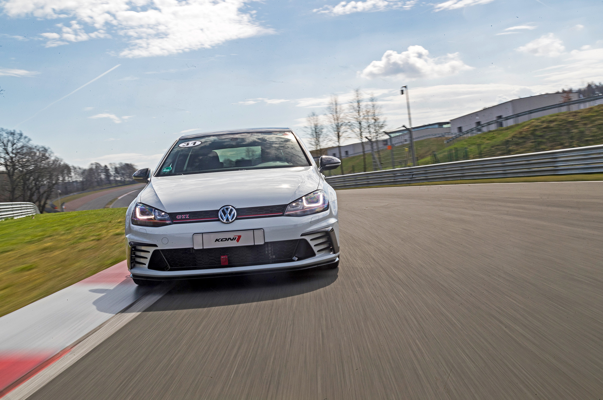 Volkswagen Golf GTI в трековой версии Clubsport великолепен без всяких доработок. Хэтч страстно вгрызается в гоночный асфальт, недостаточная поворачиваемость сведена почти на нет. Жёсткость подвески не чрезмерна ― приемлемый вариант на каждый день. Однако Koni будто выбирают из Гольфа невидимые резервы: держак становится ещё крепче, руль ― точнее, а поведение в повороте нейтральнее. Уходит силовое подруливание, нет-нет да и проявляющееся на стандартной машине. Блеск! Но многое зависит от настроек. Времени играть с ними не было ― мы ездили в пятом положении из восьми и по отбою и по сжатию, а клиренс был выставлен на минимум.