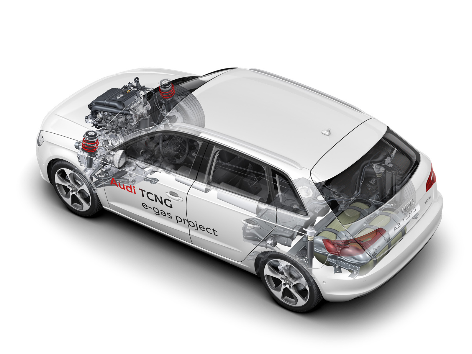 В третьем квартале 2013 года ингольштадтцы выведут на рынок свой первый серийный автомобиль на метане. Это пятидверка A3 Sportback в модификации TCNG (обычный хэтч нового поколения стартует раньше — в феврале). Повышенный интерес вызывает то, что немцы намеренно развивали параллельно два проекта, дополняющие друг друга. Одни специалисты Audi превращали модель А3 в двухтопливную машину, а другие, совместно со штутгартской компанией SolarFuel, доводили до ума экзотический процесс конвертации электричества и углекислого газа в метан. Со многих точек зрения такой приём интереснее, чем зарядка батарейных машин.