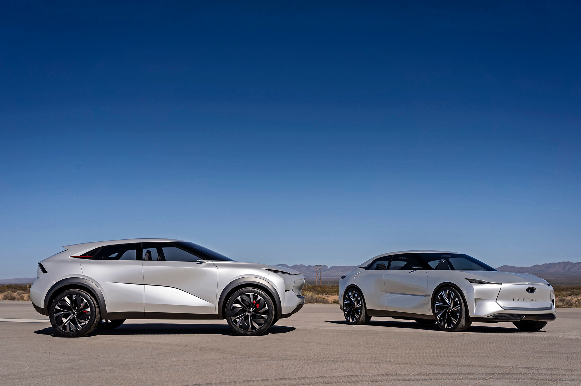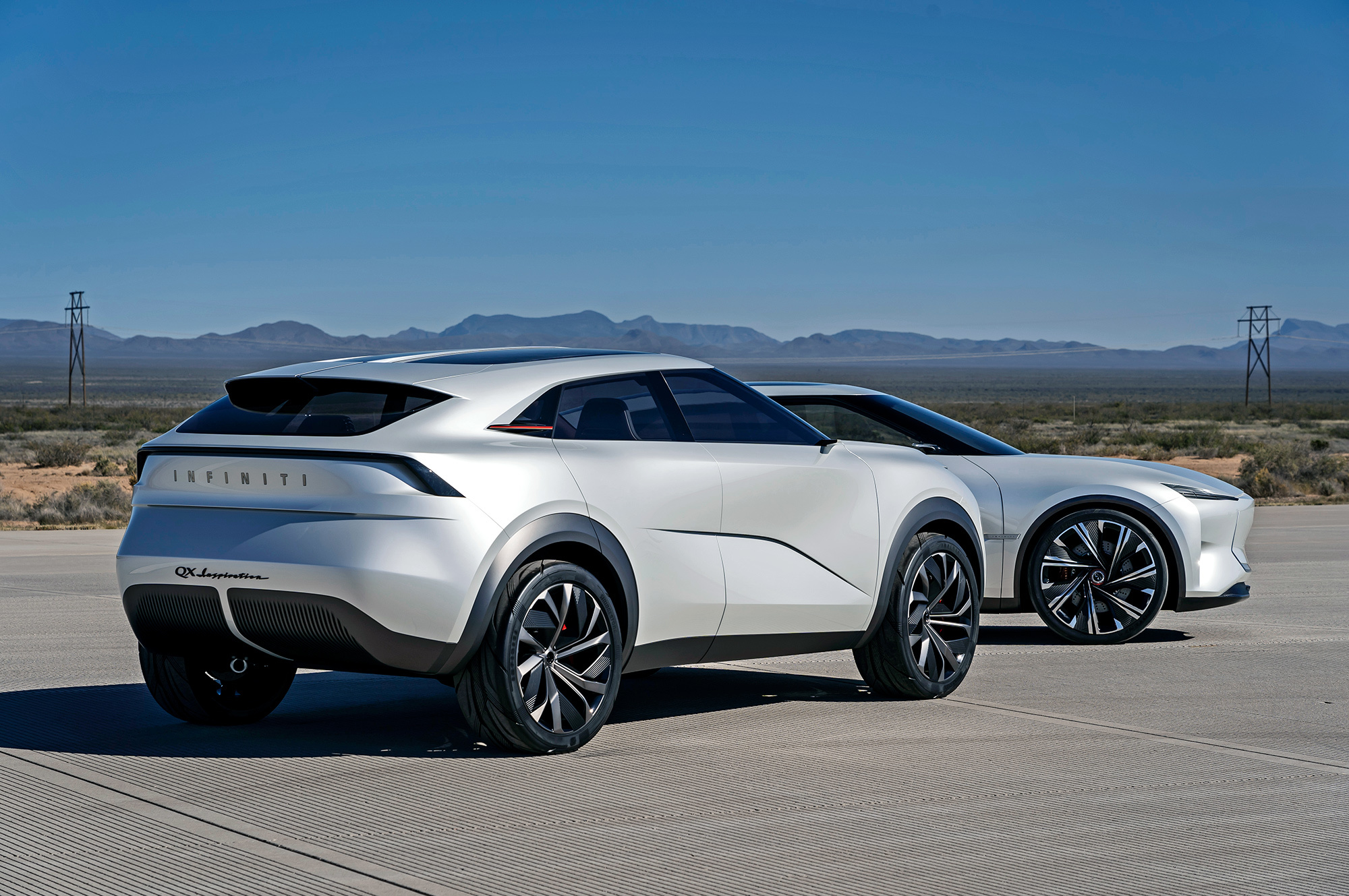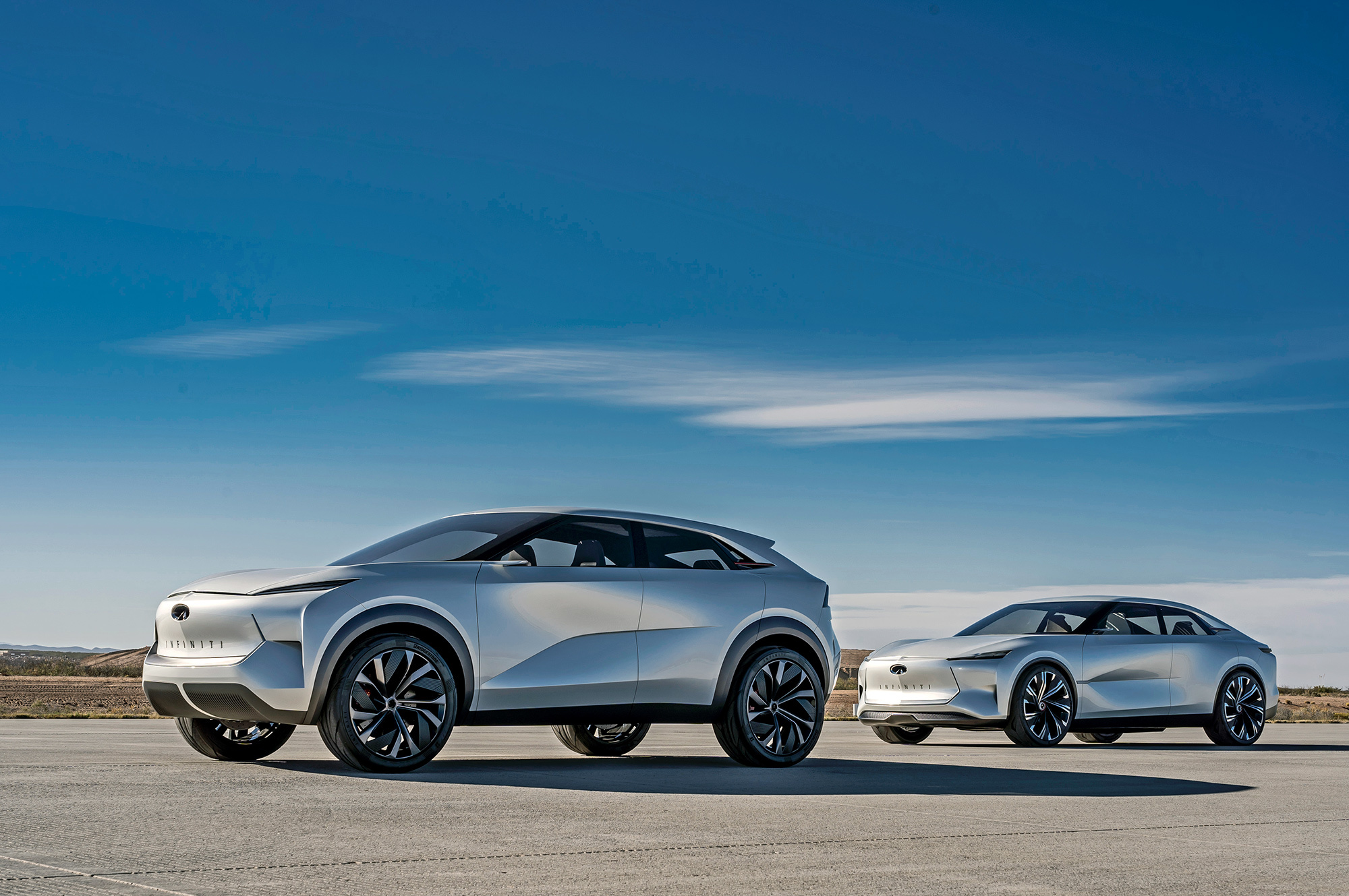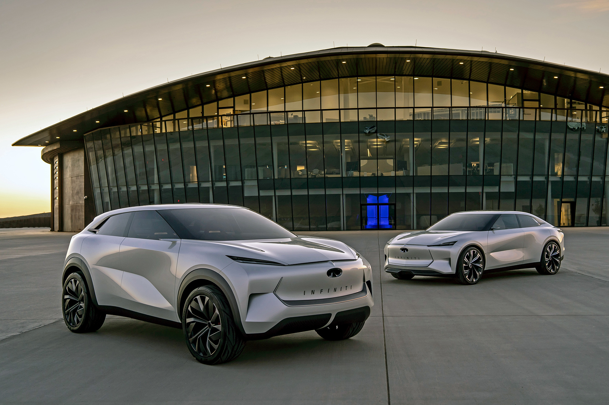 Легковой автомобиль, созданный по мотивам проекта QS Inspiration, будет сравним габаритами с нынешним Q50 и внешне решён аналогично. Однако электрическая батарея у него совсем небольшая. А под капотом — всё тот же бензиновый мотор VC-Turbo в паре с генератором. Только колёса они не приводят — это будет типичный последовательный гибрид. Так же устроен и кроссовер, прототипом которого считается QX Inspiration. Экстерьер представляется мне чем-то средним между концептом и нынешними кроссоверами Volvo: с наклонными, довольно прямыми панелями и вытянутыми по вертикали задними фонарями.