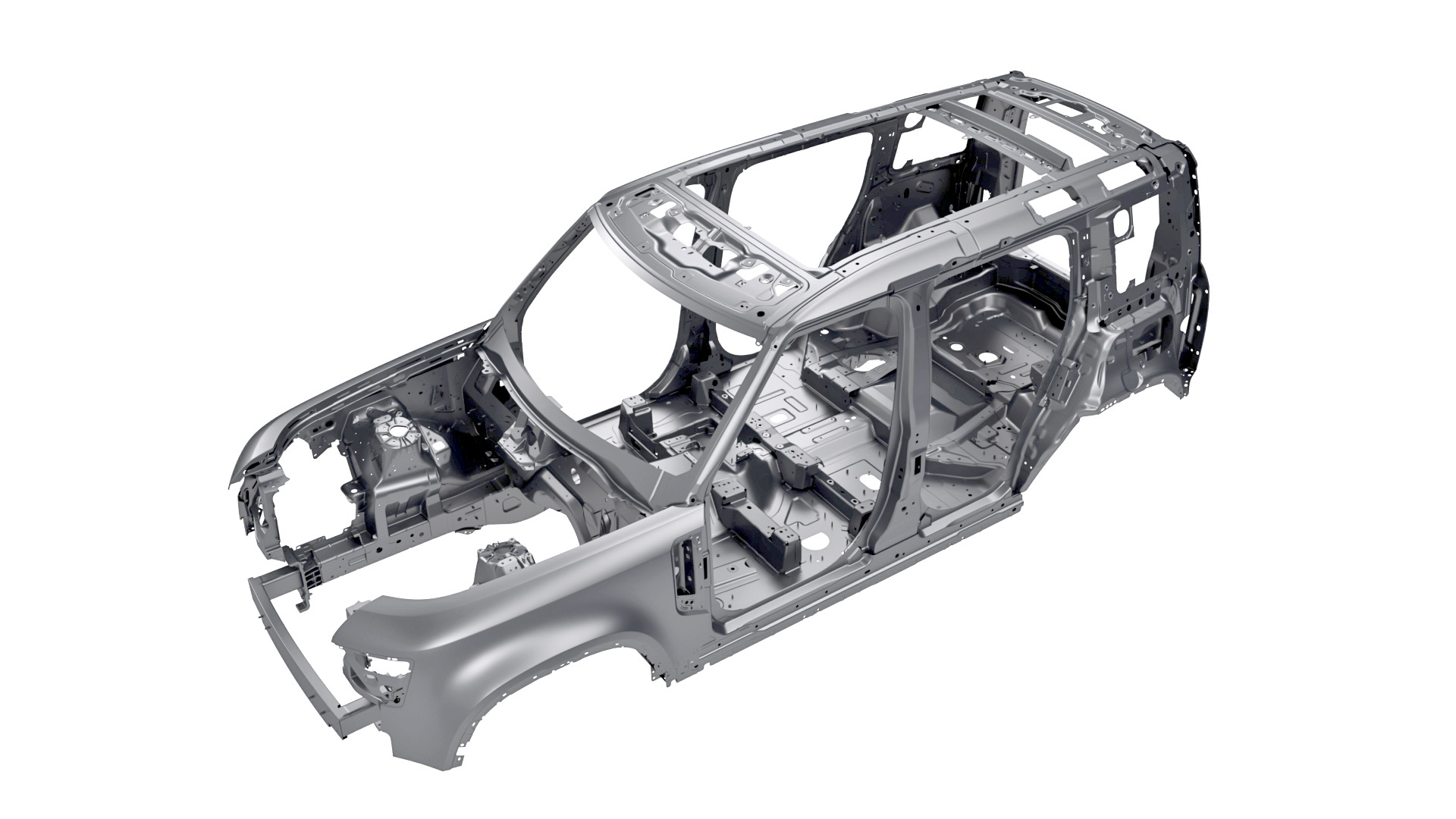 Частично изменена компоновка. Ради внедорожных качеств укорочен передний свес, а пакет радиаторов переехал выше и «глубже» в кузов. Задняя ось смещена на 99 мм назад, что сократило и задний свес. В нём больше не умещается запасное колесо, как на Discovery, ― ещё один плюс для проходимости. Запаска висит на багажной двери, открывающейся вправо, в «неправильную» для правостороннего движения сторону. Багажный проём существенно заужен ради жёсткости кузова. И действительно, жёсткость на кручение достигает 29 000 Н•м/град против 23 000 у Disco. Старый рамный Defender L316 был на порядок податливее, дотягивая лишь до 3000 Н•м/град.