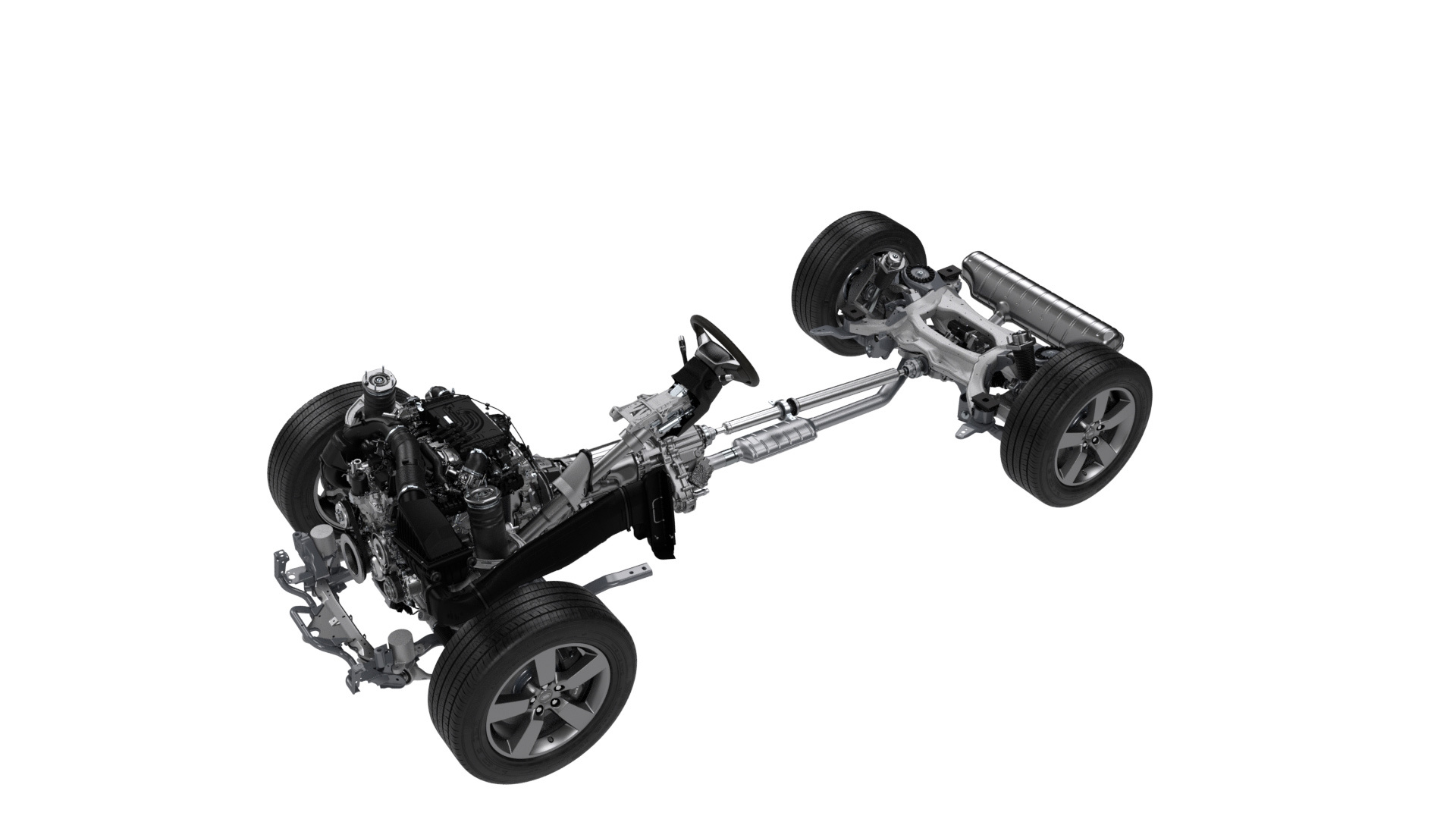 На иллюстрациях подвески напоминают узлы Disco. В действительности кованые стальные подрамники, рычаги и сайлент-блоки усилены. Спереди увеличен диаметр нижних шаровых опор. Если вспомнить автомобили Range Rover, получается уже третья вариация на ту же шассийную тему. Но активные стабилизаторы поперечной устойчивости Дефендеру не положены, как и Discovery. Поэтому с пневмоподвеской артикуляция, то есть возможная разность положений колёс «по диагонали», составляет 500 мм против 680 мм у Рейнджей, способных распускать стабилизаторы.