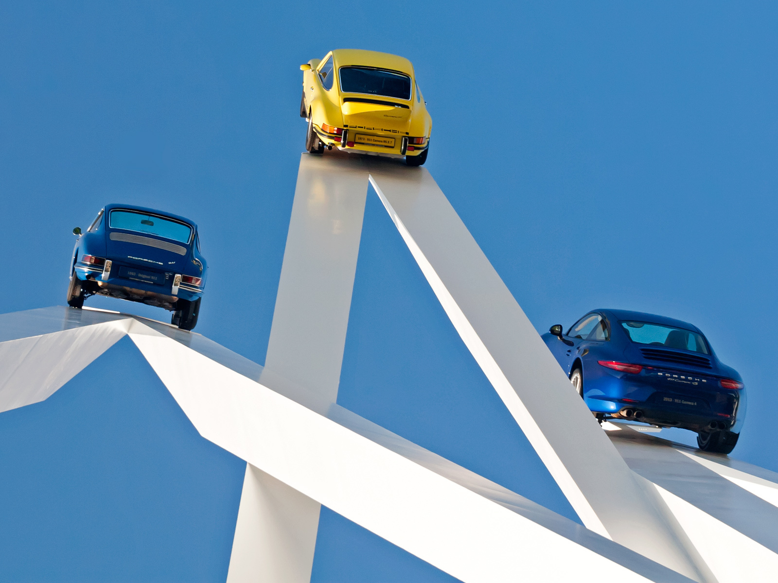 Вот и наш 50-летний именинник — дюжина «девятьсот одиннадцатых» разных лет, серий и типов. Легендарные Porsche 911 принимали участие во всех без исключения Фестивалях скорости в Гудвуде, и марка уже была главной темой FOS в 1998 году. Тогда на центральной скульптуре были подвешены носом вниз четыре автомобиля со слитыми жидкостями, теперь их три, зато они устремлены лицом в небо, взлетают ракетой.