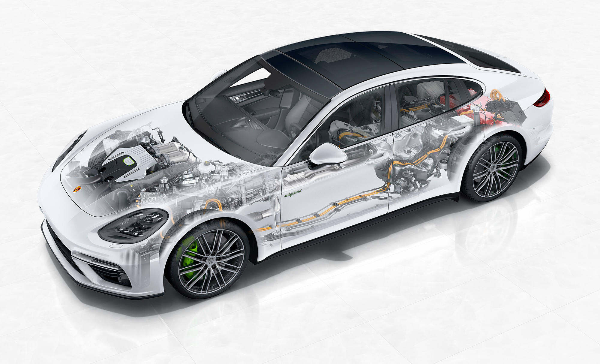 Перед нами не просто ещё одна версия Панамеры, а краеугольный камень программы Porsche 971. Новый хэтчбек, в отличие от предыдущего, изначально спроектирован вокруг гибридной силовой установки. Это, похоже, вообще теперь доктрина Porsche. Архитектура шасси, структура кузова, компоновка узлов и агрегатов разработаны с оглядкой на специфические нужды бензоэлектрических моделей. Так, чтобы толстые и тяжёлые силовые кабели 400-вольтовой системы лежали оптимально, а размещение многочисленных компонентов не вредило балансу.