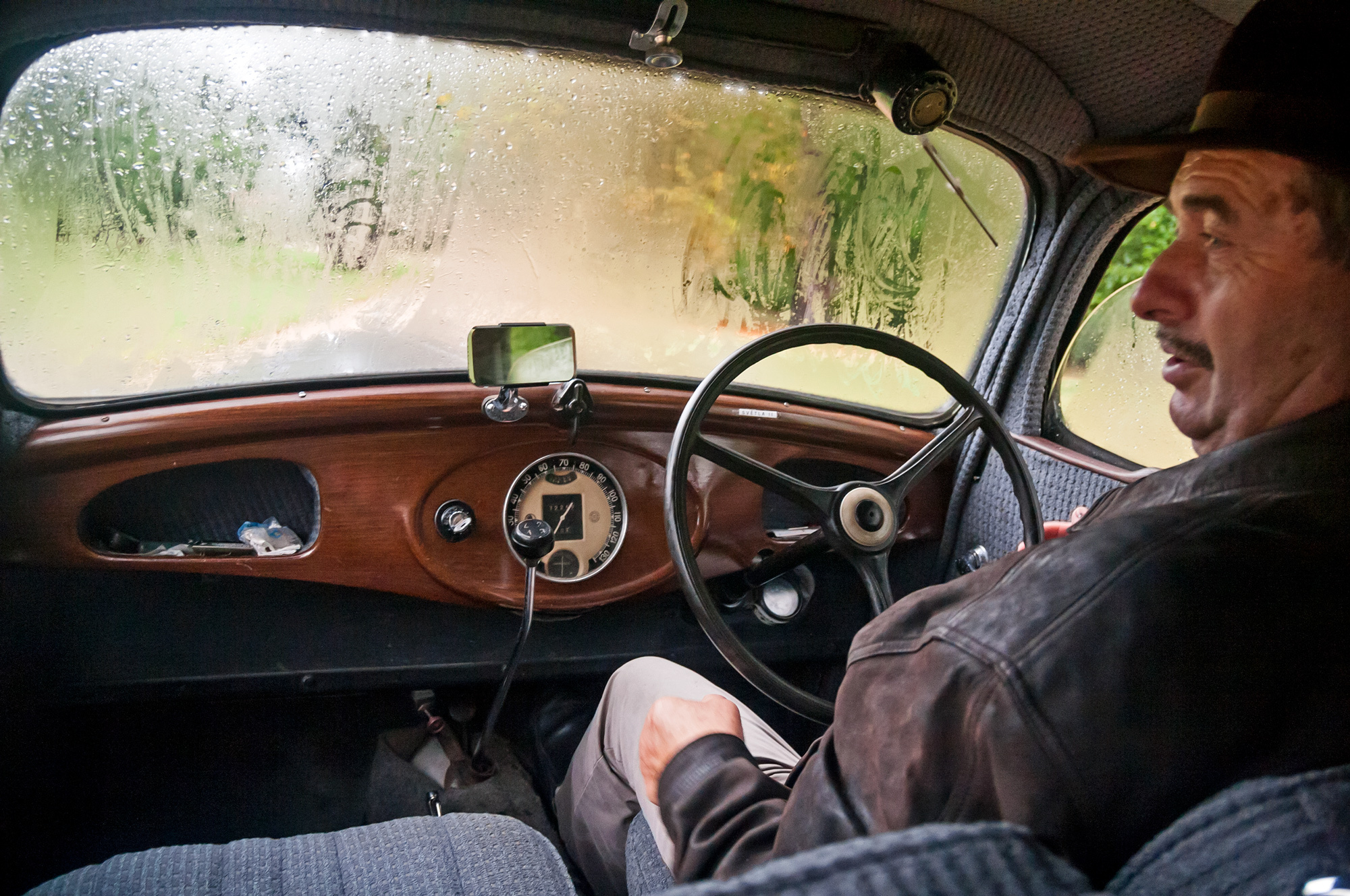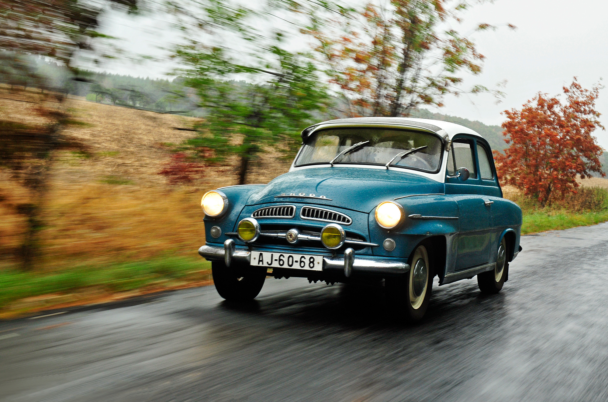 Истязание только началось. Хлещет дождь. Обзорность сквозь запотевшие стёкла стремится к нулю: дворники застыли поперёк лобового (сломаны), круглое боковое зеркальце есть только с водительской стороны. Расчищаю себе амбразуру левой рукой через окно. В повороте едва разъезжаюсь с каким-то расплывчатым седаном. Кстати, ремни безопасности отсутствуют. Зато внешне наша машина симпатичная. Это двухдверка образца 1958 года, называется Skoda 440 Spartak.