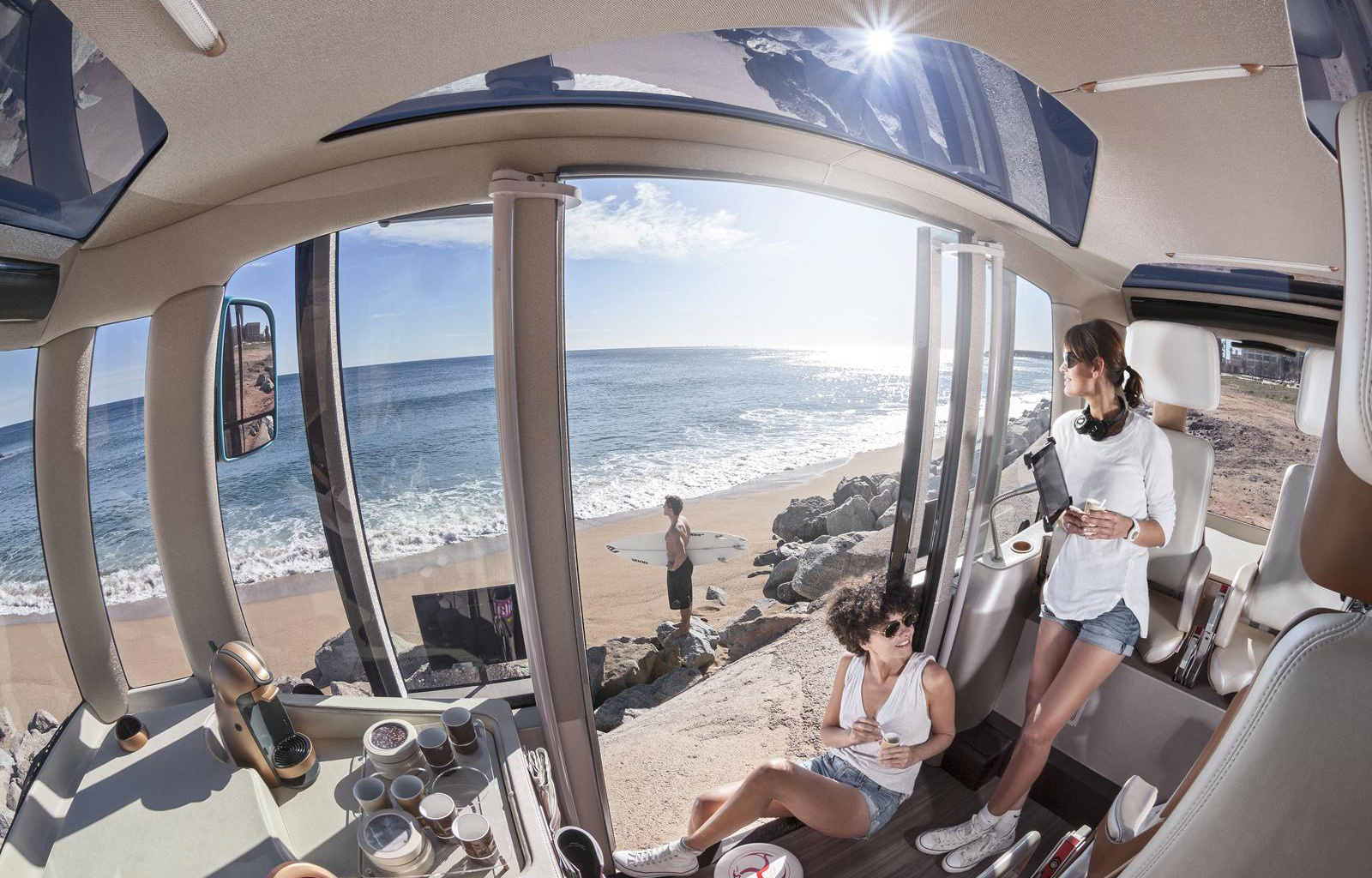 Ни дать ни взять автобус на трёх пассажиров. Автобусный облик, необычная посадка водителя и остальных обитателей, автобусное вертикальное остекление и автобусная же раздвижная двойная дверь по правому борту. Но всё это упаковано в кузов длиной чуть больше 3,7 метра. Таков шоу-кар microMAX, который, по мнению известного швейцарского кузовного ателье, представляет собой ни много ни мало «пересмотр концепции мобильности».