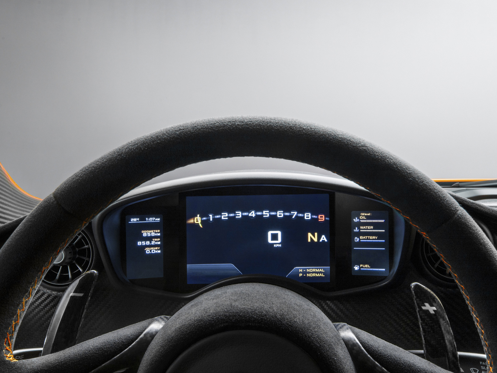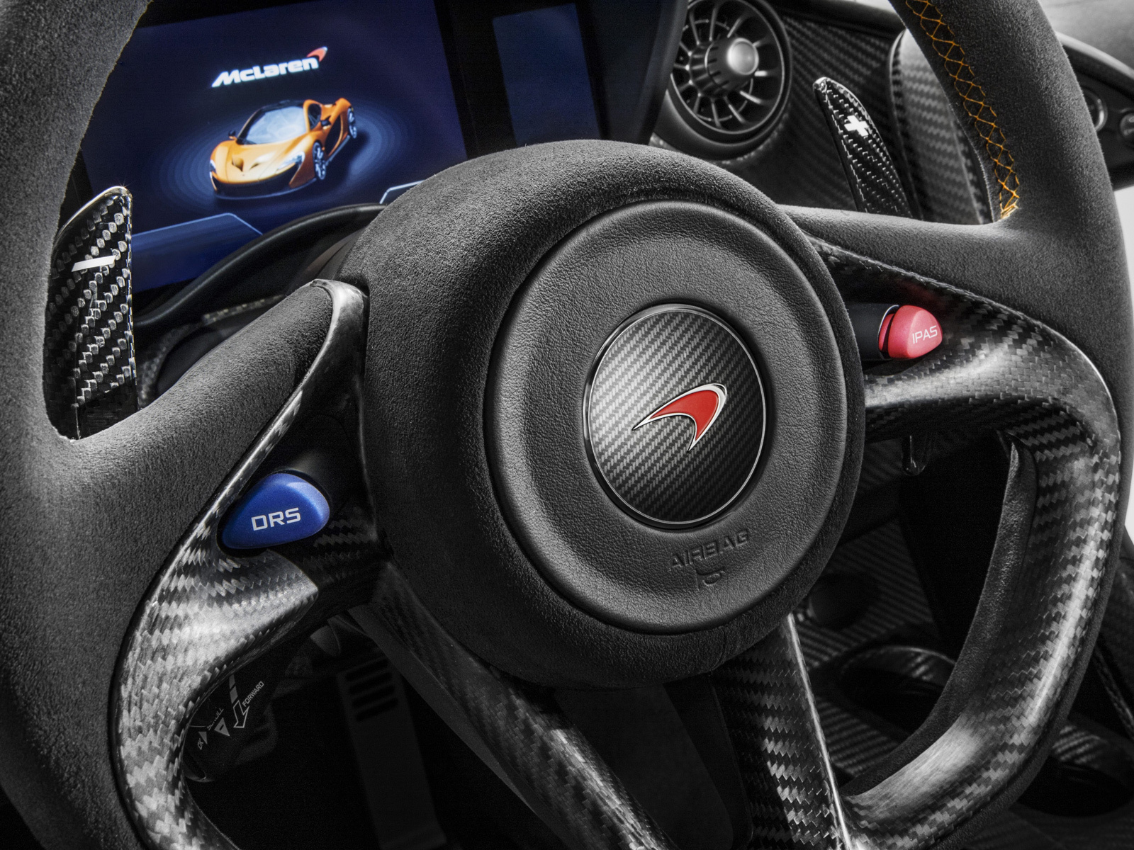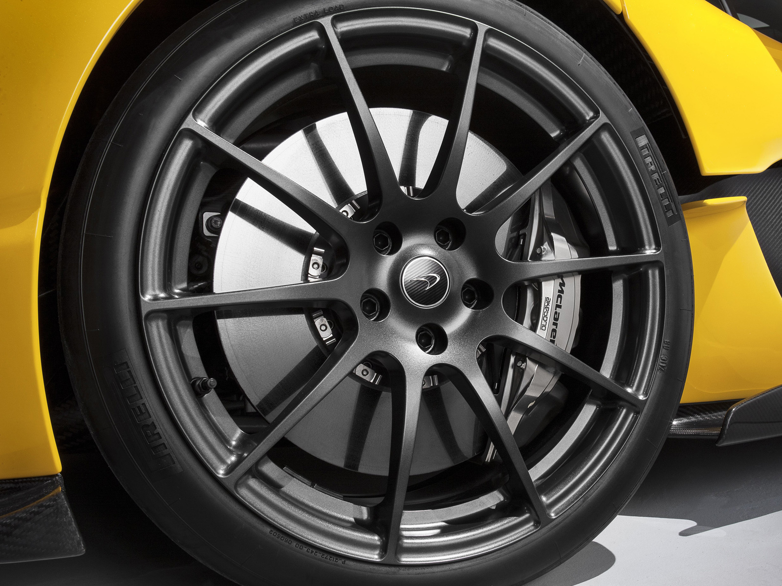 Создатели делают особенный акцент на том, что столь мощный автомобиль потребляет лишь 6,9 л топлива на 100км и выбрасывает в атмосферу меньше 194 г углекислоты за километр в смешанном цикле. Но есть данные и поинтересней этих. Например, с места до 200 км/ч McLaren P1 катапультируется за 6,8 секунд, а с нуля до 300 км/ч - за 16,5 с. И вот тут ты понимаешь, почему к тормозам англичане отнеслись с таким вниманием. Эта карбонокерамика - плод совместной работы специалистов Макларена и их партнёра по Формуле-1 японской фирмы Akebono. Для полной остановки со скорости 100 км/ч автомобилю требуется всего 30,2 метра. И шины на гиперкаре стоят особенные - это покрышки Pirelli P Zero Corsa, разработанные специально для модели McLaren P1.