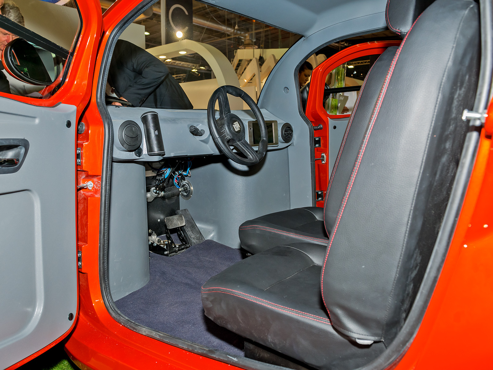 Чем дольше рассматриваешь машину, тем сильнее атмосфера самоделки-на-коленке: дутый кузов из стекловолокна, руль, две педали, одно кресло — дверей, как и у Renault Twizy, в базовой версии нет. Но есть хай-тек: во встроенном в переднюю панель планшете Nexus 7 — собственное программное обеспечение компании Eon Motors. Ткнул в экран — затянул ручник, ещё ткнул — включил Drive. Сюда же «зашиты» электрозеркала, функция некоего «турбобуста» и даже камера заднего вида.