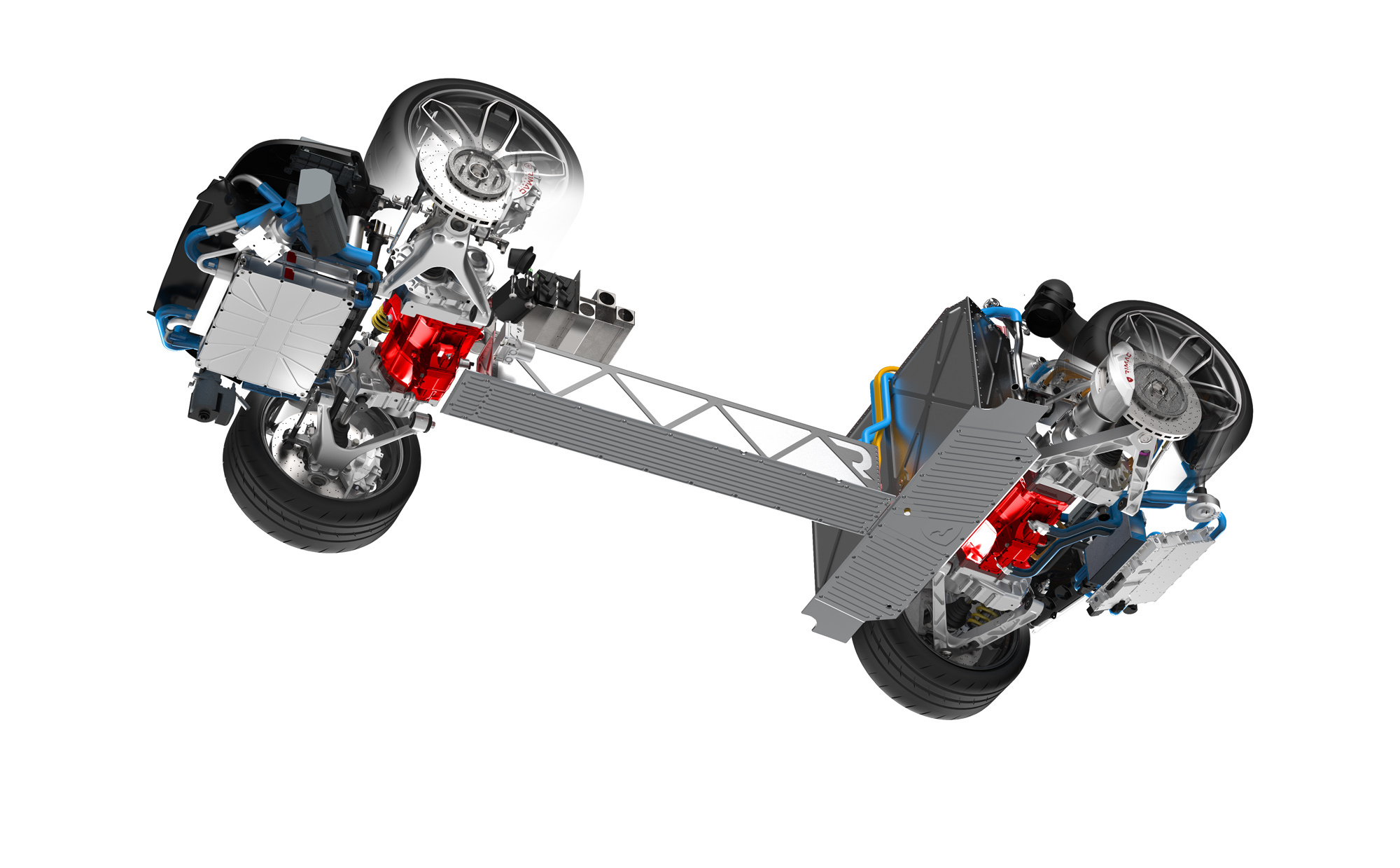 Concept_One приводят в движение четыре электродвигателя с постоянными магнитами. Эти моторы расположены в центре обеих осей, имеют собственные коробки передач. Спереди установлены односкоростные редукторы, а вот сзади стоят двухступенчатые «роботы» с двумя сцеплениями, что уникально для машины такого плана. Трансмиссия связана с системой векторизации тяги R-AWTV (о ней снято видео) с четырьмя режимами: comfort, control, track и drift. Рекуперацию энергии торможения, собирающую 400 кВт, можно отключить. Останавливают гиперкар углеродокерамические тормоза с шести- (спереди) и четырёхпоршневыми суппортами. Диаметр вентилируемых дисков — 390 и 380 мм.