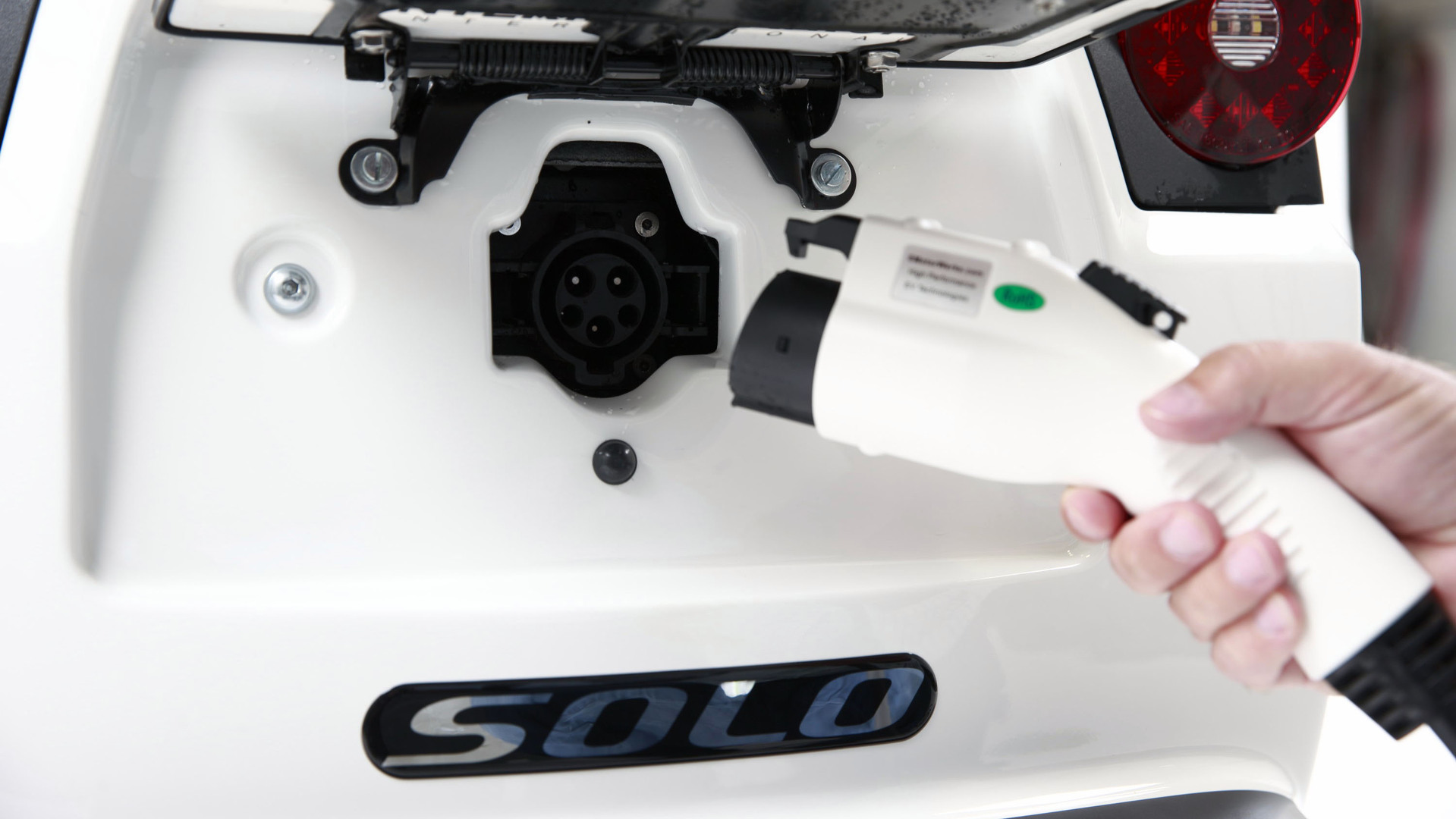 Канадская компания Electra Meccanica сегодня впервые показала конвейерную версию одноместного трёхколёсного электромобильчика Solo (ранее демонстрировались компьютерные рисунки да прототип без кузовных панелей). По сравнению с опытным образцом некоторые характеристики изменились. Отдача мотора, раскручивающего заднее колесо, осталась на прежнем уровне (82 л.с., 190 Н•м), ёмкость литиево-ионной батареи увеличилась почти вдвое (до 16,1 кВт•ч), максимальная скорость выросла (теперь 130 км/ч), разгон до сотни без сюрпризов — за 8,0 с. Кроме того, Solo стал длиннее на 457 мм. Разработчики уверены, что эти показатели позволят их детищу стать по-настоящему массовым.