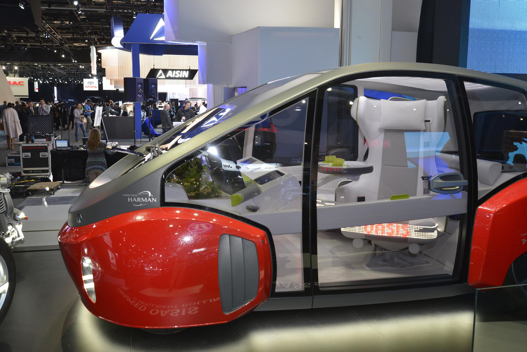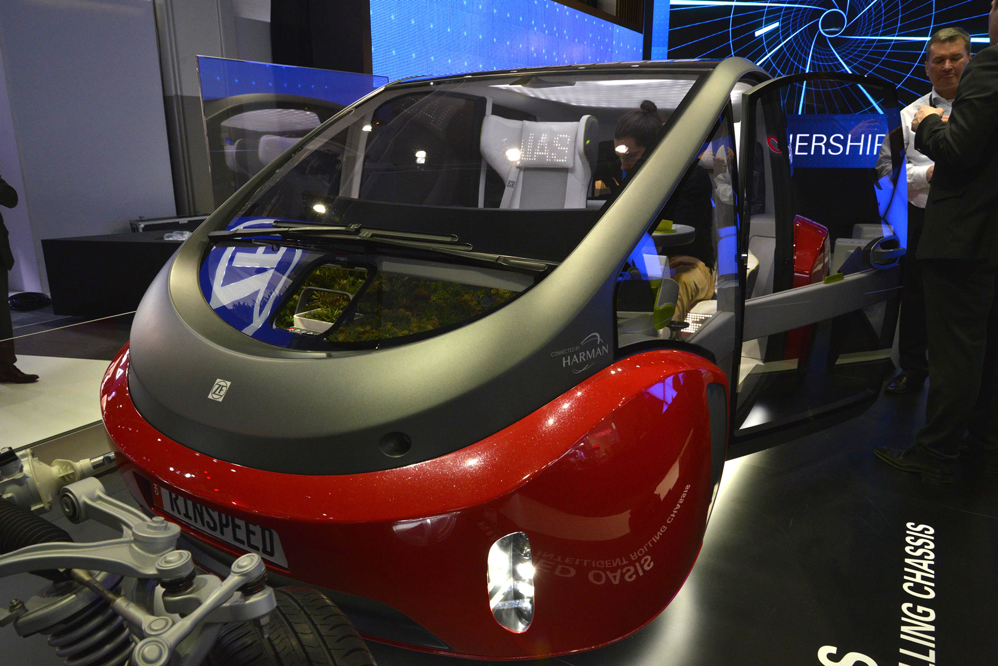 Эксцентричная фирма Rinspeed изготовила «в металле» концепт Oasis, ранее показанный на рисунках. Это двухместный электромобиль со способностями к автономному движению. Технические характеристики машины её создатели не приводят, кажется, специально. Обывателю ведь всё равно, сколько лошадиных сил у маршрутки, какое время у поезда метро занимает разгон до сотни или что за батарея стоит в троллейбусе. Пассажирам «беспилотника по вызову» в дороге нужны развлечения, и в Оазисе с этим полный порядок. Возможность порулить, впрочем, сохраняется, поэтому данные о силовом агрегате всё-таки ждём.