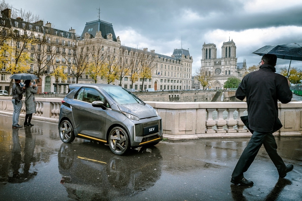 Китайский стартап CHJ Automotive представил свою первую модель — электрический сити-кар SEV. По длине он сопоставим с хэтчем Smart Fortwo, а по ширине — с мотоциклом, поскольку пассажир сидит за спиной водителя. Максимальная скорость составляет 45 км/ч, заряда аккумуляторов должно хватать на 100 км пробега. Батарея весит всего 10 кг, её легко снять и отнести к розетке. Машинка изначально создавалась для сдачи в краткосрочную аренду туристам (на манер велопроката) по всему миру. Речь идёт о поездках на расстояние не больше 20 км.
