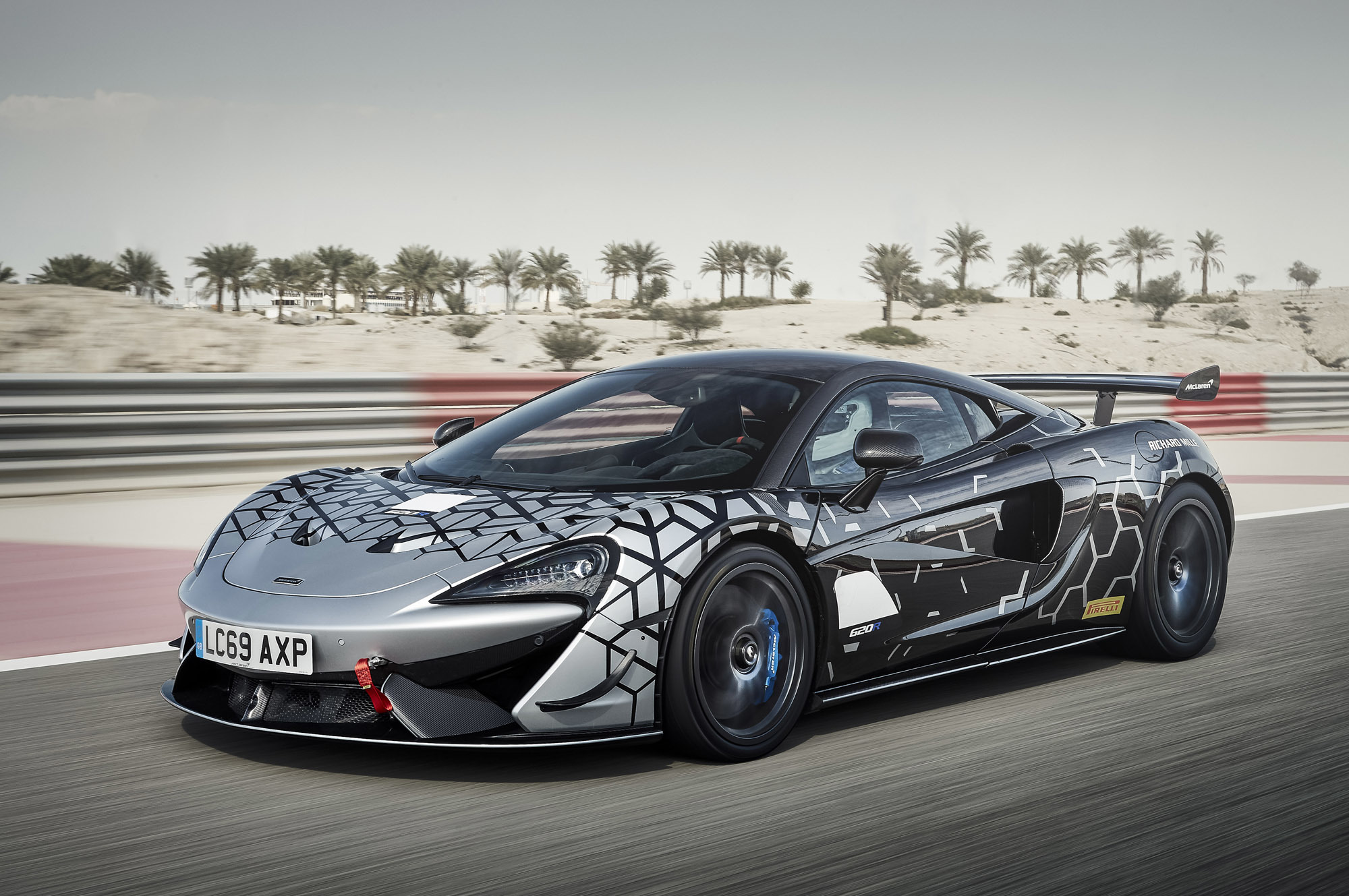 Зато на 620R ставятся те же облегчённые настраиваемые амортизаторы (32 положения на сжатие и отбой), что используются в спорте. Верхние опоры стоек выполнены из нержавеющей стали и лишены эластичных элементов. А вот алюминиевые рычаги и стабилизаторы поперечной устойчивости унифицированы с другими машинами спортсерии. Сухая масса Макларена 620R составляет всего 1282 кг, он на 35 кг тяжелее «шестисотого». На колёсах с центральной гайкой смонтированы полуслики Pirelli P Zero Trofeo R 225/35 R19 спереди и 285/35 R20 сзади. По желанию заказчика их заменят сликами той же марки.