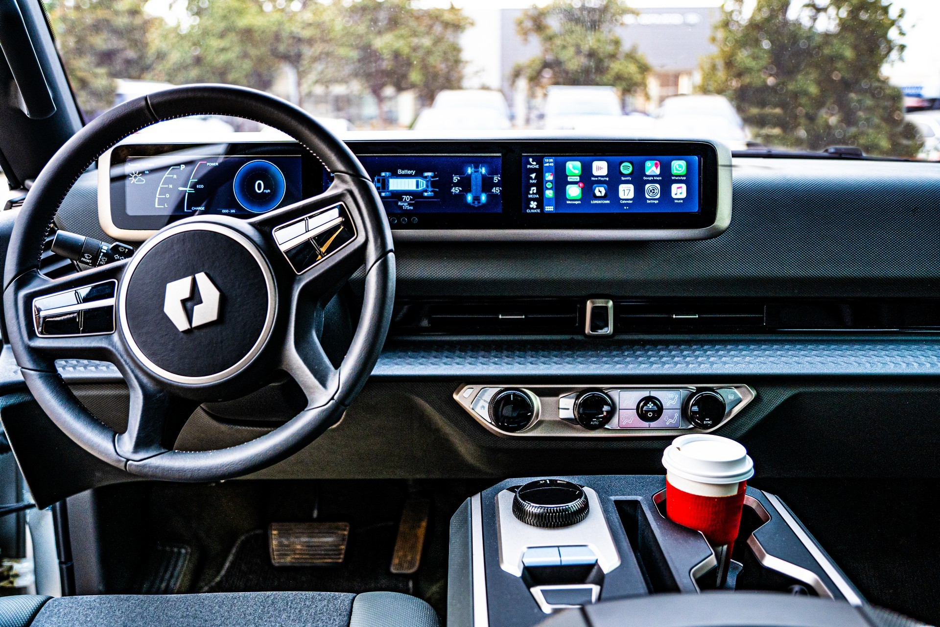 Теперь можно взглянуть на фотографии предсерийного салона с поручнями на передних стойках. Никаким премиумом здесь и не пахнет. Главная новость — в цифровом кластере оказалось не два, а три одинаковых дисплея (вероятно, по 10 дюймов каждый). Один выполняет функции приборки, второй выдаёт информацию о состоянии батареи и распределении тяги на колёсах, третий подключён к медиацентру с поддержкой Apple CarPlay.