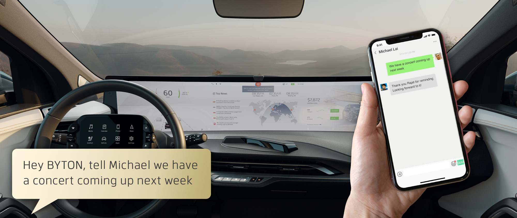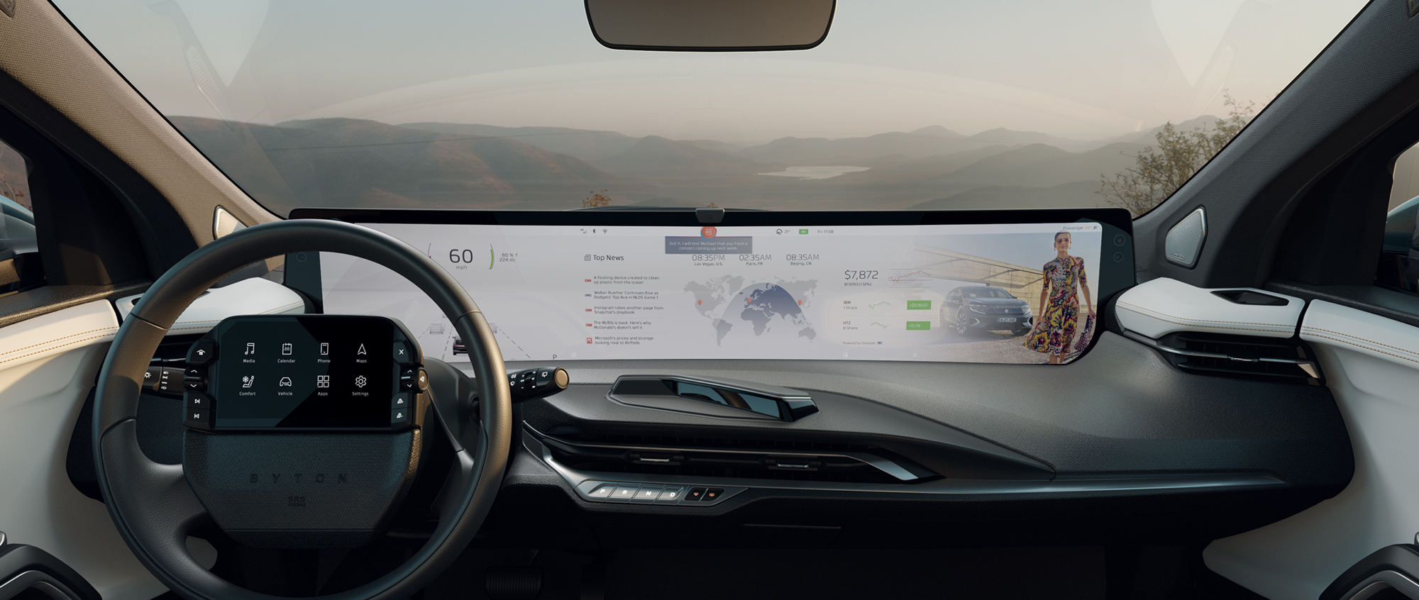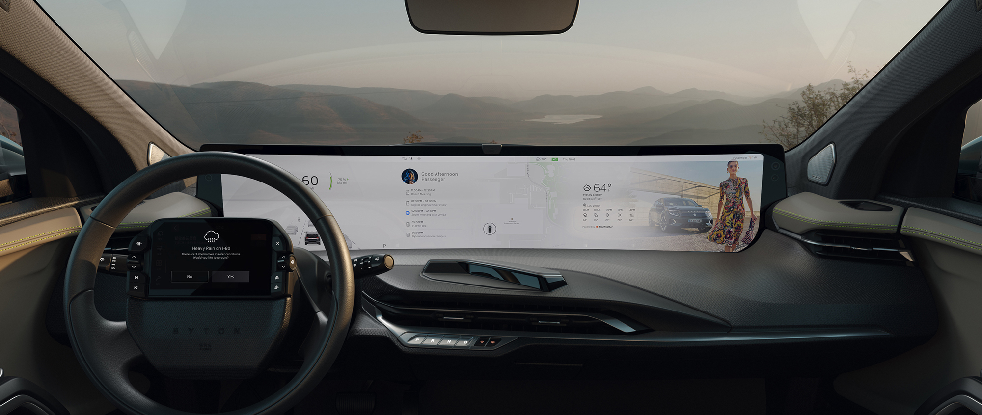 Марка Byton привезла на шоу CES в Лас-Вегасе не новую машину, а новый софт. Даже не один. Помогли компании ViacomCBS и Access (кинотеатр в машине), AccuWeather (обновление карты погоды в реальном времени), Aiqudo (голосовое управление приложениями), CloudCar (облачная инфраструктура с доступом к разным информационным и развлекательным сервисам), Xperi (цифровое HD-радио). Один из новых компаньонов Байтона — стартап с российскими корнями Road.Travel. Его команда — полностью отечественная, хотя сотрудники ныне располагаются в четырёх странах.