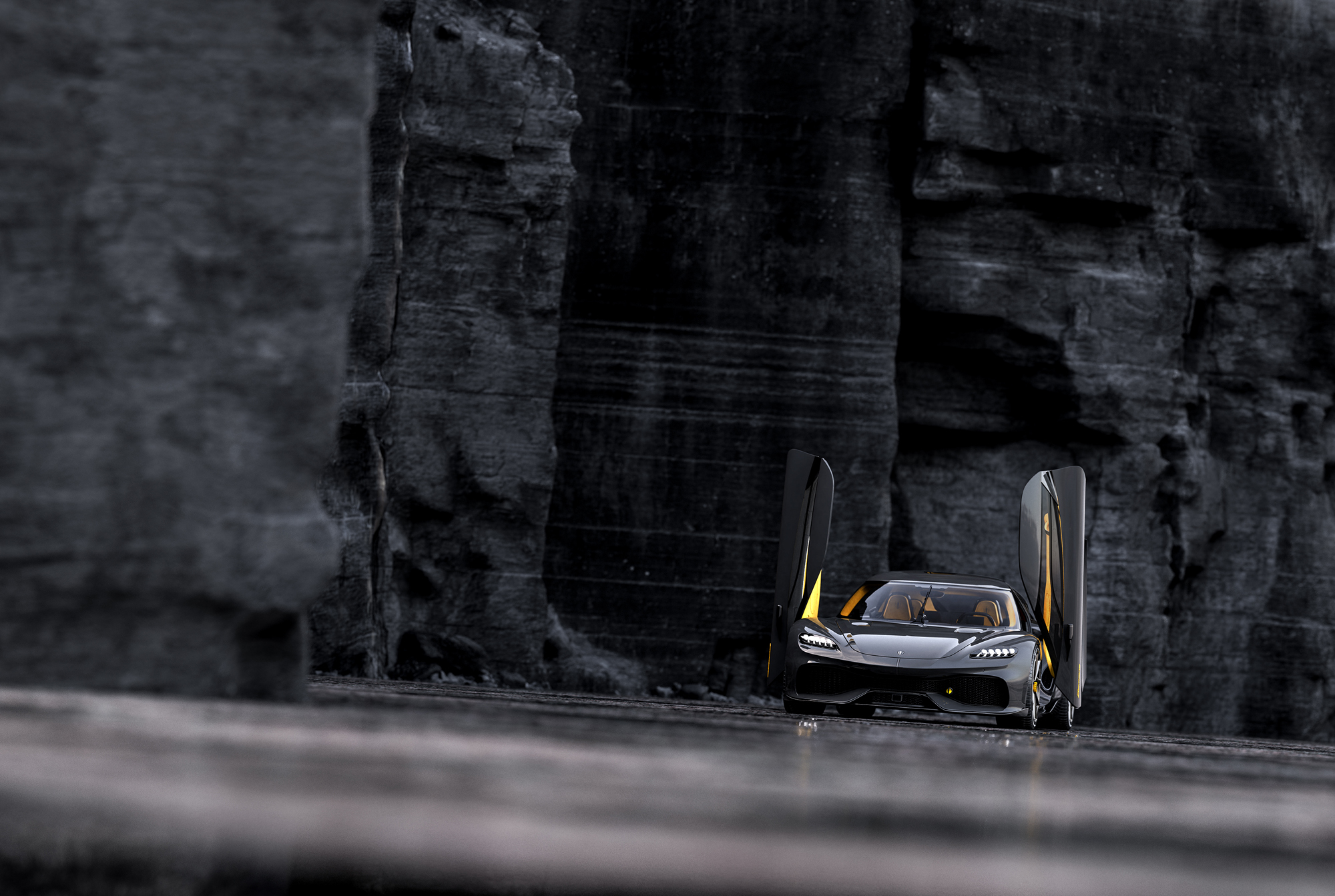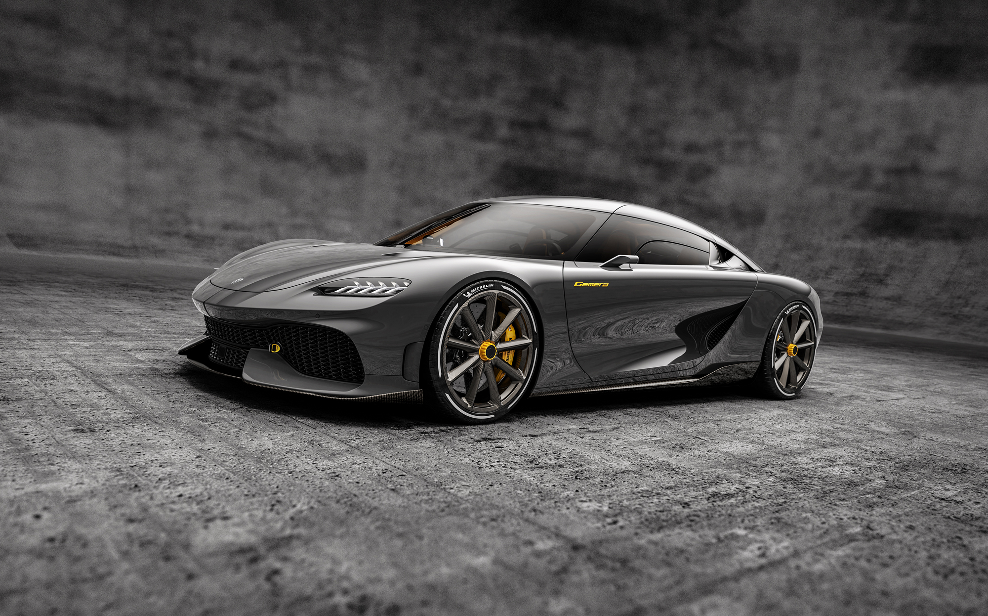 В модели Koenigsegg Gemera необычно практически всё. Это первый четырёхместный Koenigsegg и первый автомобиль, который сама компания относит к категории Mega-GT (гран-туризмо мощнее мегаватта). Это гибрид, в котором задние колёса приводятся парой электромоторов. А многотопливная битурботройка 2.0 с системой газораспределения без распредвалов и с форсировкой более 300 сил на литр объёма, дополненная третьим электромотором, — приводит переднюю ось, хотя сама установлена сзади. Всё это напоминает систему Koenigsegg Direct Drive у Регеры (без перемены передач на пути от ДВС к колёсам), но только перевёрнутую.