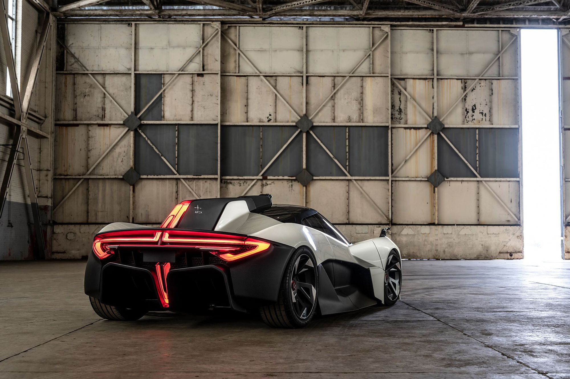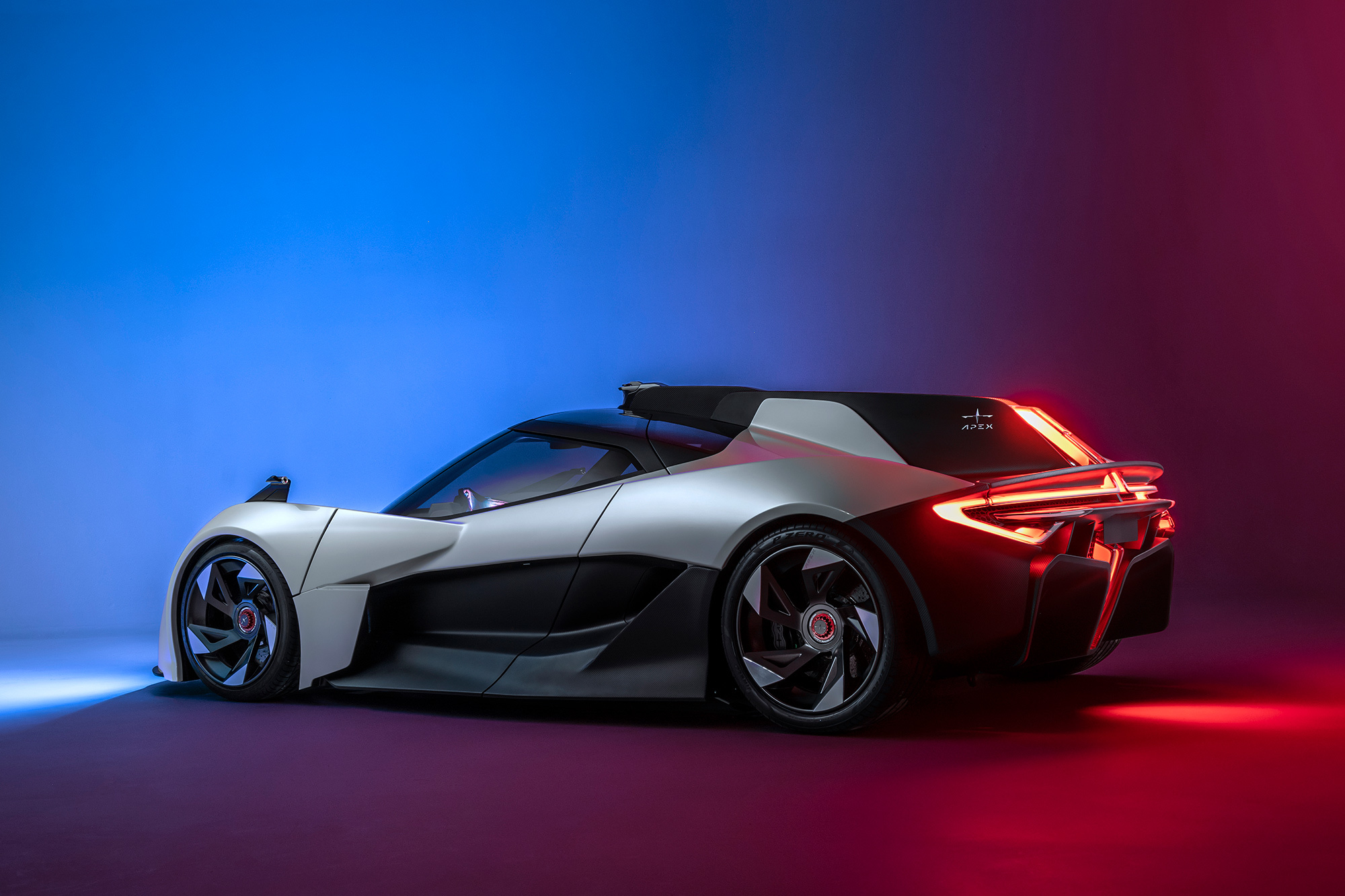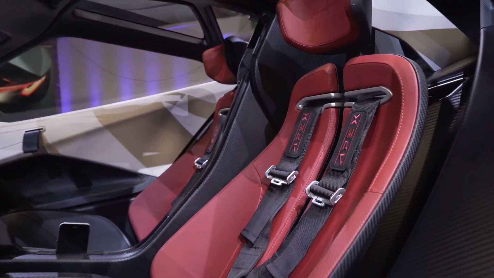 Инженерией купе занимались в Великобритании: вероятно, на Апекс работают бывшие специалисты Элементала. Монокок и модульные подрамники в основе — из углепластика. В шасси также использовали алюминий. Подвеска с толкателями умеет сама менять клиренс гиперкара, но производитель даёт лишь одно значение — 95 мм. Бонусом в управлении служит небольшая масса (1200 кг), при этом почти половина (550 кг) сосредоточена в гладком днище. Там размещена литиево-ионная батарея ёмкостью 90 кВт•ч. Она обеспечивает запас хода 515 км по стандарту WLTP и питает электромотор на задней оси отдачей 568 л.с. и 580 Н•м.