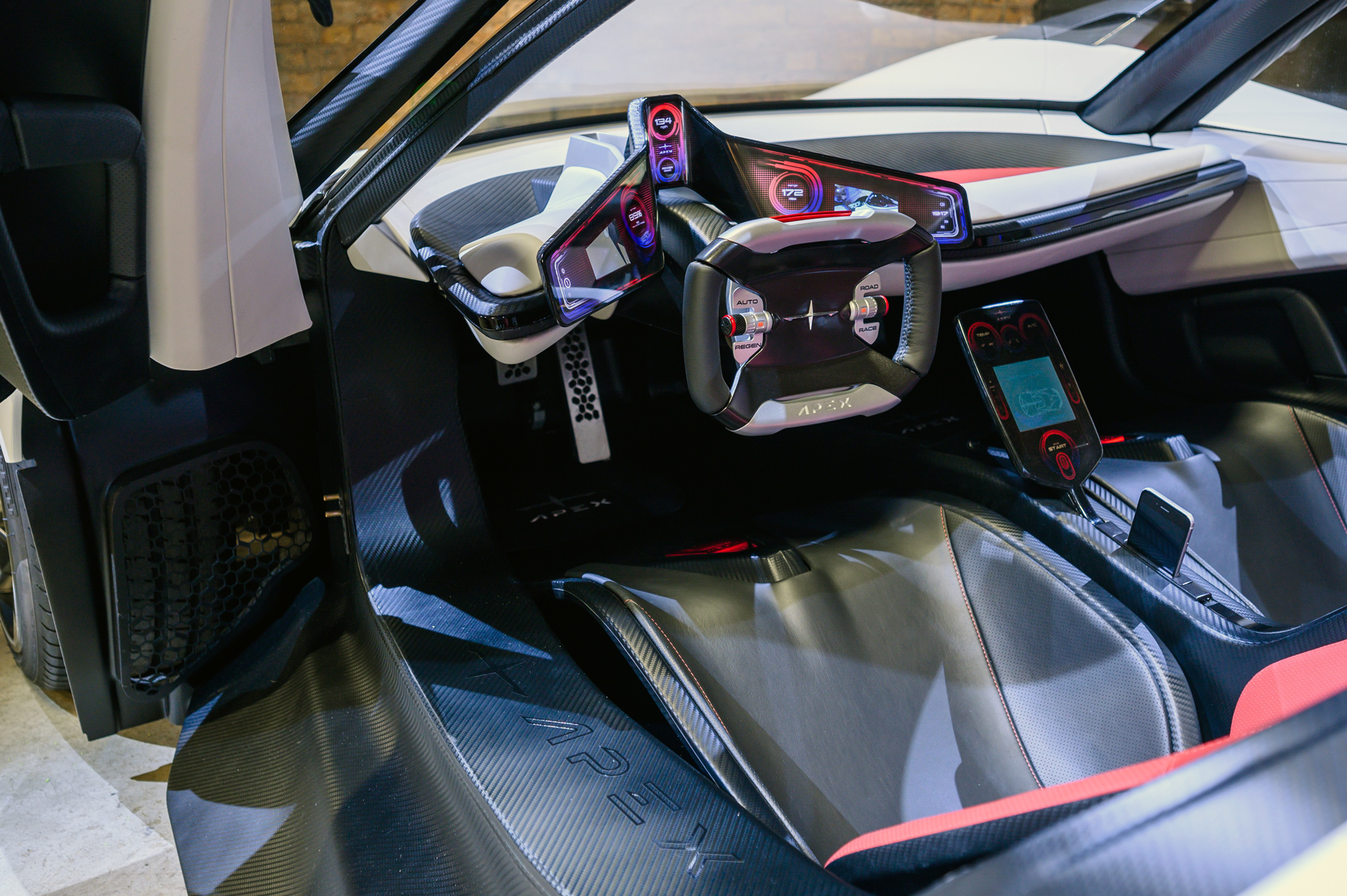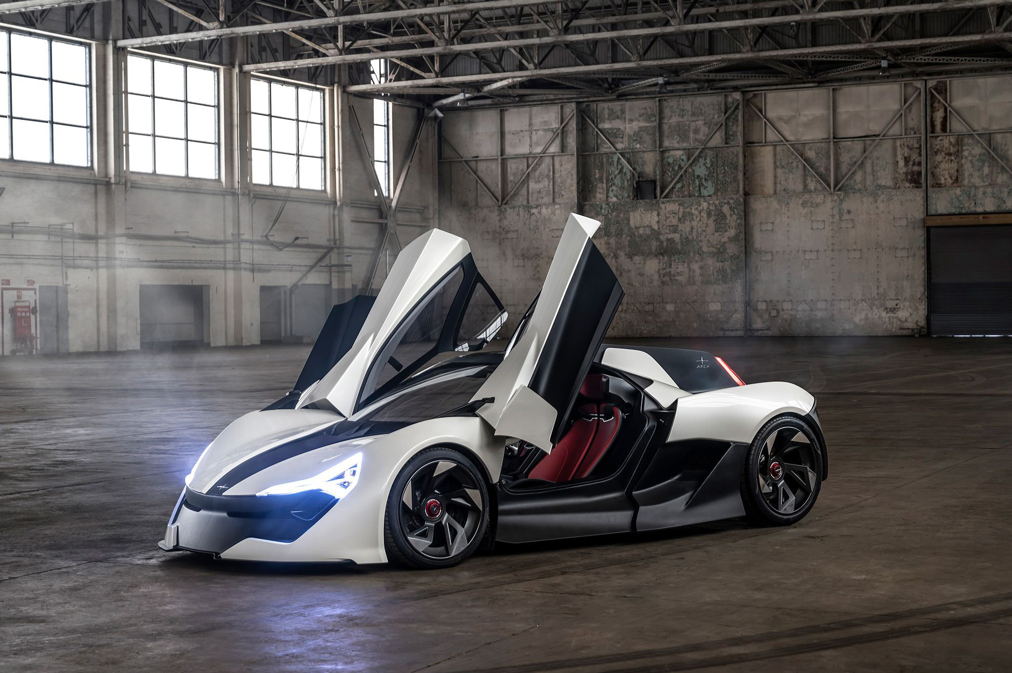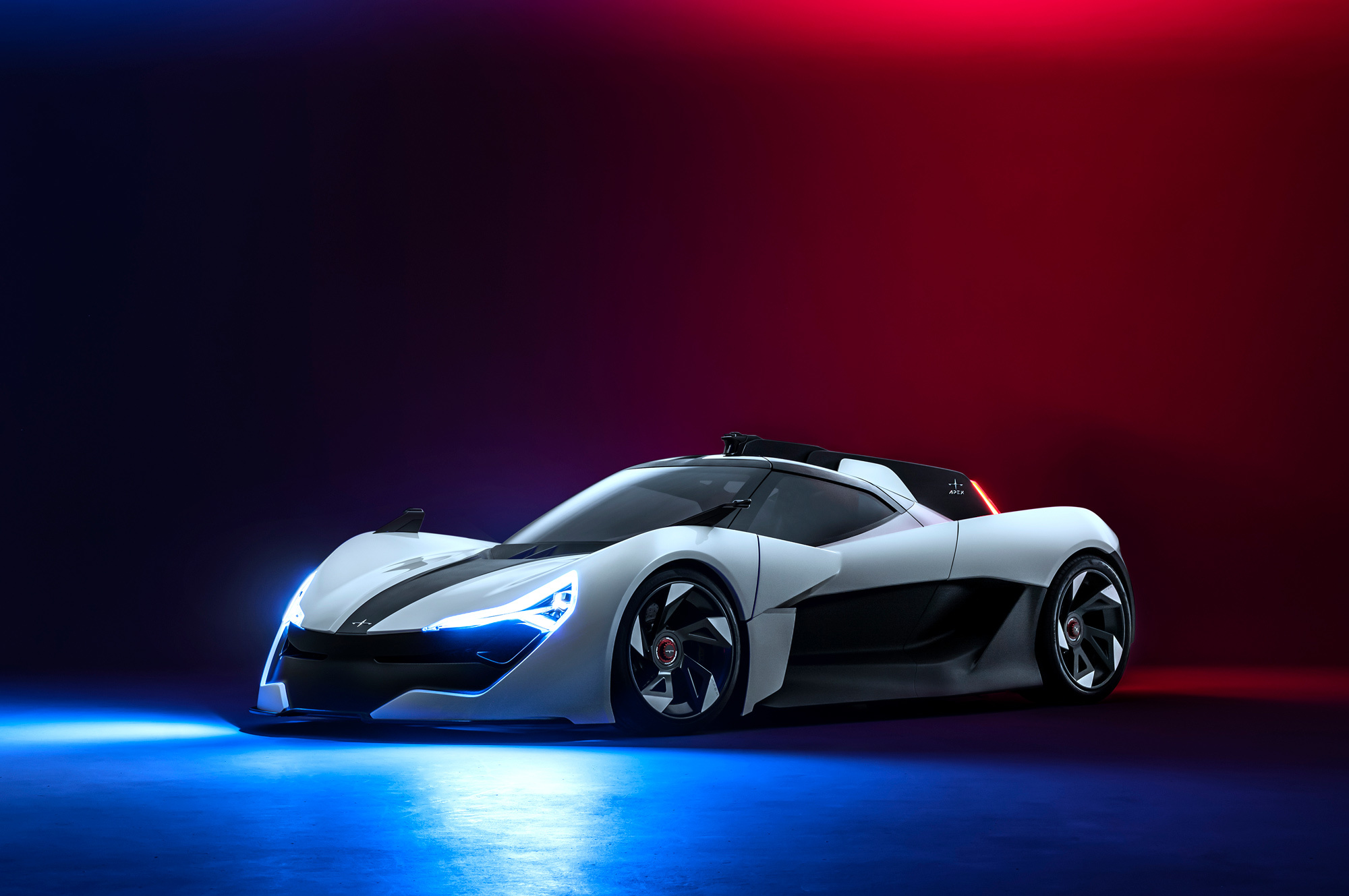Инженерией купе занимались в Великобритании: вероятно, на Апекс работают бывшие специалисты Элементала. Монокок и модульные подрамники в основе — из углепластика. В шасси также использовали алюминий. Подвеска с толкателями умеет сама менять клиренс гиперкара, но производитель даёт лишь одно значение — 95 мм. Бонусом в управлении служит небольшая масса (1200 кг), при этом почти половина (550 кг) сосредоточена в гладком днище. Там размещена литиево-ионная батарея ёмкостью 90 кВт•ч. Она обеспечивает запас хода 515 км по стандарту WLTP и питает электромотор на задней оси отдачей 568 л.с. и 580 Н•м.