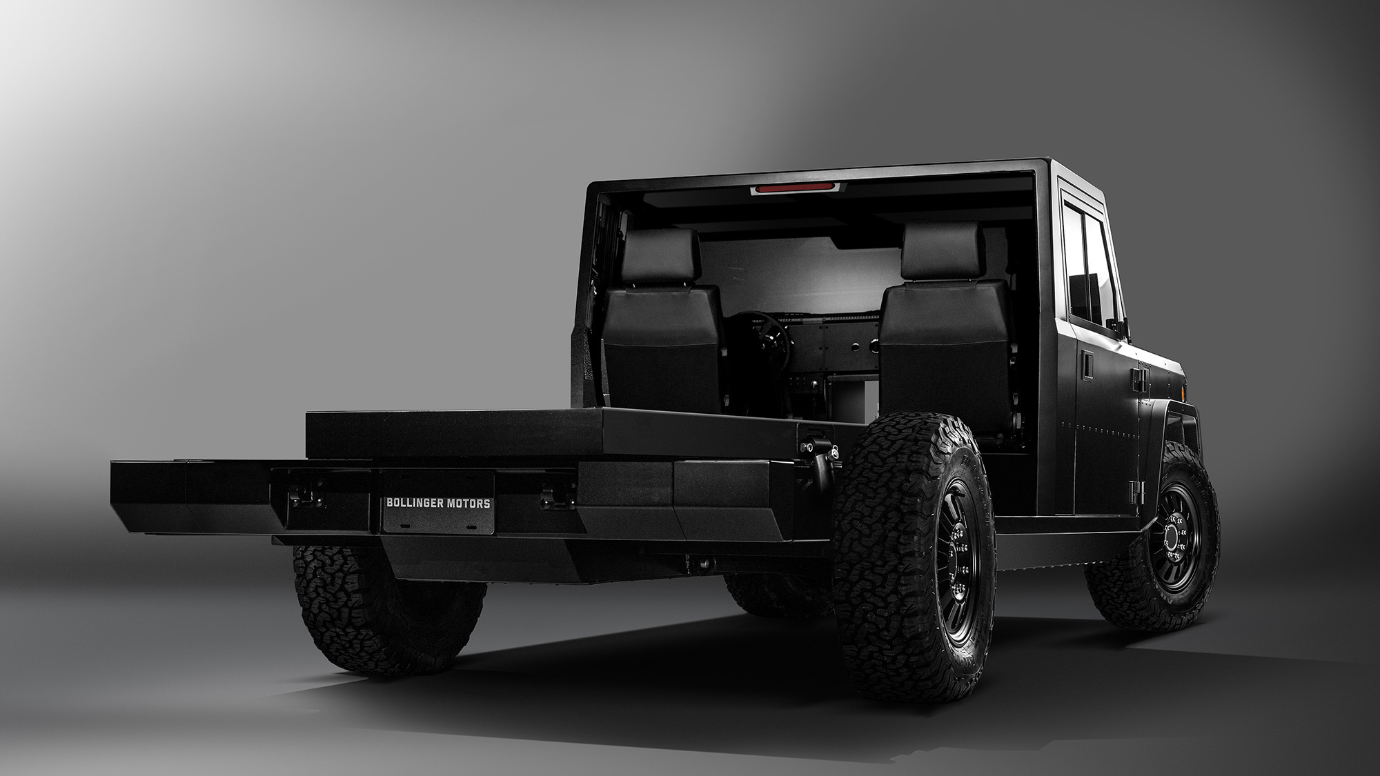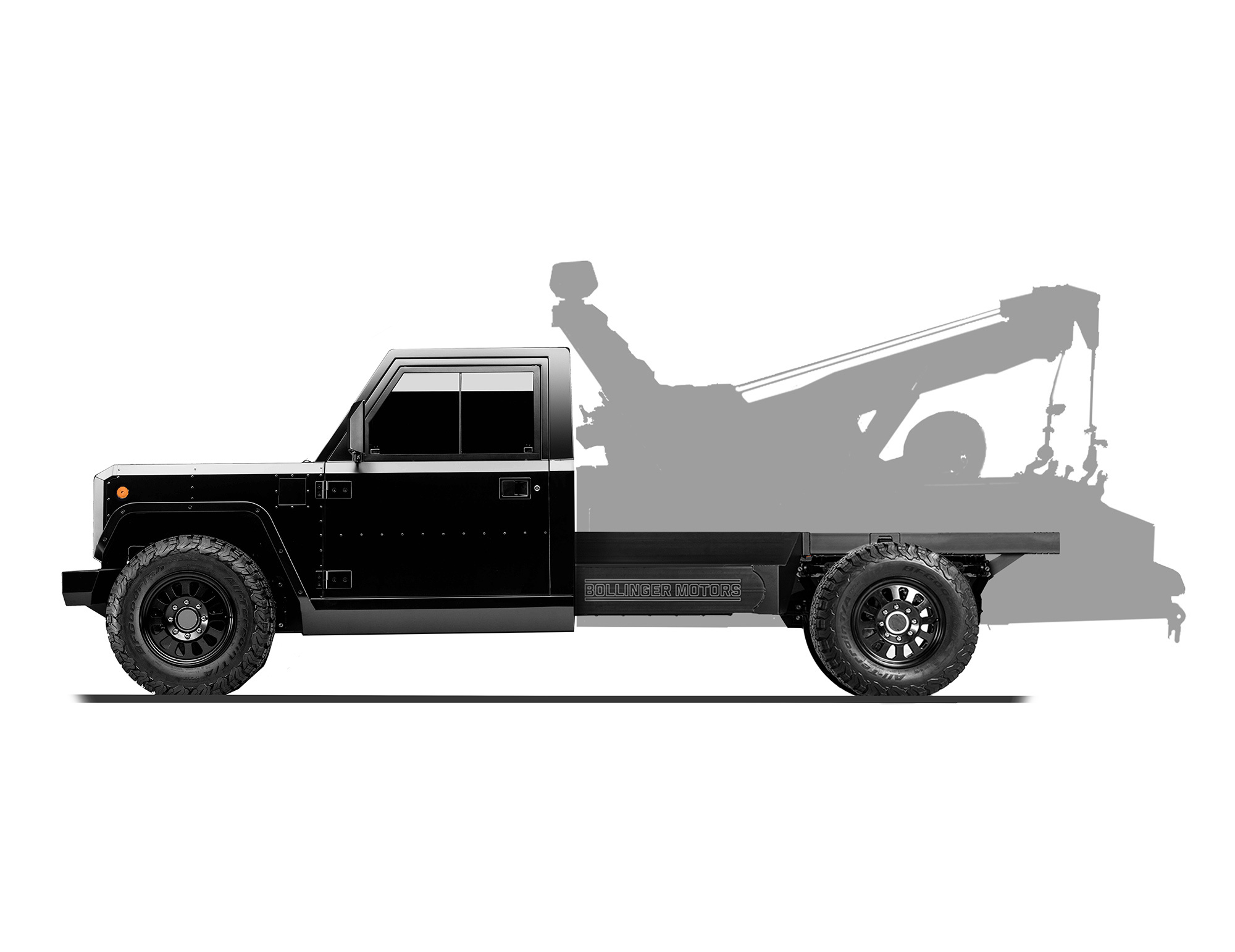 Решив продавать платформу E-Chassis отдельно от своих моделей B1 и B2, фирма Bollinger Motors не остановилась и сделала следующий шаг. Она будет предлагать Chassis Cab — «первое и единственное в мире» электрическое шасси с двух- и четырёхдверной кабиной для грузовых машин третьего класса (полной массой 4536–6350 кг).