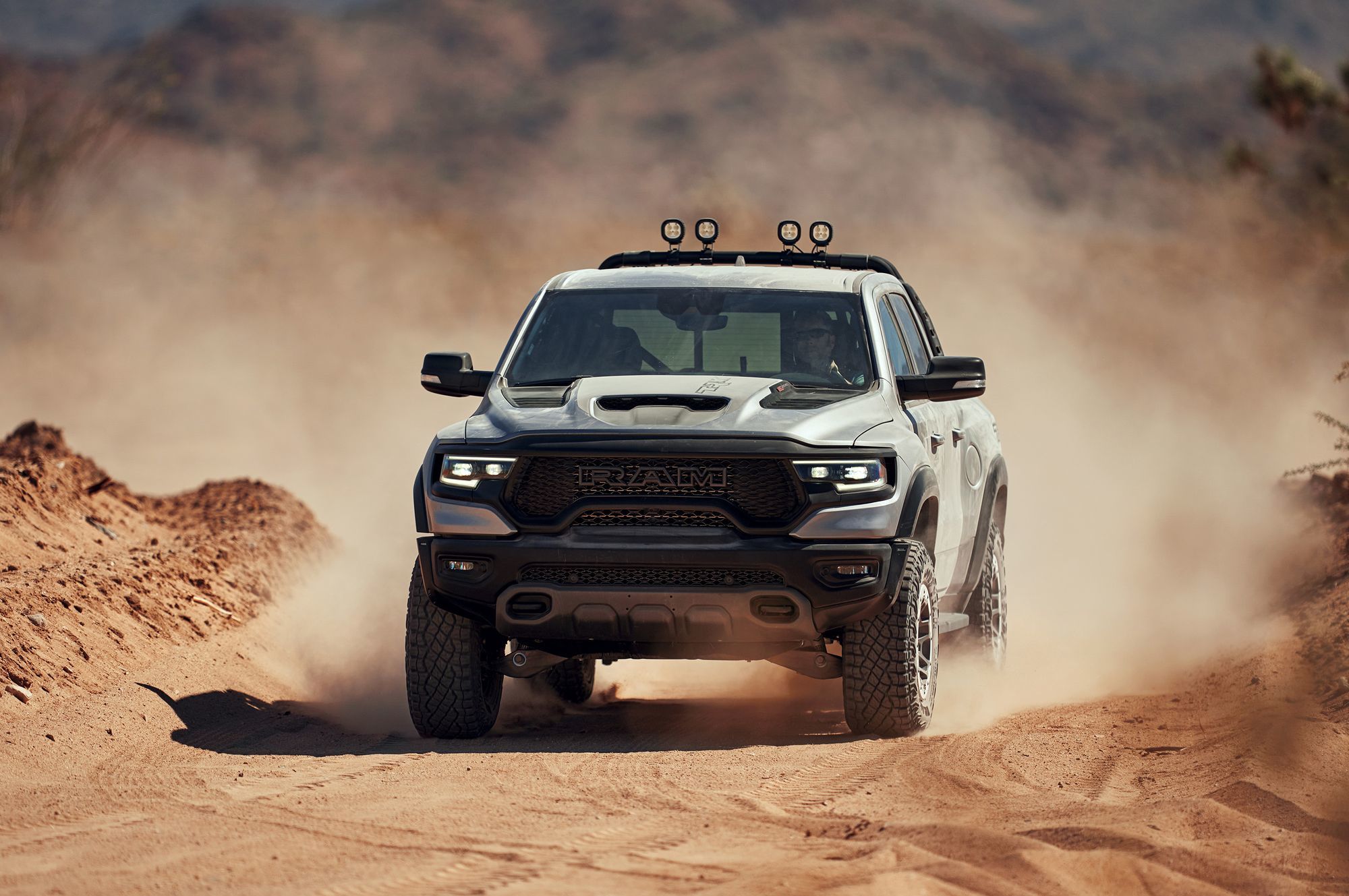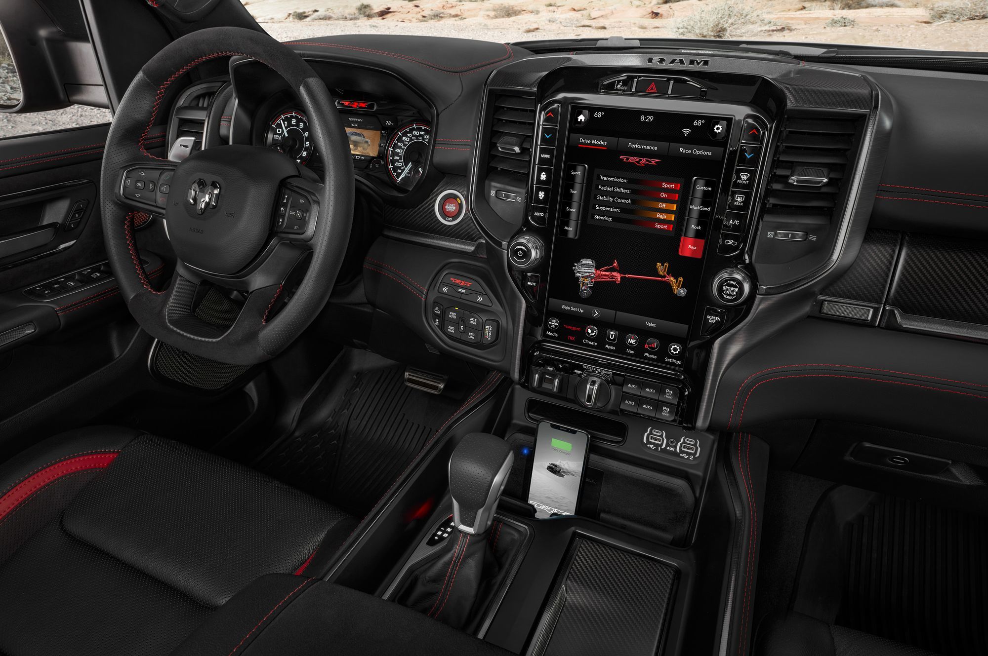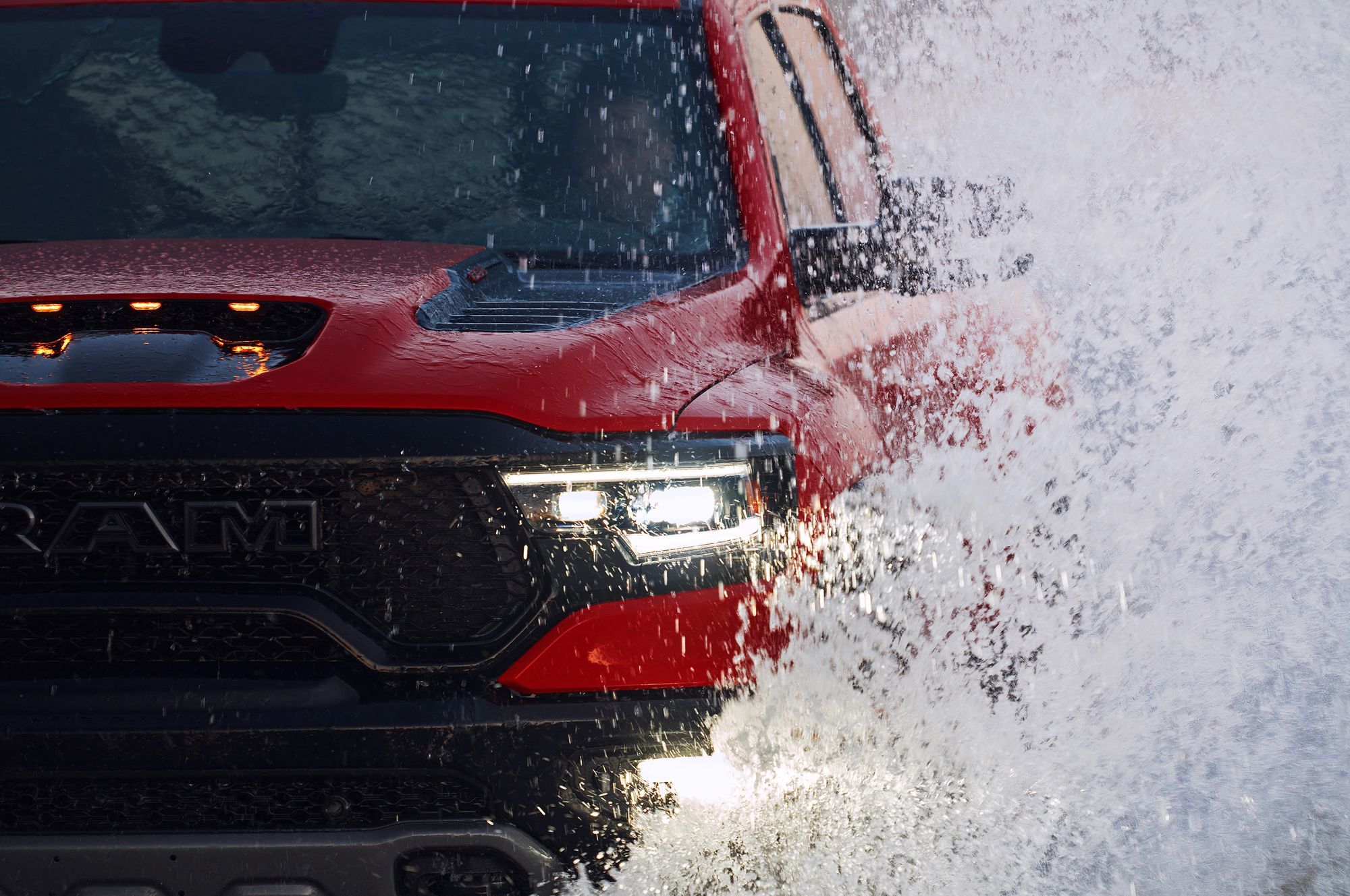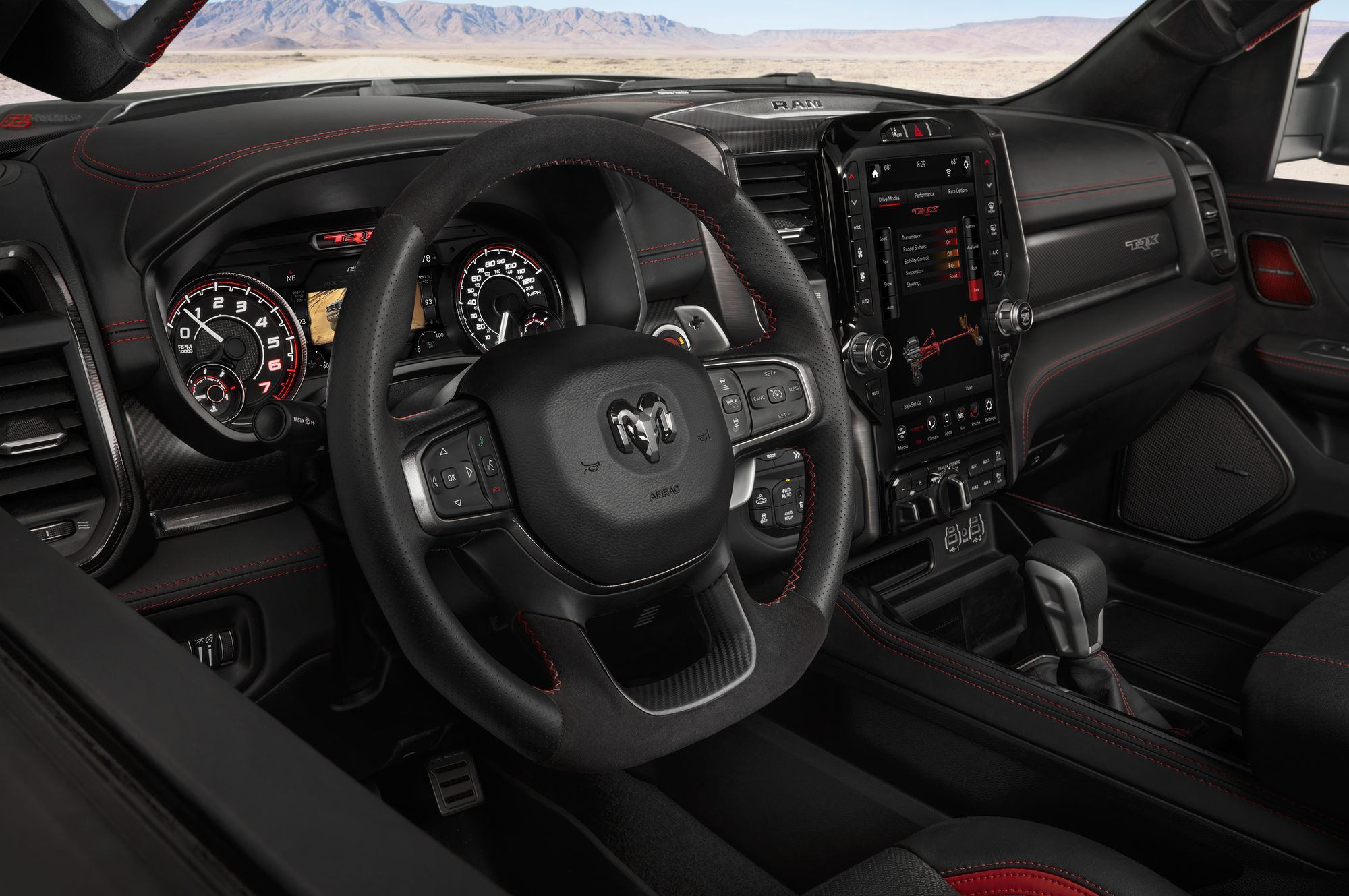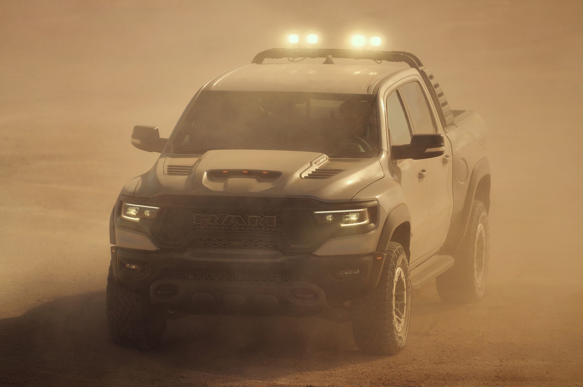 Восьмицилиндровый мотор обзавёлся двухканальной системой впуска: воздух в бокс объёмом 29 л поступает поровну через воздухозаборники в капоте и в решётке радиатора. Сложная система фильтрации поступающего потока задерживает не только грязь, но и воду, для которой предусмотрен слив. Пара фильтров — крупнейшие в сегменте! Общая площадь их поверхности достигает 0,18 квадратных метра. А ещё Ram TRX по умолчанию комплектуется лонч-контролем и технологией обнаружения прыжков, с помощью которой предотвращаются губительные для трансмиссии скачки мощности.