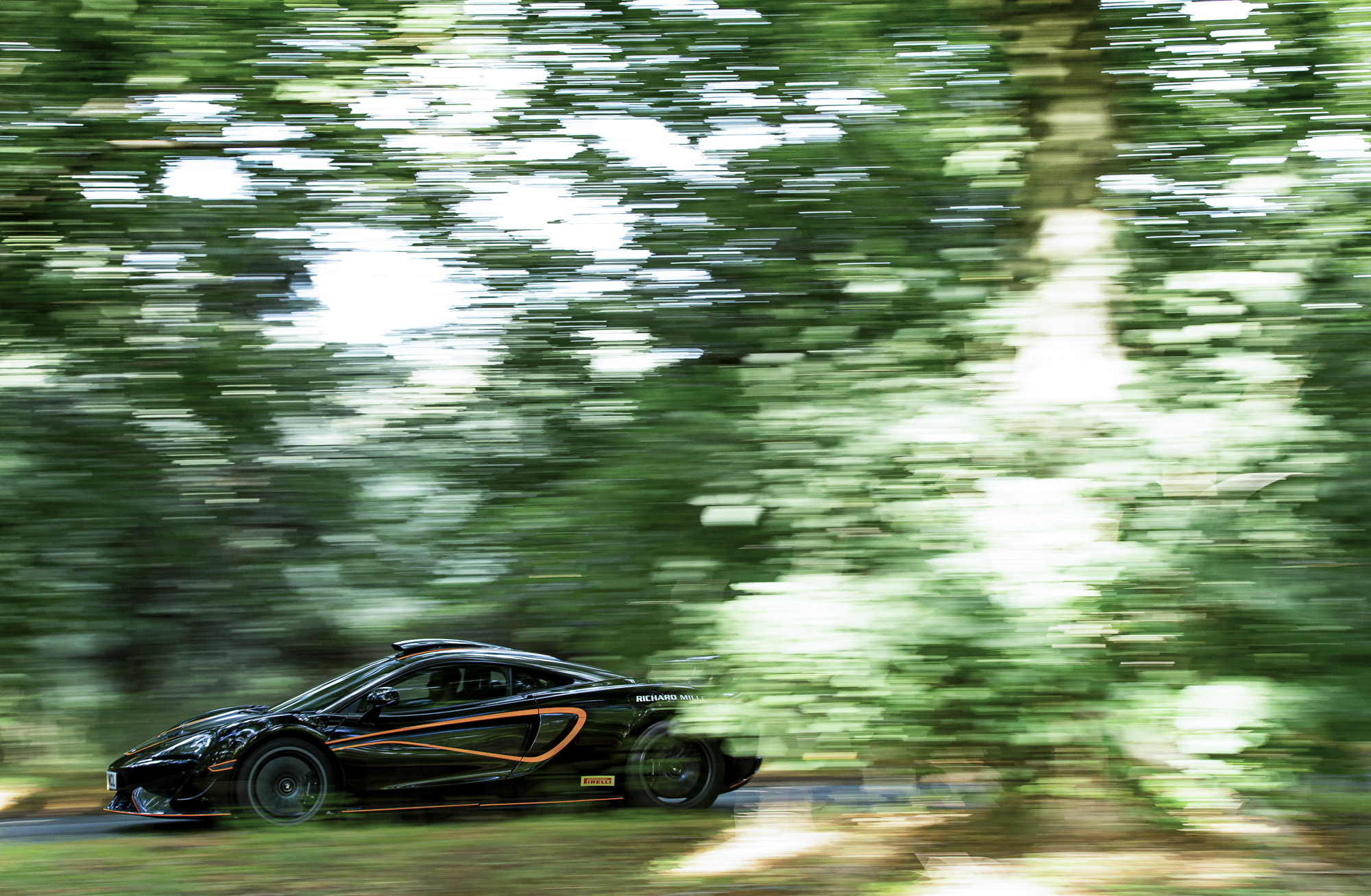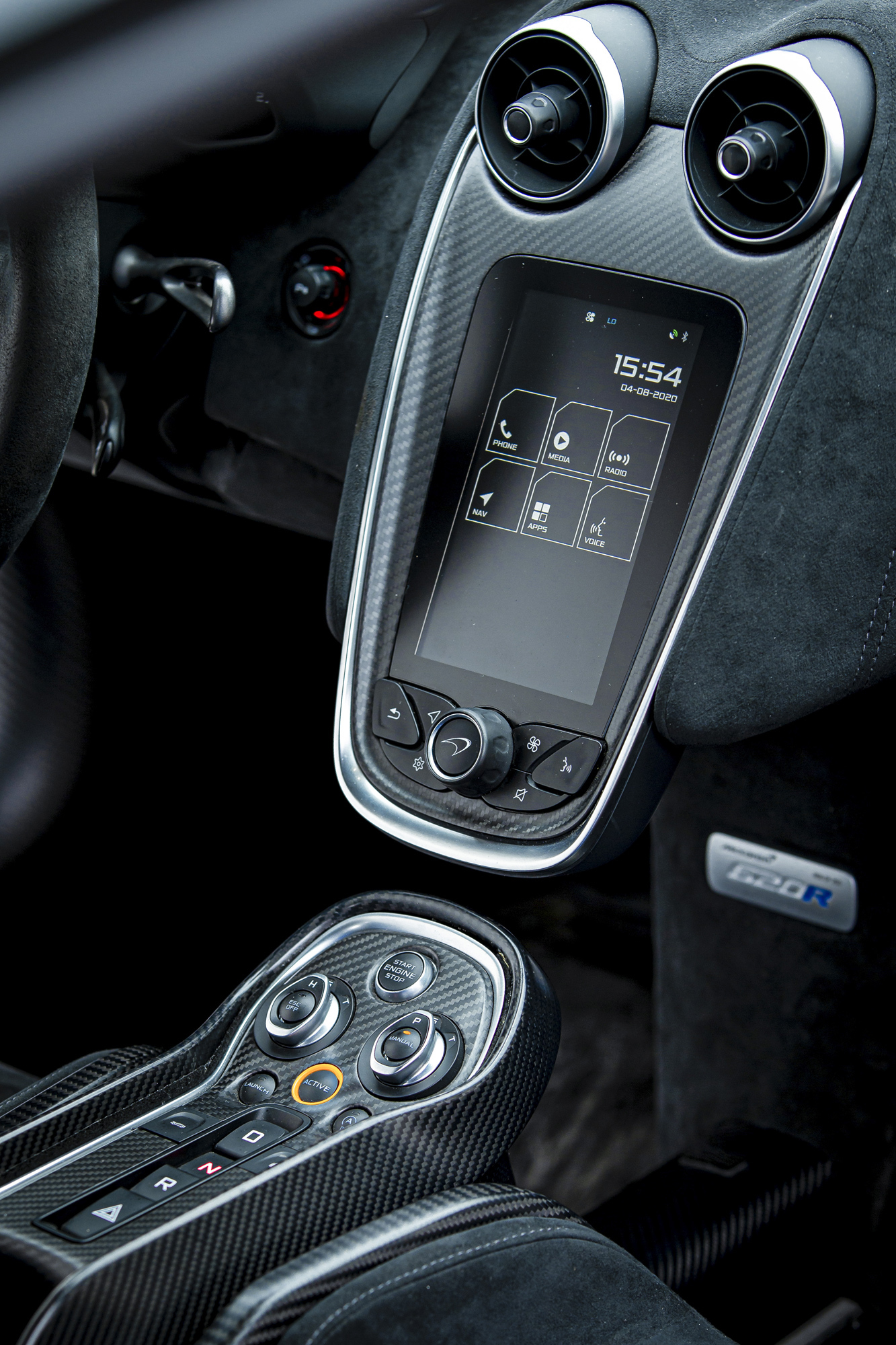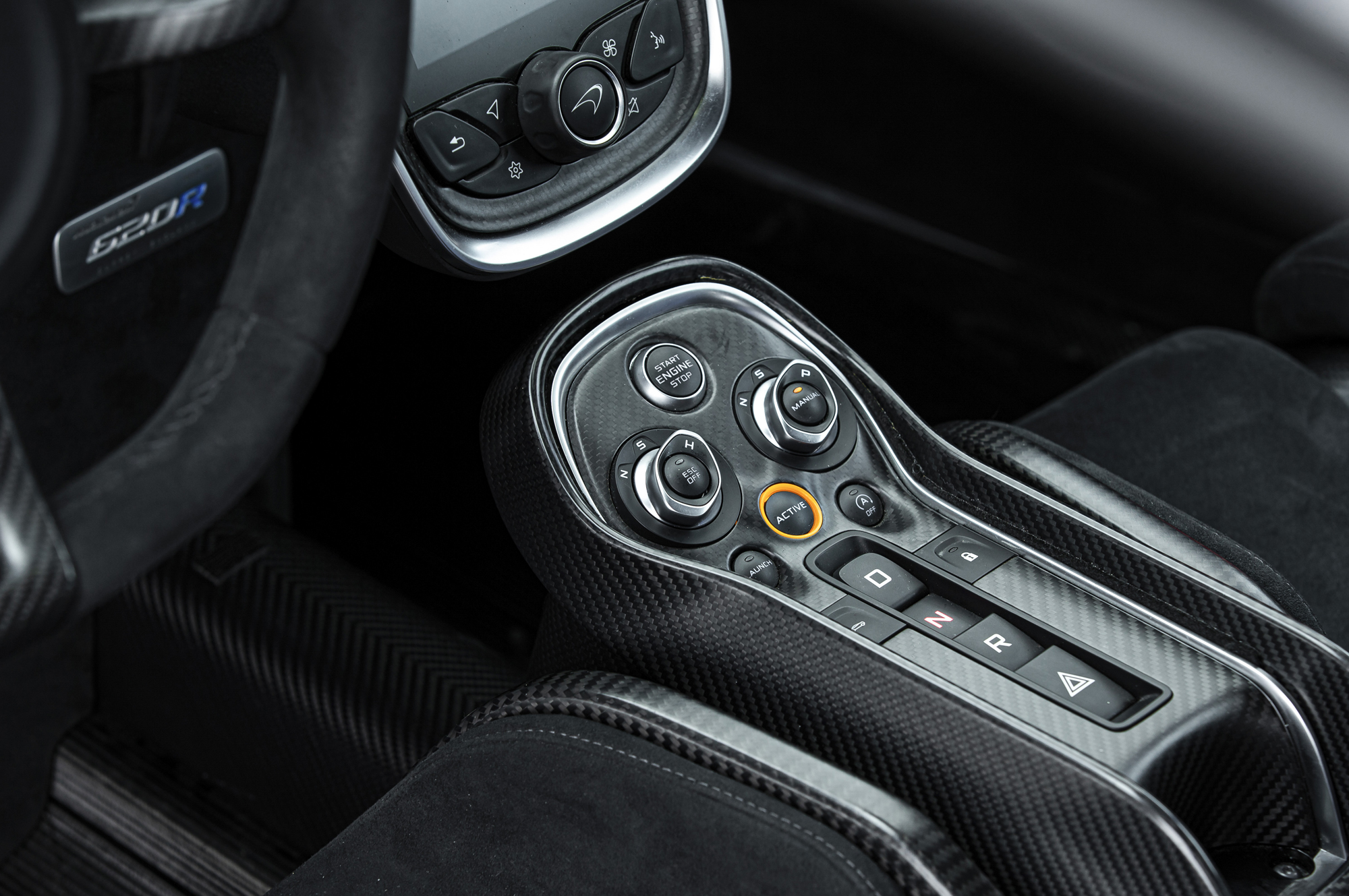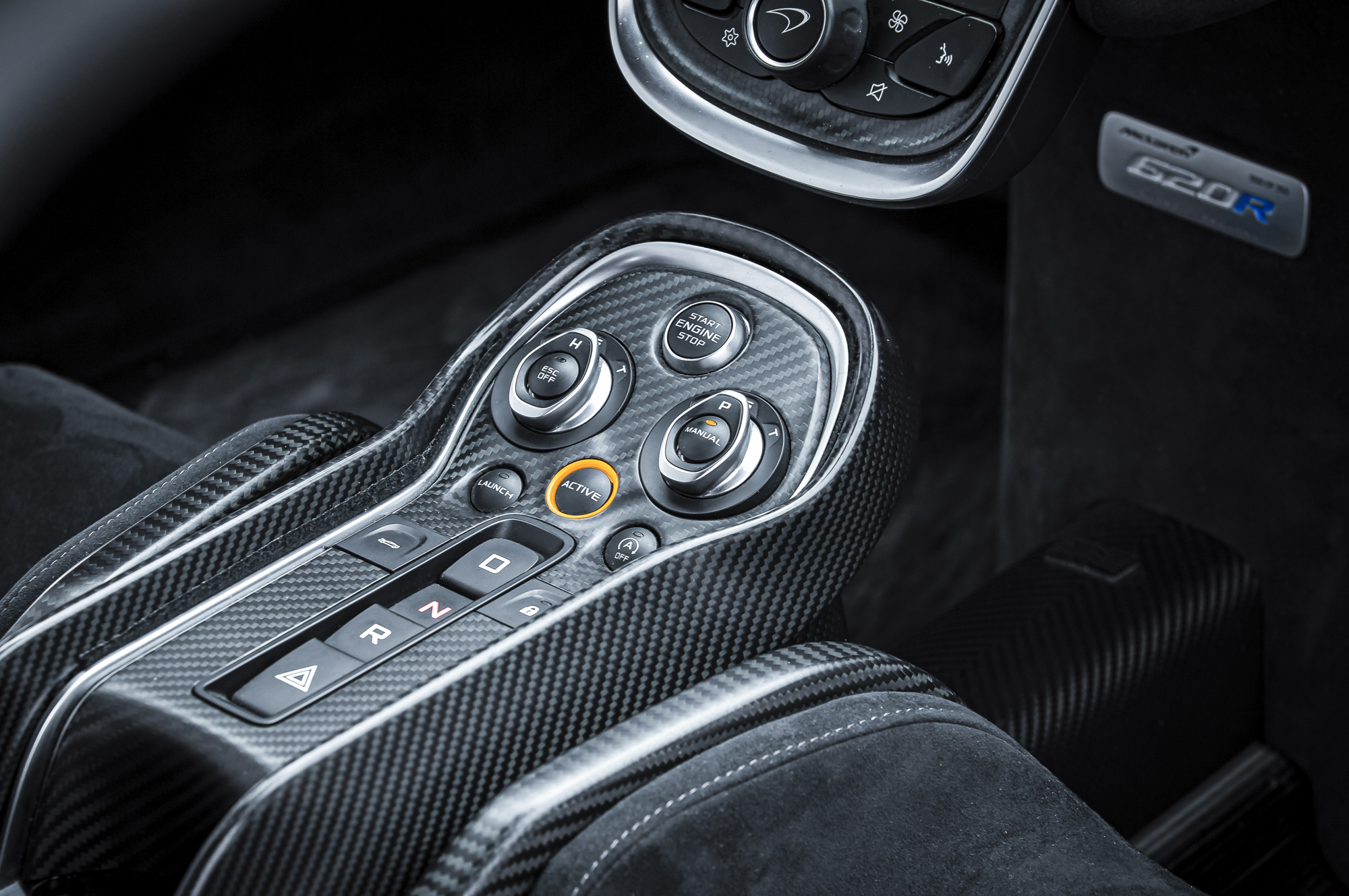 В комплект R Pack вошёл функциональный углепластиковый воздухозаборник на крыше, на который можно смонтировать камеру, подключённую к системе McLaren Track Telemetry для записи кругов. Второй компонент — это решётки на передних крыльях из такого же глянцевого «видимого» углеволокна (MSO Defined Gloss Finish Visual Carbon). Третий — пакет углепластиковой отделки интерьера. А четвёртый — выхлопная система MSO Defined Titanium SuperSports с выхлопными патрубками в декоре Gloss Nano Black. Она обеспечивает машине более резкий тон звучания и на пять децибел громче обычной выхлопной системы для машин Sports Series. Ну и несколько легче. На том же 620R «в базе» установлена система из нержавейки, а здесь — титан.