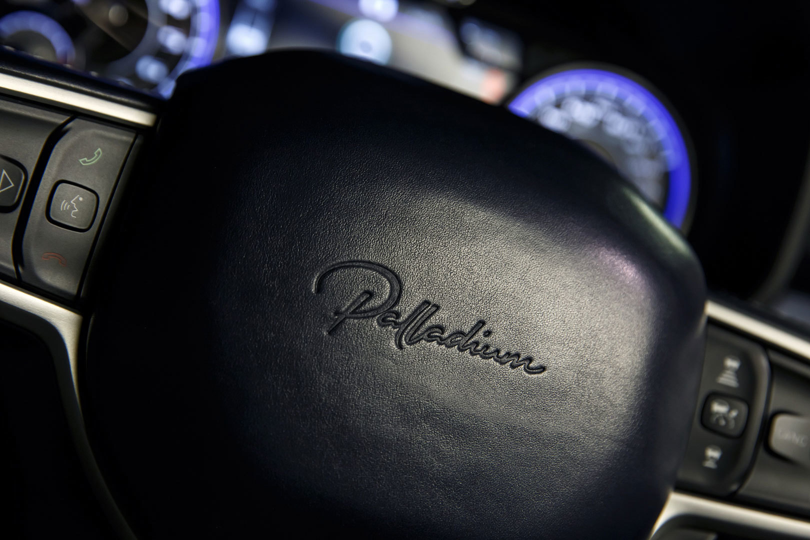 На Азноме стоит двигатель V8 5.7 Hemi, «поперчённый» двумя турбокомпрессорами. Отдача — 710 л.с. и 900 Н•м, но при этом американский мотор, пусть и с 48-вольтовой гибридной системой, как-то умудрились вписать в эконормы Euro 6d-TEMP. Palladium получил восьмиступенчатый «автомат», полноприводную трансмиссию и электронноуправляемую блокировку заднего дифференциала. Разгон до сотни занимает 4,5 с, а максимальная скорость ограничена на 210 км/ч. Подстраховка — тормоза Brembo с шестипоршневыми суппортами спереди и четырёхпоршневыми сзади (диаметр роторов — 408 и 380 мм соответственно).
