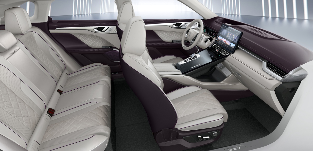 Гибридный Mocha начал катать китайских журналистов, поэтому представлены официальные изображения интерьера. По центру висит тачскрин диагональю 14,6 дюйма. Под ним размещена сенсорная панель для управления «климатом» и подогревами сидений. Нефиксируемый селектор трансмиссии снабжён «хрустальным» набалдашником. Двухцветная «кожаная» отделка со стёгаными вставками и элементы декора «под алюминий» говорят о стремлении в премиум-сегмент.