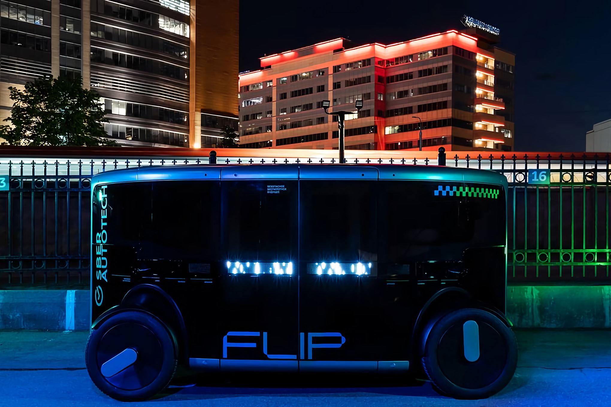 Компания СберАвтоТех (Sber Automotive Technologies) 27 мая показала ходовой прототип своего первого беспилотника — шестиместный электрокар Флип (Flip) без органов управления в салоне. Заявлено, что «автономное такси будущего» отвечает пятому уровню по шкале SAE. Имеется комплекс из лидаров, радаров и камер, а также «бесшовная интеграция с технологиями V2V и V2X». Едва ли не главным ноу-хау считается батарейная система, все модули которой можно заменить «не более чем за пять минут».