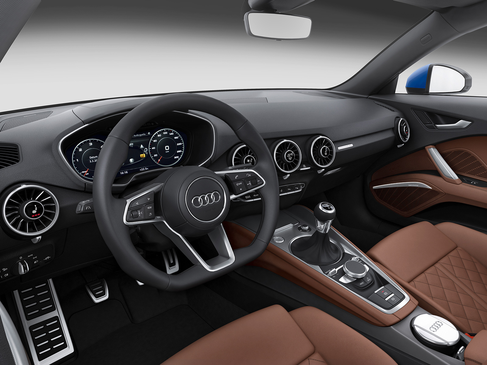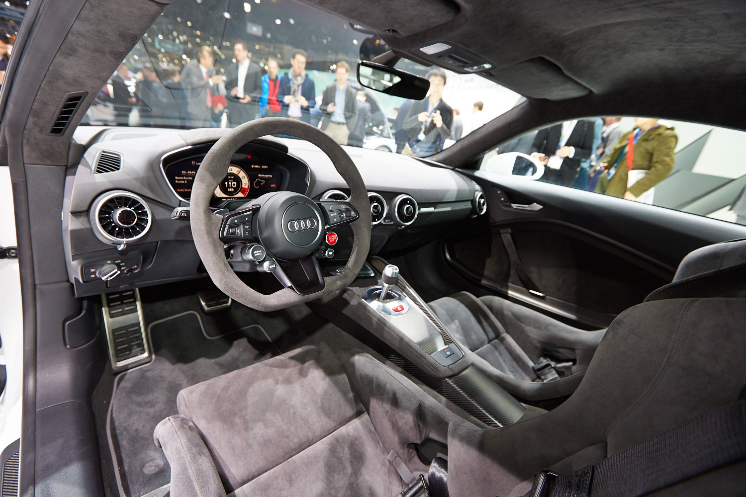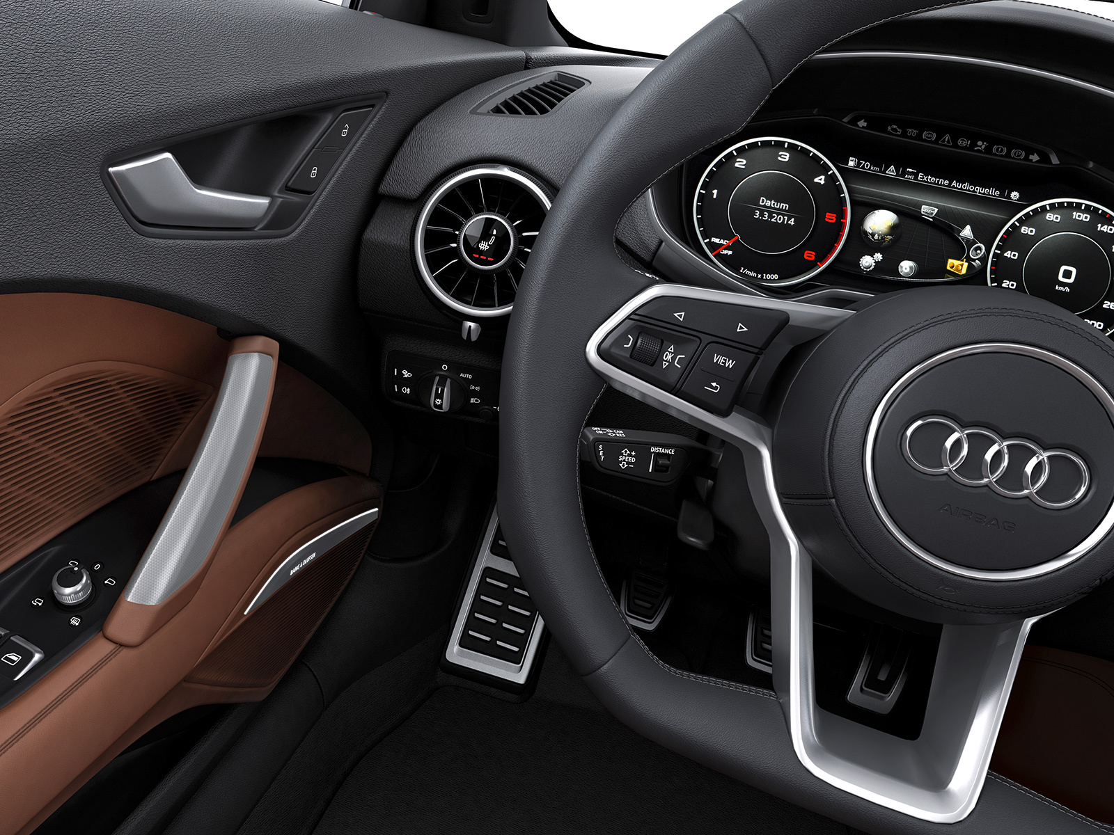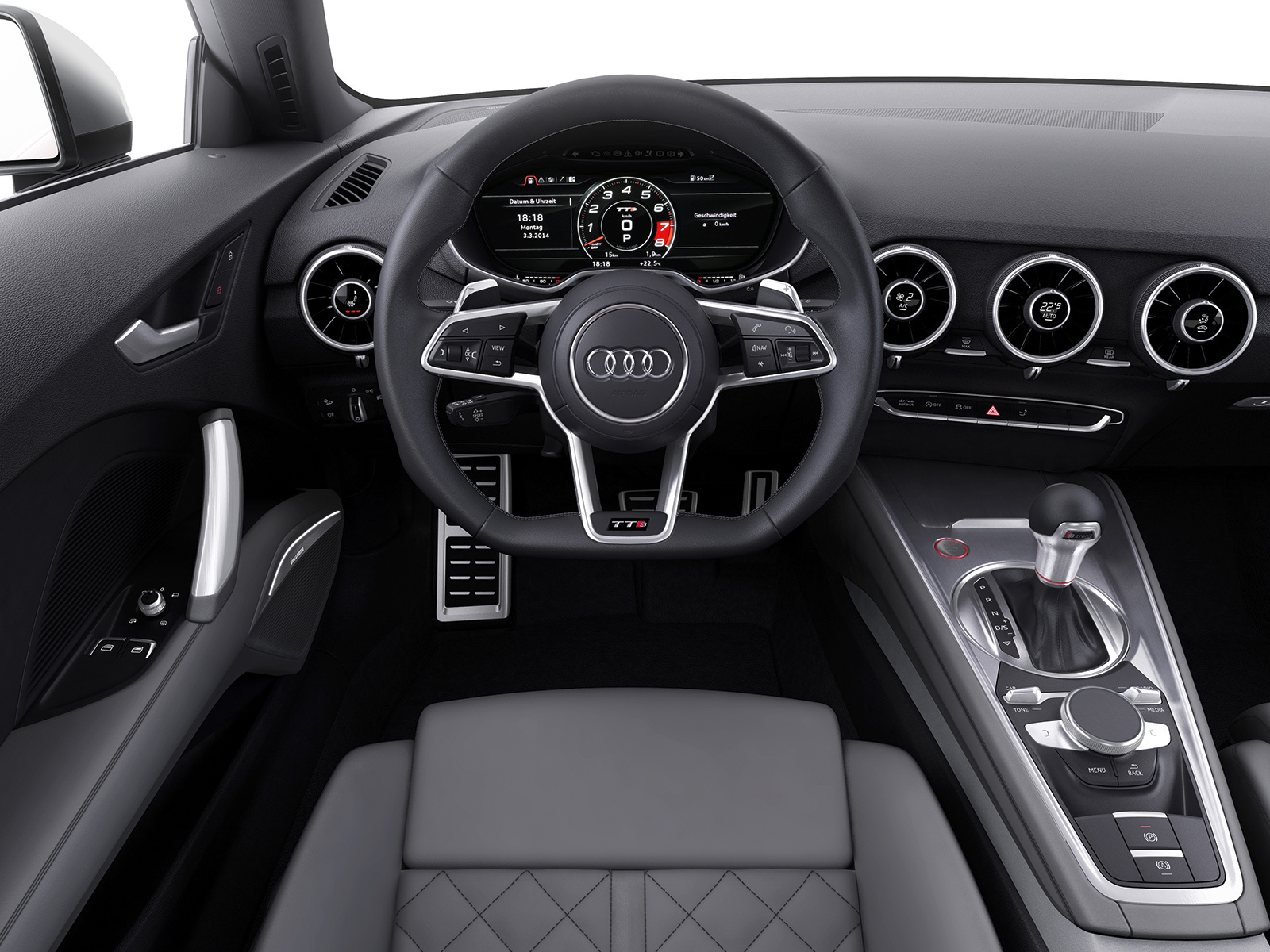 Интерьер выполнен в минималистичном ключе, а передняя панель, лишённая центрального дисплея, благодаря круглым воздуховодам призвана напоминать крыло самолёта (при взгляде сверху). Общий для приборов и мультимедиа-системы экран имеет разрешение 1440 на 540 и может работать в нескольких режимах. Для обычного хэтчбека доступны классическая компоновка с крупными циферблатами и небольшой информационной частью и развлекательная, в которой спидометр и тахометр становятся меньше и освобождают место, к примеру, для карты. В версии TTS есть ещё один вариант дисплея — с крупным тахометром по центру экрана. Кроме того, машину обучили понимать голосовые команды. Продажи начнутся в конце 2014 года, и тогда же станут известны финальные данные по динамике и расходу топлива, а также цены.