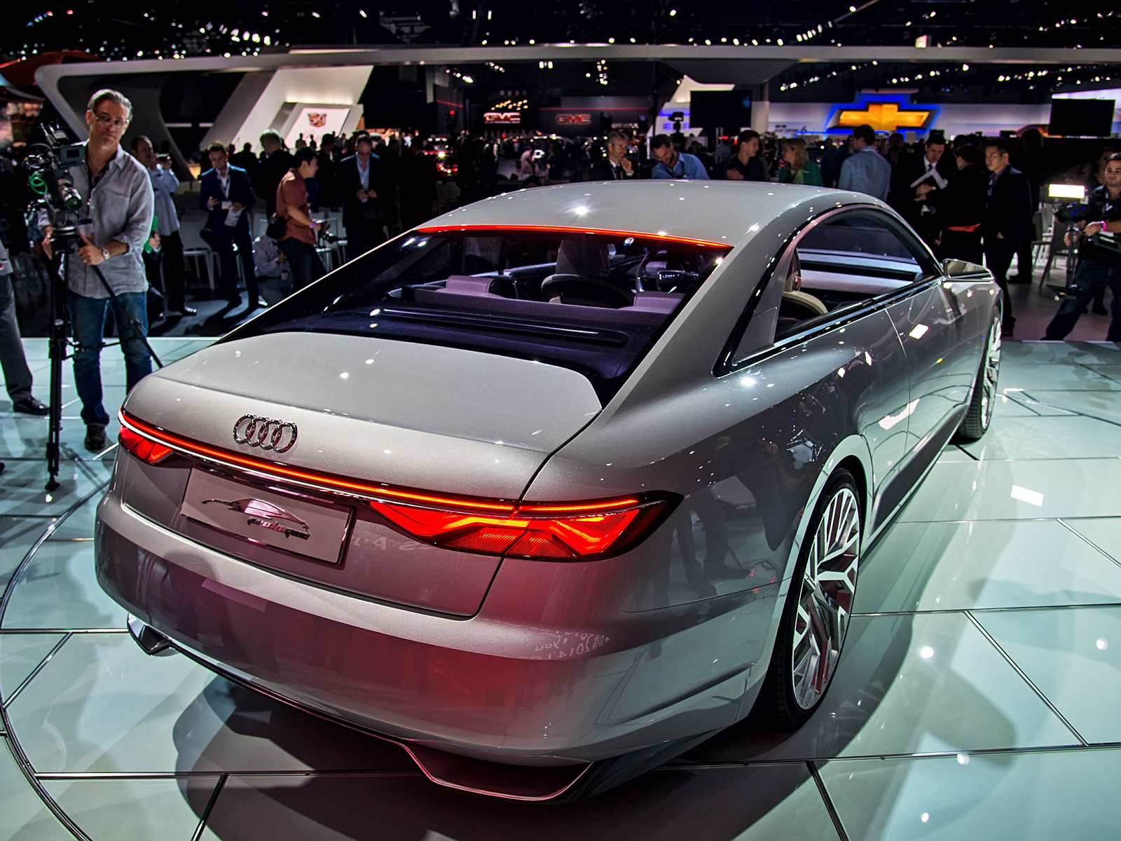 С наступлением новой эры ингольштадтцы не стали мелочиться и отправили под капот концепта наддувную «восьмёрку» 4.0 TFSI (605 л.с., 700 Н•м), которая на пару с восьмиступенчатым «автоматом» Tiptronic разгоняет полноприводное купе массой 1980 кг до сотни за 3,7 с. (В режиме Overboost, включающемся на 15 с, доступен момент 750 Н•м.) При этом средний расход топлива — 8,6 л/100 км. У купе адаптивная пневмоподвеска и полноуправляемое шасси: задние колёса поворачиваются на угол до пяти градусов.