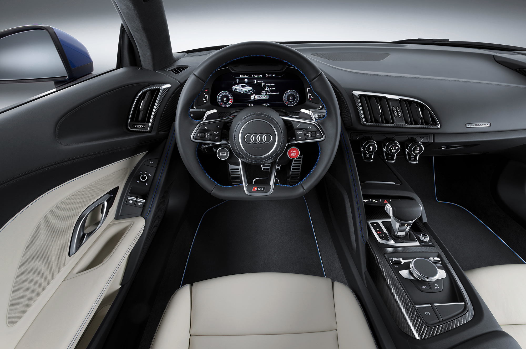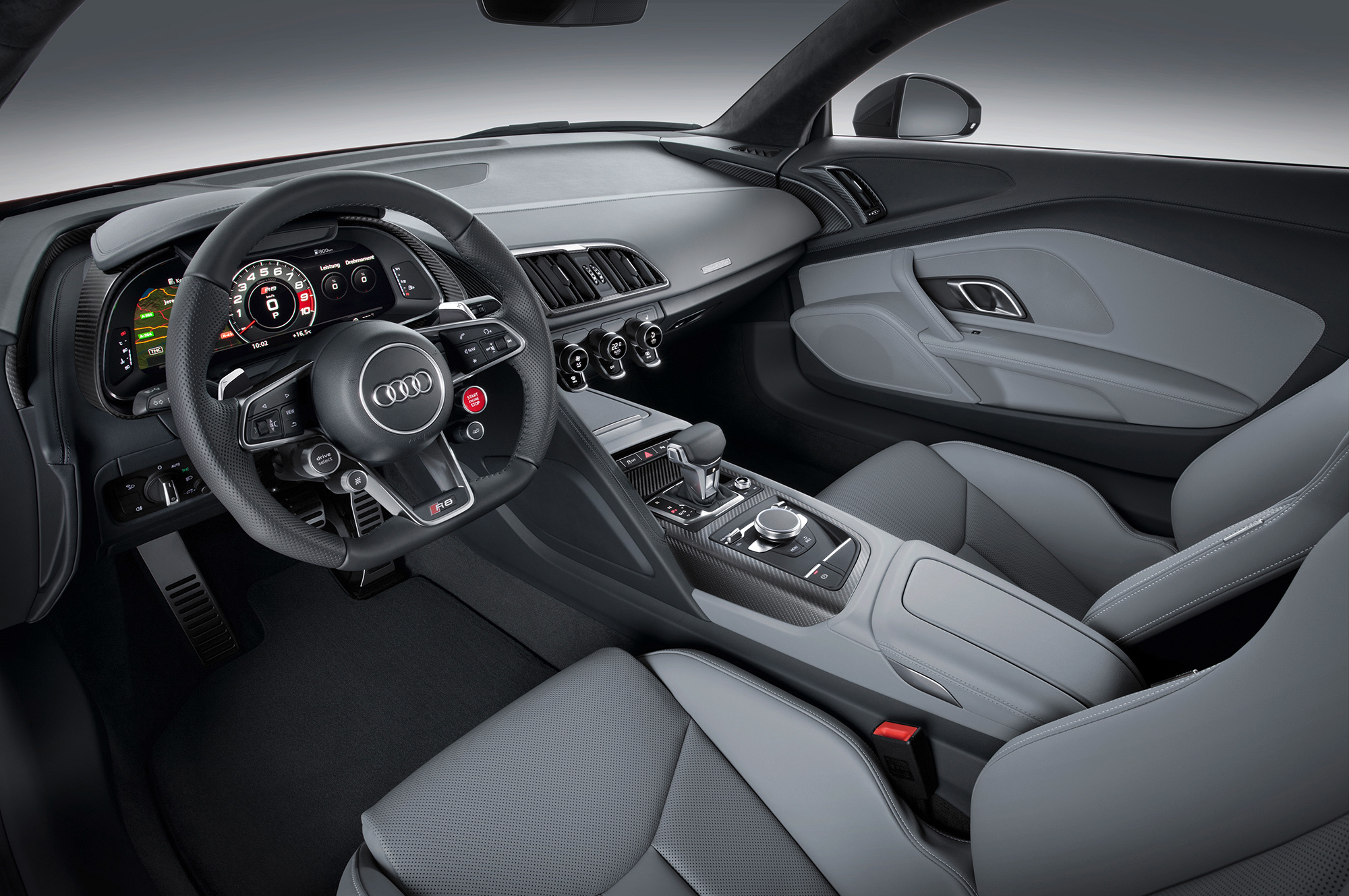 «Атмосферник» V10 5.2 FSI — это эволюция предшественника. В частности, он получил комбинированную систему питания (сочетающую непосредственный и распределённый впрыск), системы отключения одного блока цилиндров на малых нагрузках и start/stop. Исходная «десятка» на R8 выдаёт 540 л.с. и 540 Н•м. Их хватает на разгон с нуля до сотни за 3,5 с и максималку в 323 км/ч. На купе R8 V10 plus отдача повышена до 610 л.с. и 560 Н•м (ровно столько же у Урагана). Такая версия набирает сотню с места за 3,2 с и развивает максималку 330 км/ч (это самый быстрый серийный Audi).