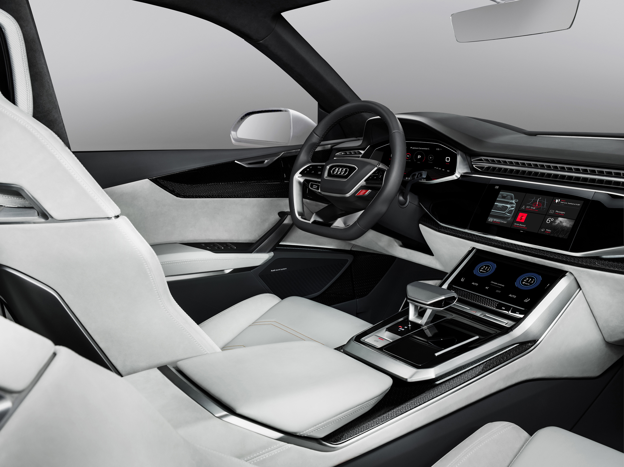 В кроссовере использованы система постоянного полного привода quattro и адаптивная пневмоподвеска с регулировкой уровня в пяти положениях. За 23-дюймовыми колёсными дисками (шины — 305/35) с новым дизайном виднеются 20-дюймовые углеродокерамические «блины». Как и у прошлого концепта, от носа до хвоста у этого шоу-кара 5,02 м при трёхметровой колёсной базе. Почти таким мы увидим Q8 в серии в 2018 году — разумеется, с россыпью разных моторов. Ну а электрический наддув со временем распространится на разные модели концерна Volkswagen. Встречать его мы будем и на бензиновых, и на дизельных моторах.