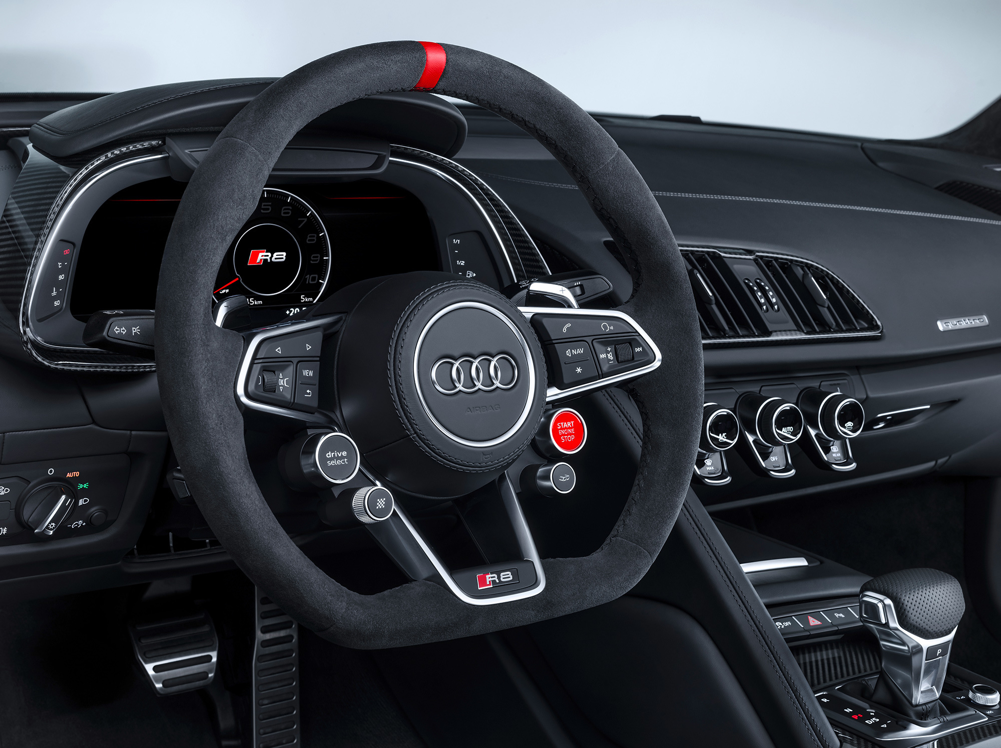 Внутри машины с пакетом Audi Sport Performance легче всего опознать по новому рулю со скошенным ободом, отделкой алькантарой и красной меткой нулевого положения. Если вместо ручной коробки передач клиент захотел роботизированную, то вместе с ней он получит и подрулевые переключатели из углеволокна. А ещё специально для Audi TT в спортивном отделении компании разработали композитную распорку, которая заменяет собой задний диван, от которого и так немного смысла. Зато эта конструкция увеличивает жёсткость кузова и уменьшает снаряжённую массу автомобиля на 20 кг.