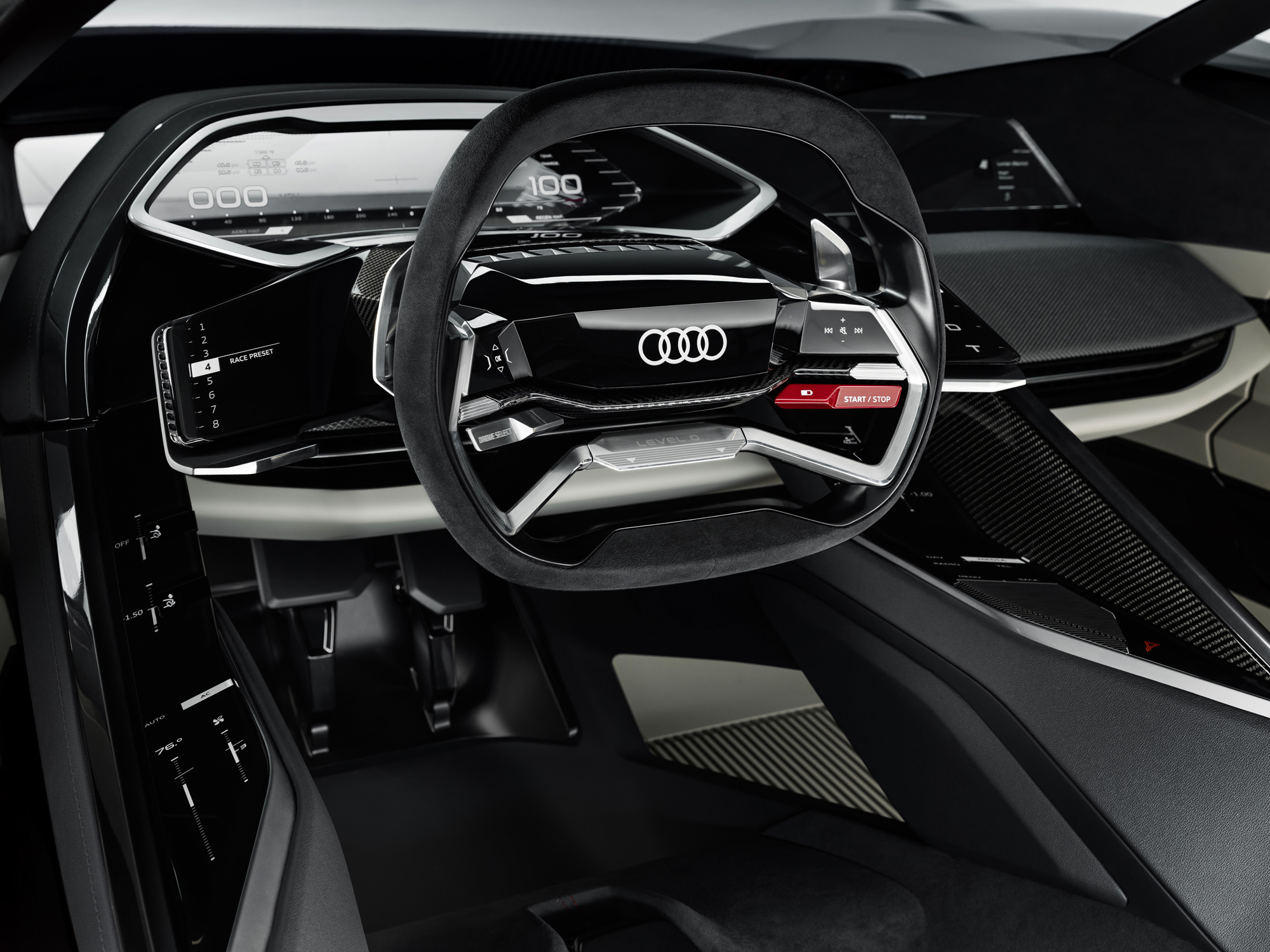 В PB18 e-tron интересны не только дизайн или техника, но сама концепция двойного применения модели. На кольце это бескомпромиссный трек-кар, способный превращаться в практичный автомобиль вне трассы. Это возможно благодаря управлению по проводам: руль и педали связаны с электрокаром только проводкой. Так что блок водителя свободно двигается по ширине салона.