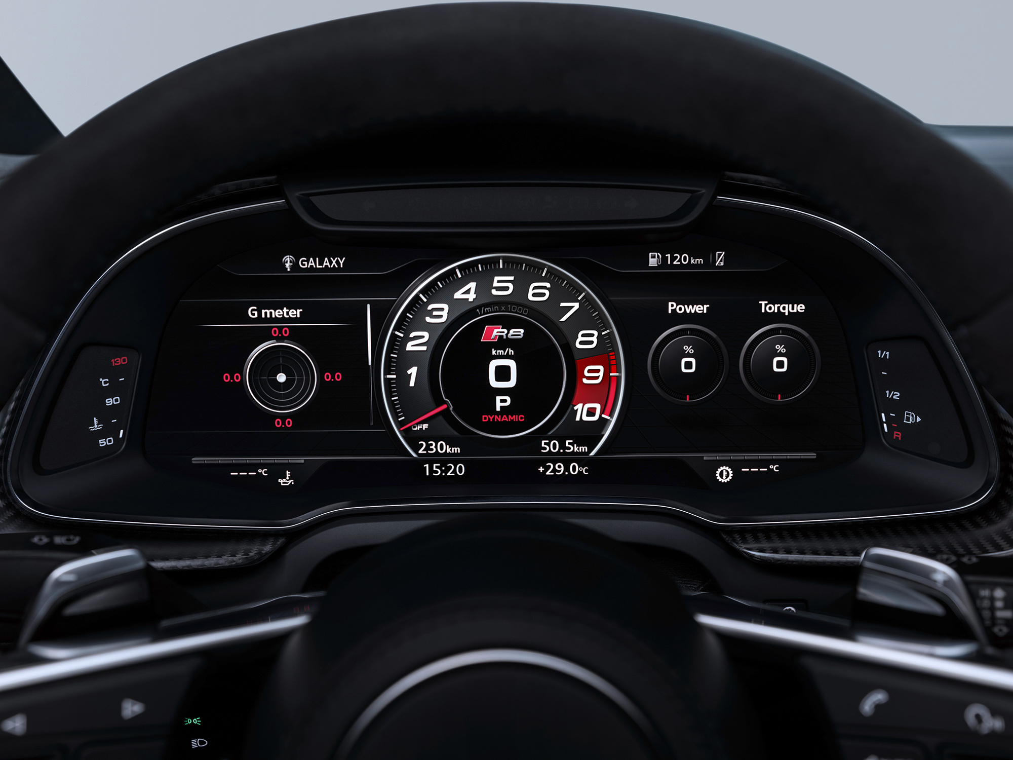 Вопреки ожиданиям, мотор V6 2.9 в гамме после рестайлинга не появился. Зато «атмосферник» V10 5.2 у базовой версии Audi R8 теперь выдаёт 570 л.с. (+30) и 550 Н•м (+10). Разгон до сотни происходит на одну десятую быстрее — за 3,4 с (у Спайдера 3,5). Максимальная скорость отныне составляет 324 км/ч (322) вместо 323 (318). В топовом исполнении Audi R8 V10 performance quattro (новое название варианта V10 Plus) отдача выросла до 620 л.с. (+10) и 580 Н•м (+20). Спурт 0-100 км/ч ускорился на ту же десятую долю — до 3,1 с (3,2). Максималка достигла 331 км/ч (329), а было 330 (328).