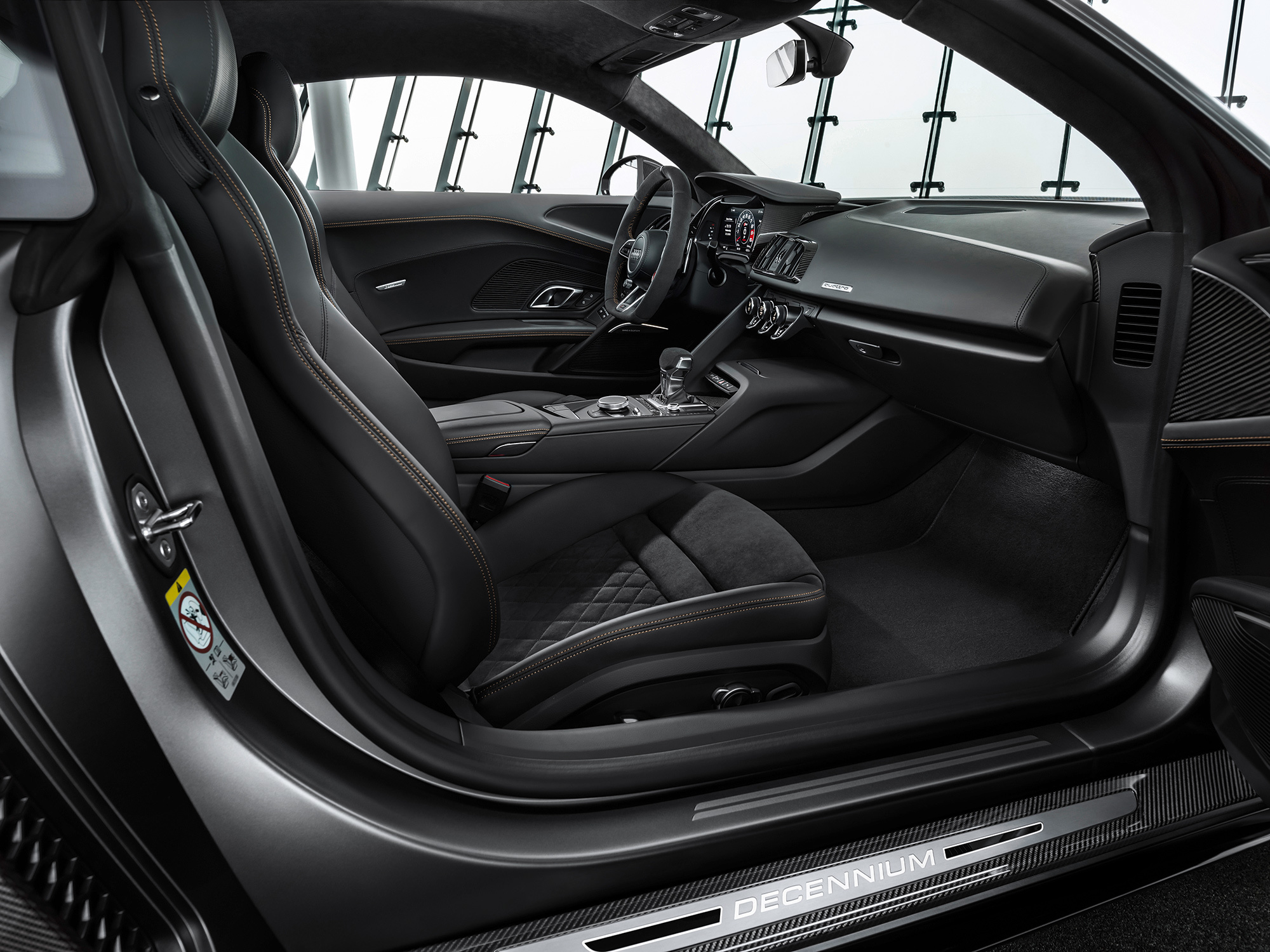 В честь десятилетия десятицилиндрового мотора на «эр-восьмой» компания Audi построила лимитированное издание купе R8 V10 Decennium (с латинского — «десятилетие»). Автомобиль получил самую мощную версию атмосферника V10 5.2 с отдачей 620 л.с. и 580 Н•м, как у модификации R8 V10 performance quattro (бывшая версия V10 Plus) после недавнего рестайлинга.