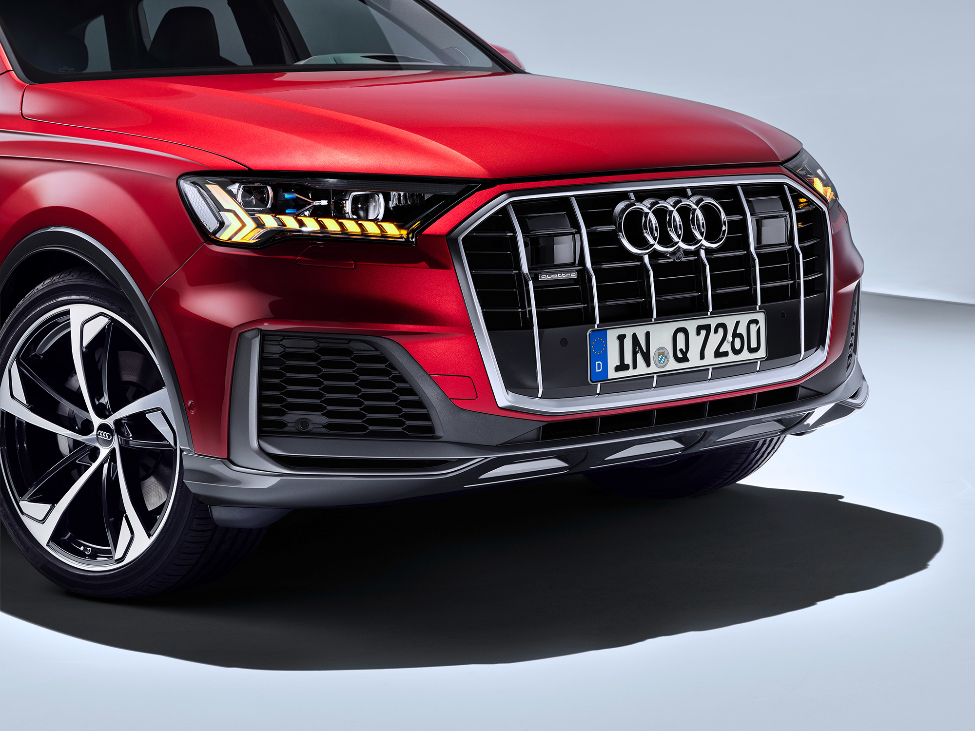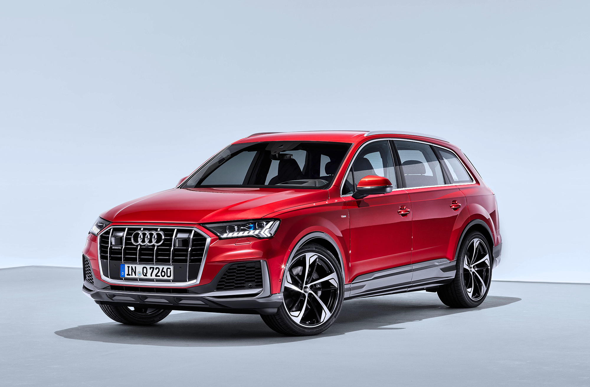 Второе поколение Audi Q7 (Typ 4M) выпускается с 2015 года, и только сейчас дождалось рестайлинга. Можно с уверенностью утверждать, что кроссоверу уготован более продолжительный жизненный цикл, чем другим моделям. Как тут не вспомнить, что предшественник продержался на конвейере десять лет. На премьере в Ингольштадте нам показали только машину в дерзком исполнении S-Line. Решётка радиатора с крупным шагом прутьев, новые фары и бампер с вычурной пластикой добавили кроссоверу сходства с флагманом Q8.