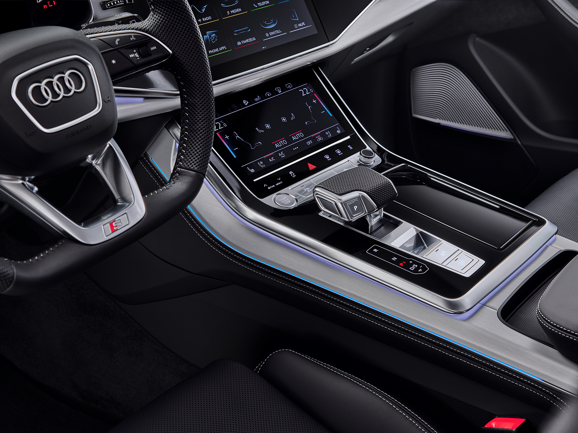 Мультимедийный интерфейс MMI таким образом избавился от контроллера с тачпадом на центральном тоннеле. В качестве альтернативы сенсорным панелям продвинутая система Navigation Plus использует голосовое управление, причём навигация способна самообучаться и поддерживает различные онлайн-сервисы. В некоторых городах Европы Audi сможет взаимодействовать с инфраструктурой, подсказывая водителю, с какой скоростью надо ехать, чтобы двигаться в зелёной волне светофоров.