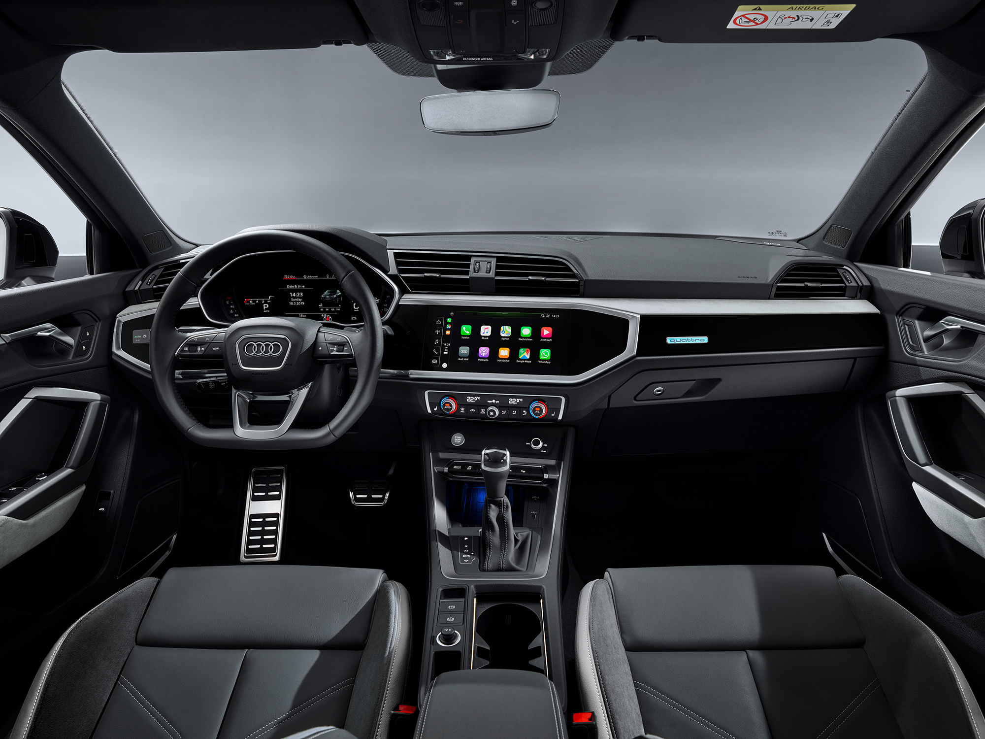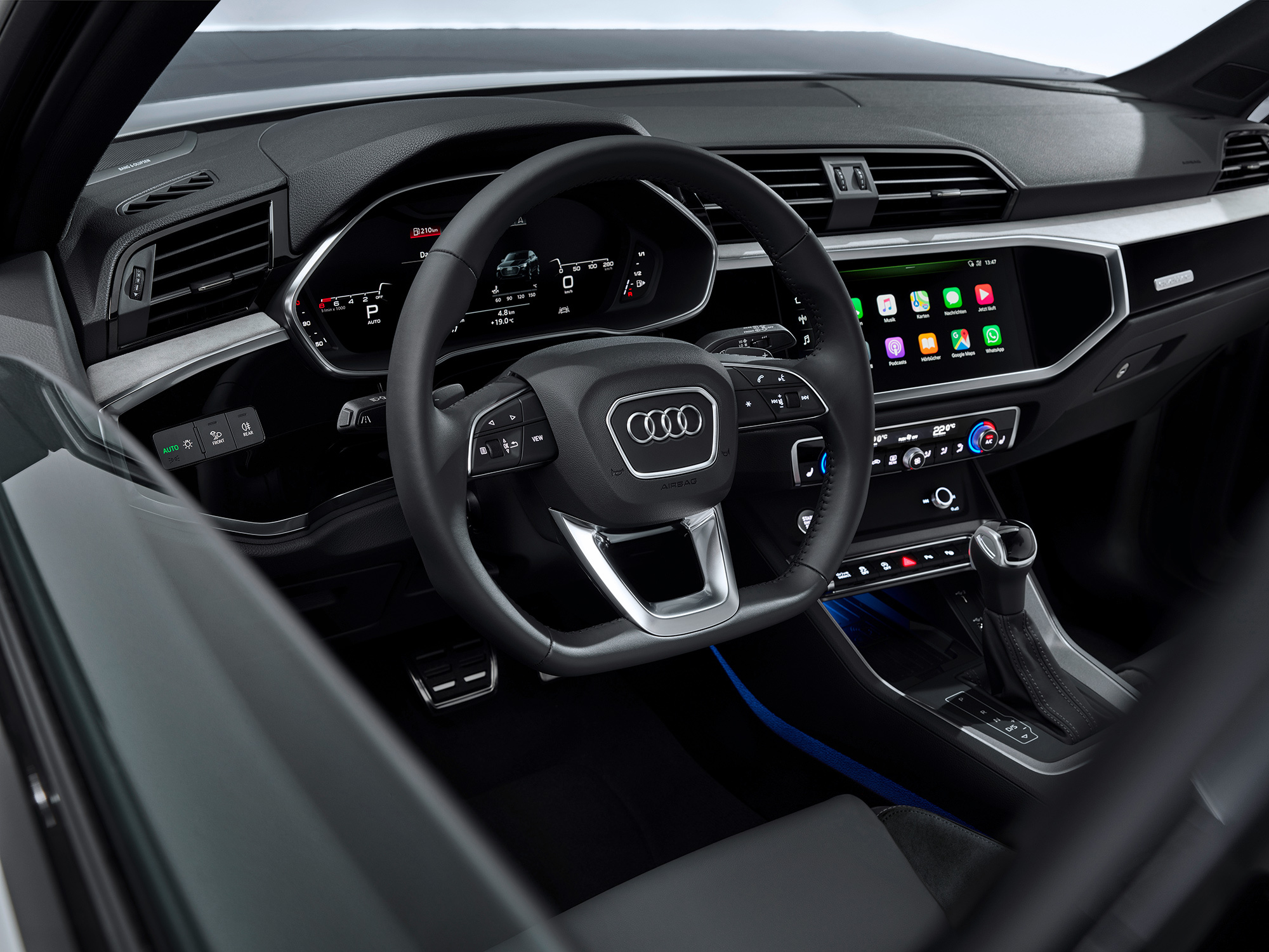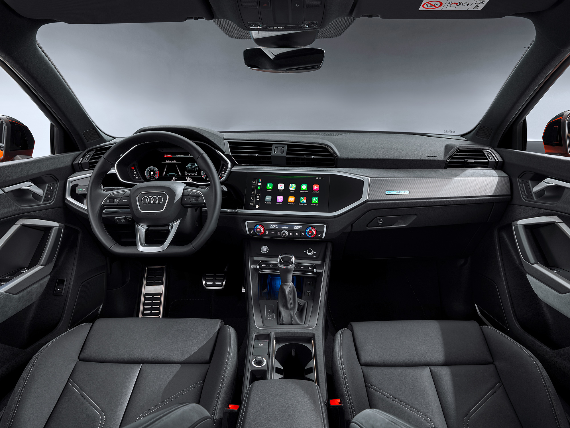 Интерьер унифицирован для всего семейства Q3. На развёрнутой к водителю центральной консоли сохранён блок управления климатом с физическими кнопками и ручками. Топовое мультимедийное устройство MMI navigation plus по возможностям не уступает комплексам в старших Audi. Предусмотрена система голосового управления, воспринимающая команды в свободной форме. Картографию и онлайн-сервисы обеспечивает фирма HERE.