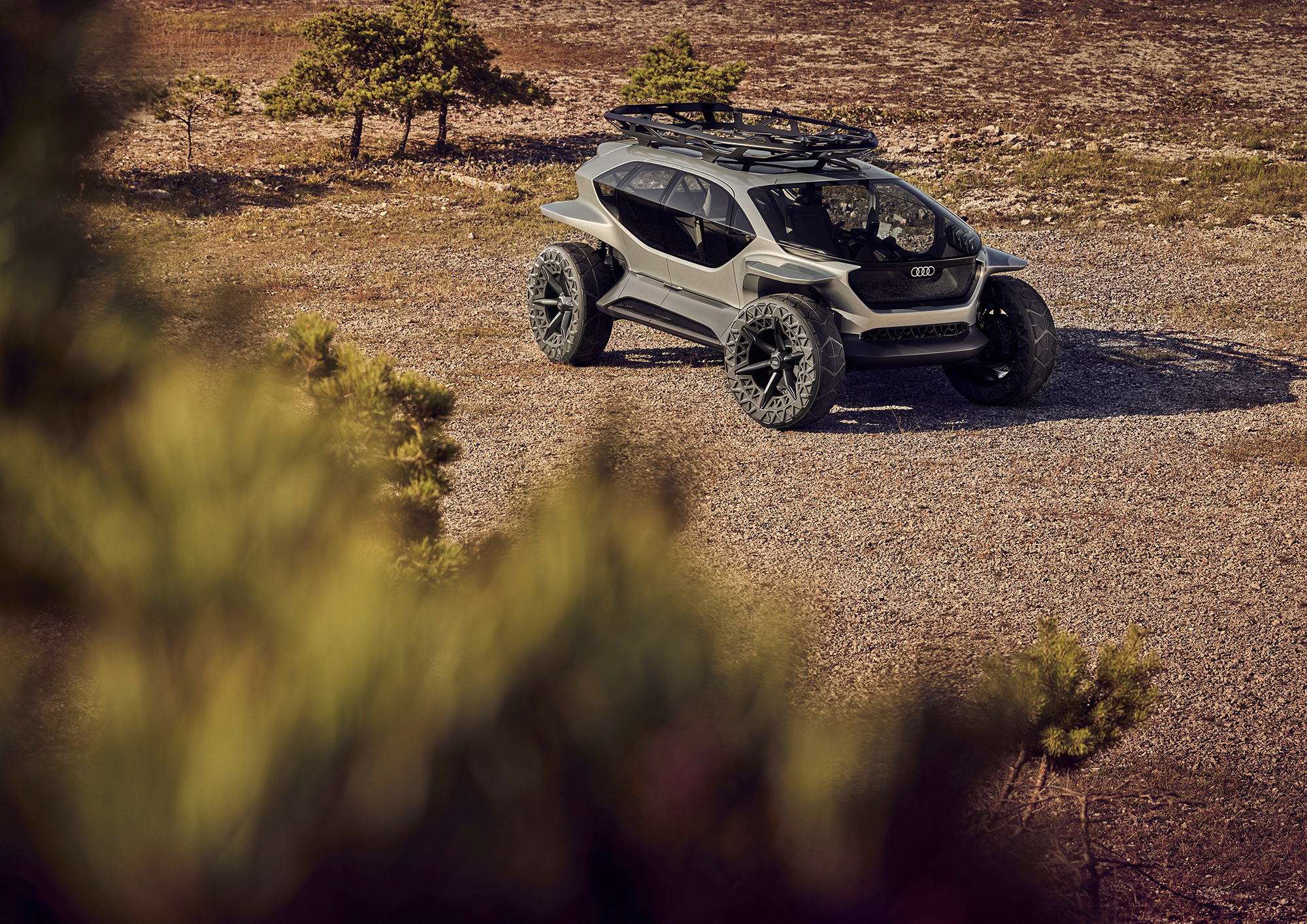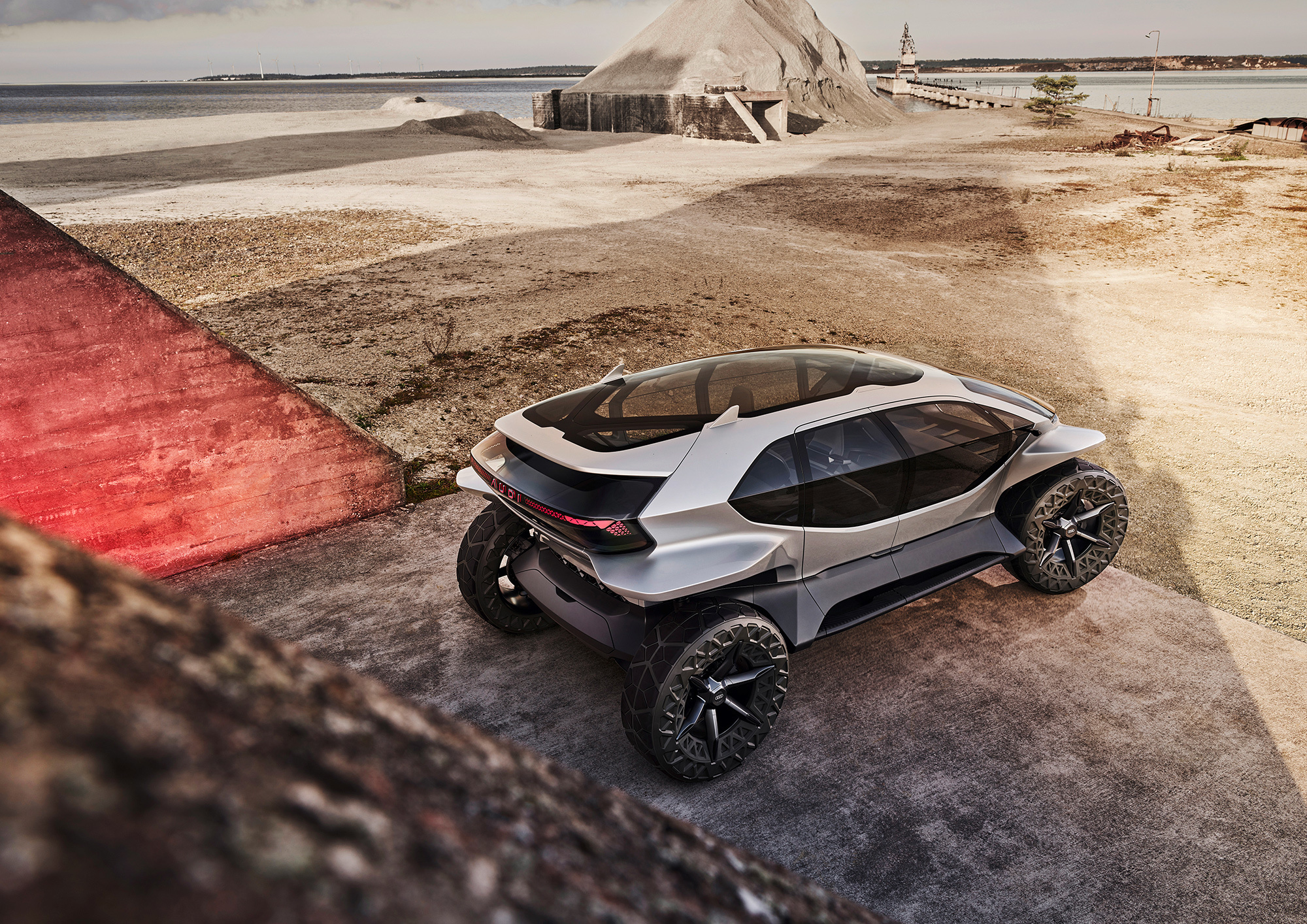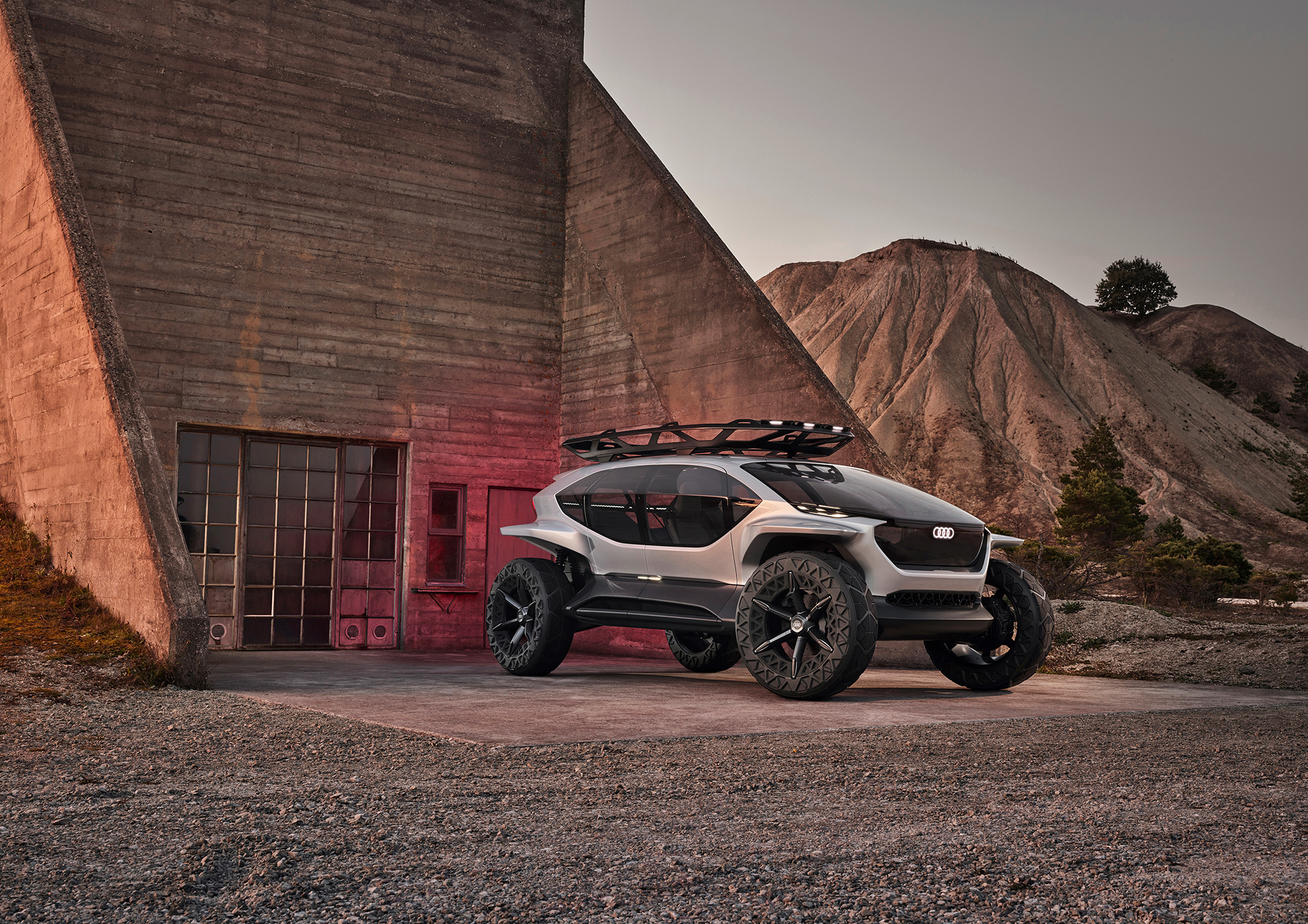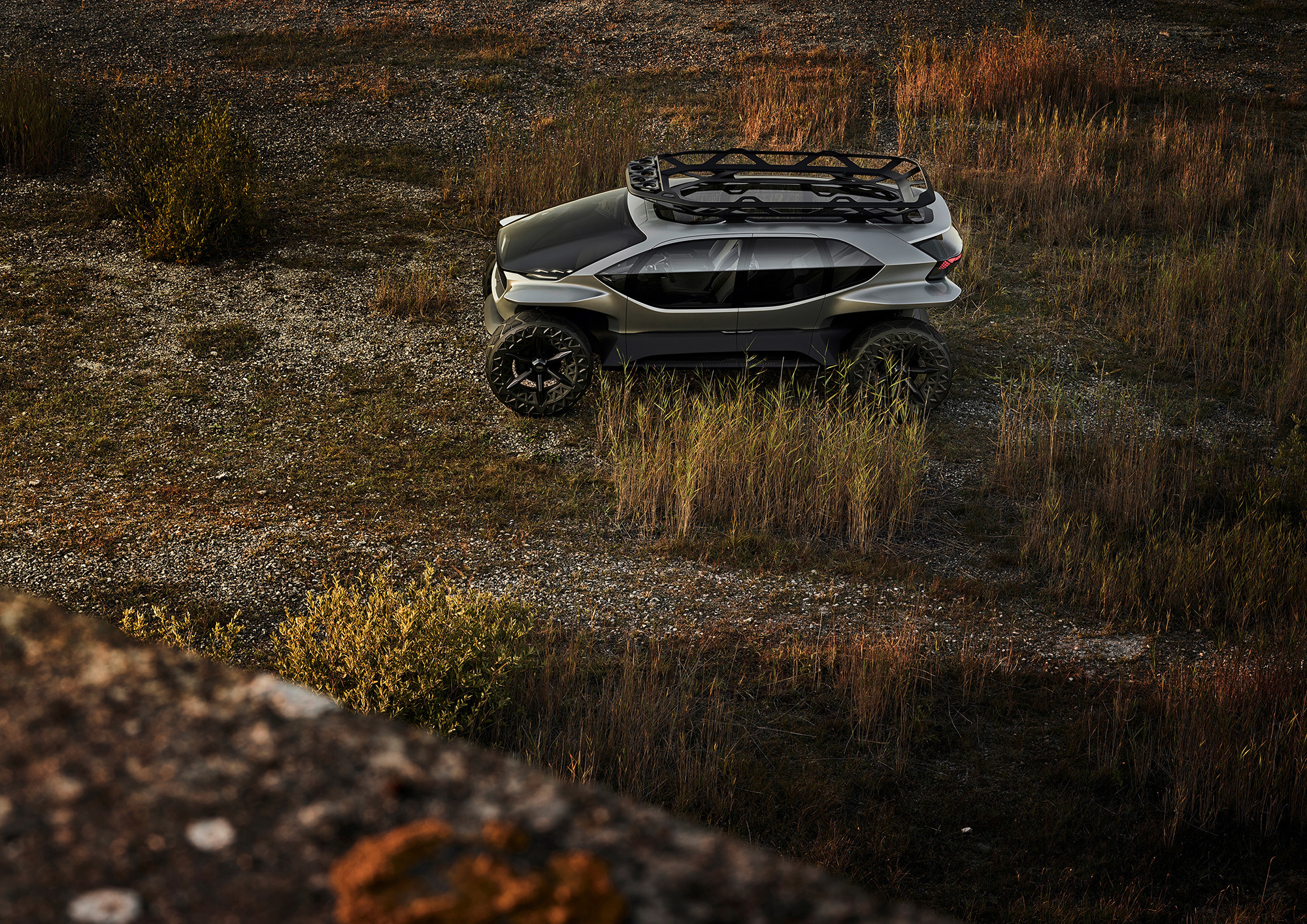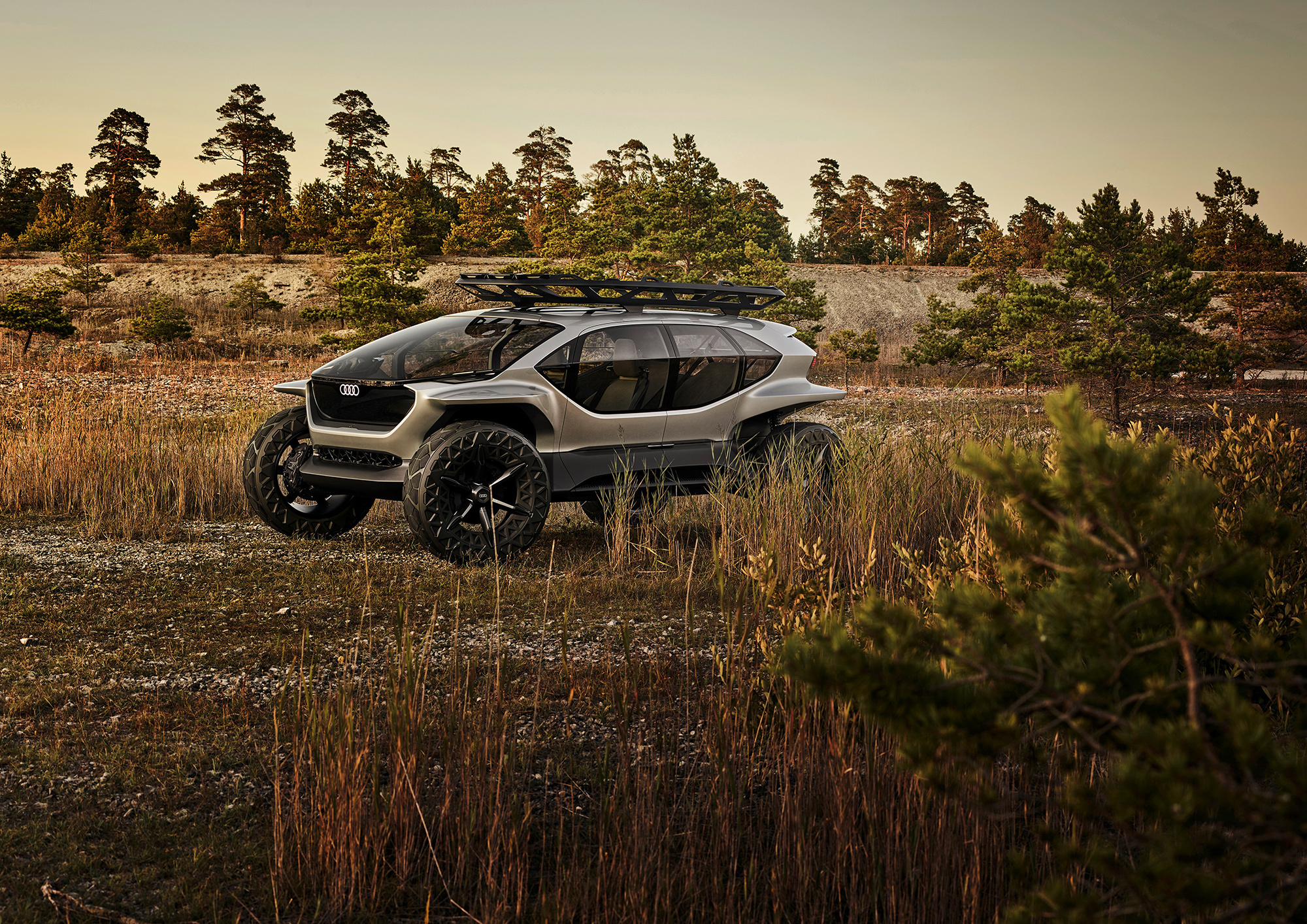 Четыре электромотора установлены рядом с колёсами и приводят их напрямую. Максимальная отдача системы — 320 кВт (435 л.с., 1000 Н•м). Однако вся мощность используется редко, да и привода на одну ось бывает достаточно. Литиево-ионная батарея встроена в днище: запас хода при езде по асфальту и лёгкому бездорожью составляет 400–500 км в цикле WLTP. В сложных условиях пробег меньше вдвое. Скоростной потолок — 130 км/ч. Прозрачный, как аквариум, салон вмещает четверых пассажиров. Экологически чистый внедорожник Audi AI:Trail quattro везёт их на природу. Путь освещают летящие дроны.