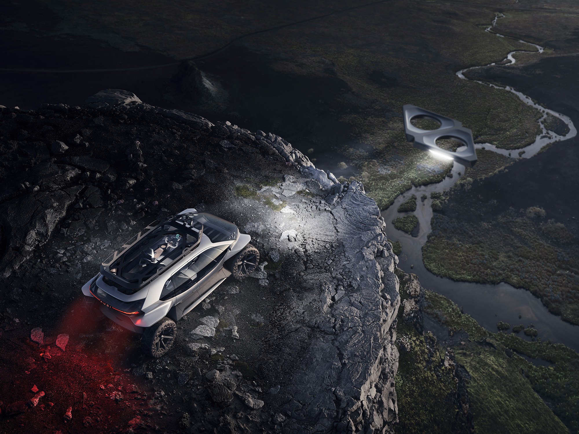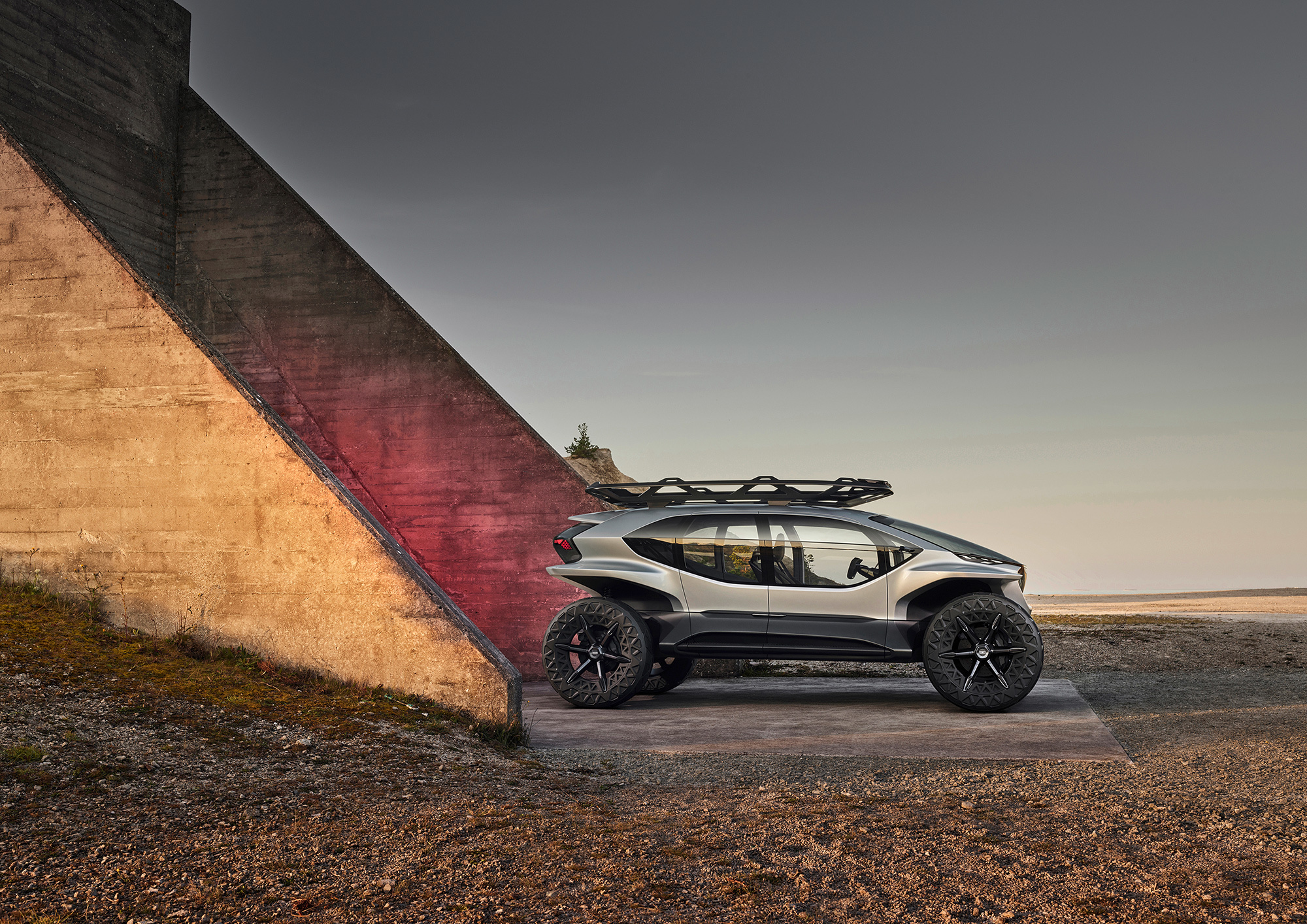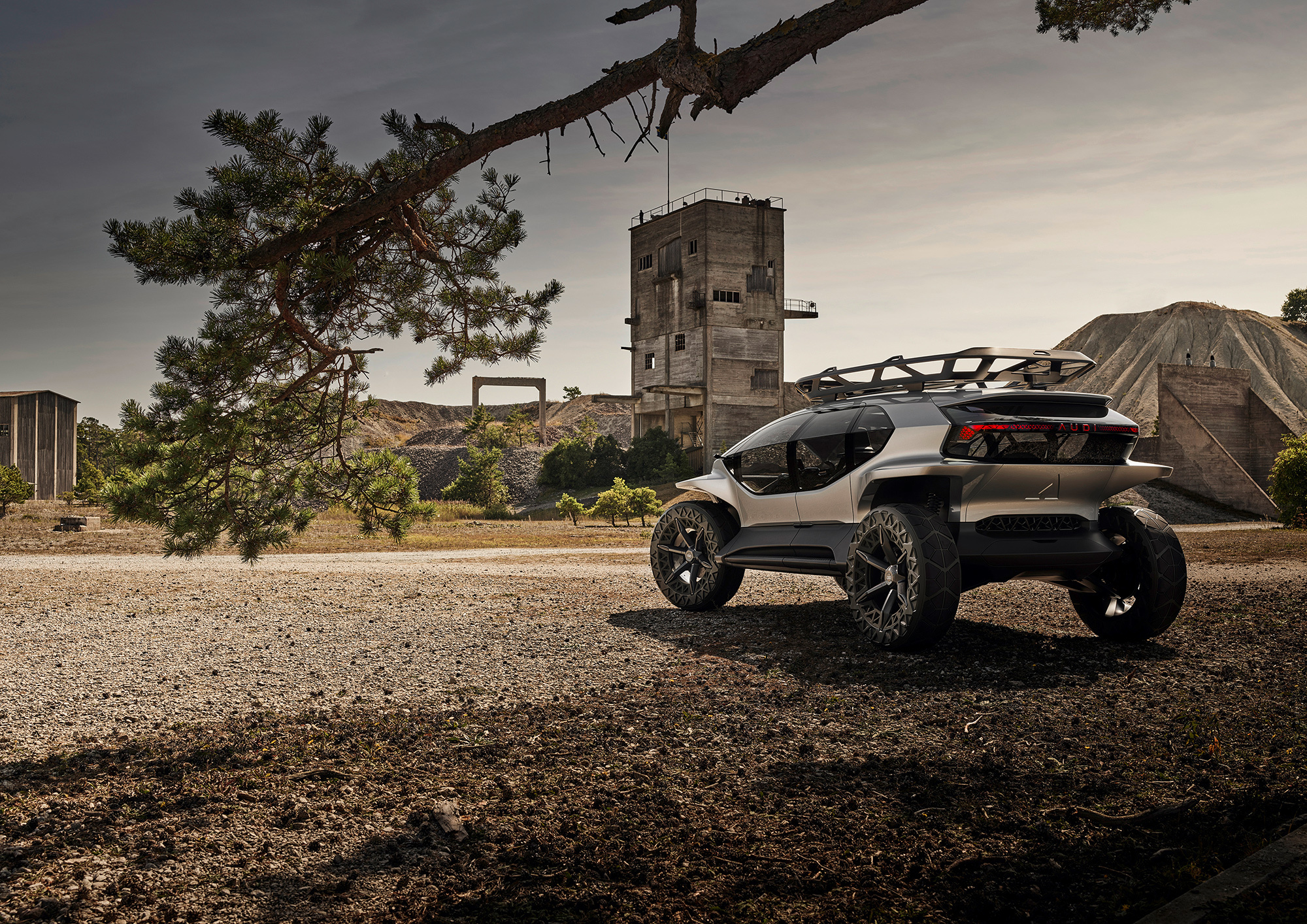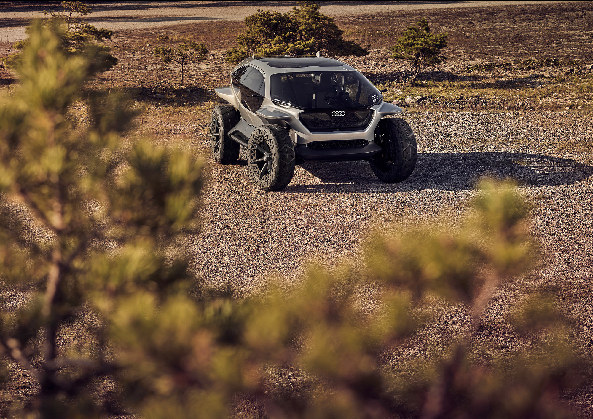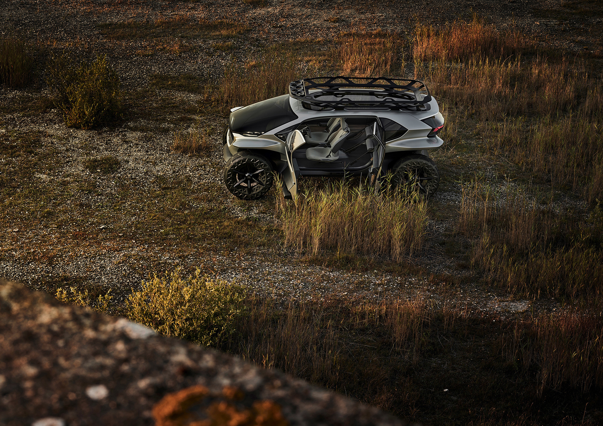 Четыре электромотора установлены рядом с колёсами и приводят их напрямую. Максимальная отдача системы — 320 кВт (435 л.с., 1000 Н•м). Однако вся мощность используется редко, да и привода на одну ось бывает достаточно. Литиево-ионная батарея встроена в днище: запас хода при езде по асфальту и лёгкому бездорожью составляет 400–500 км в цикле WLTP. В сложных условиях пробег меньше вдвое. Скоростной потолок — 130 км/ч. Прозрачный, как аквариум, салон вмещает четверых пассажиров. Экологически чистый внедорожник Audi AI:Trail quattro везёт их на природу. Путь освещают летящие дроны.