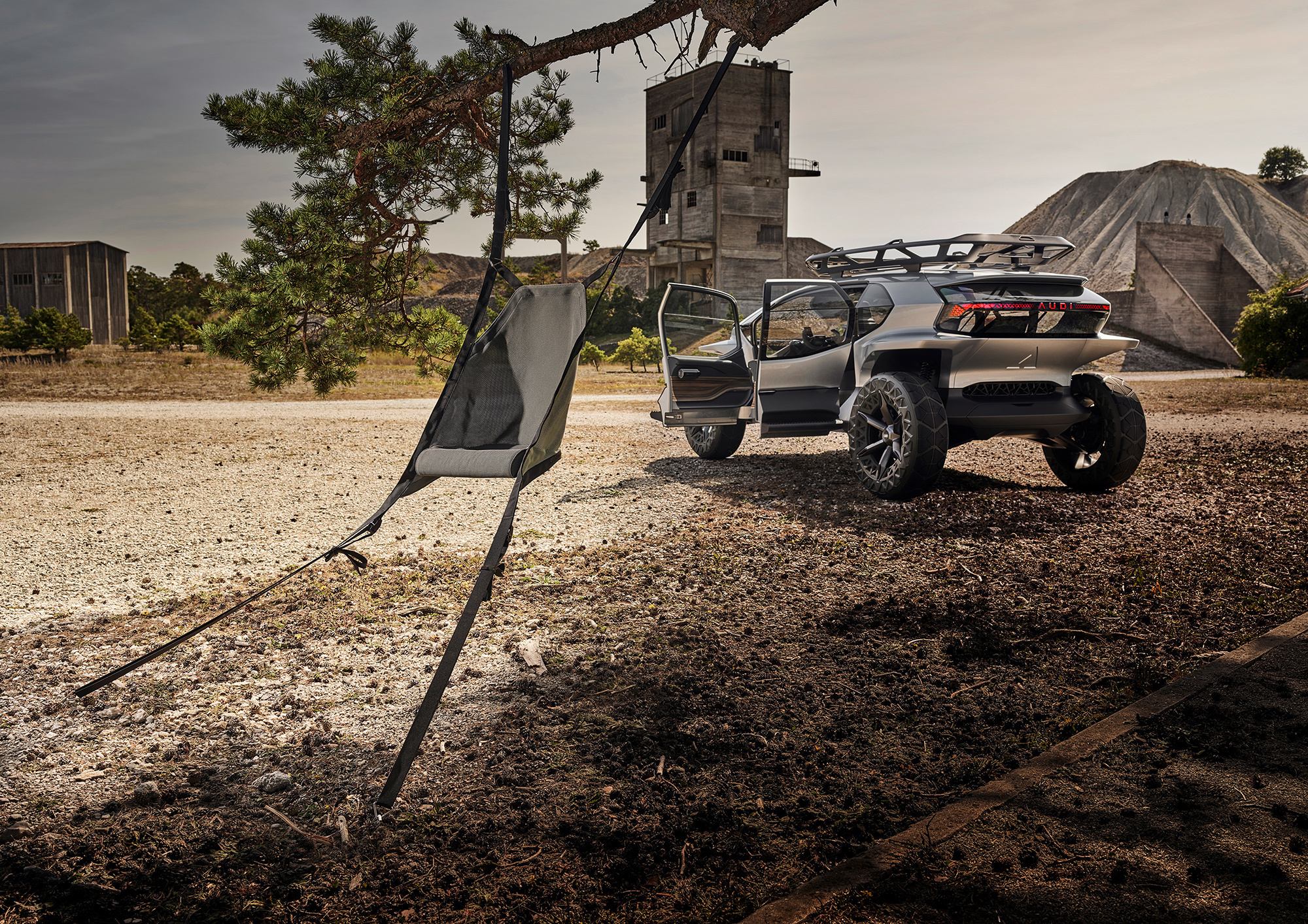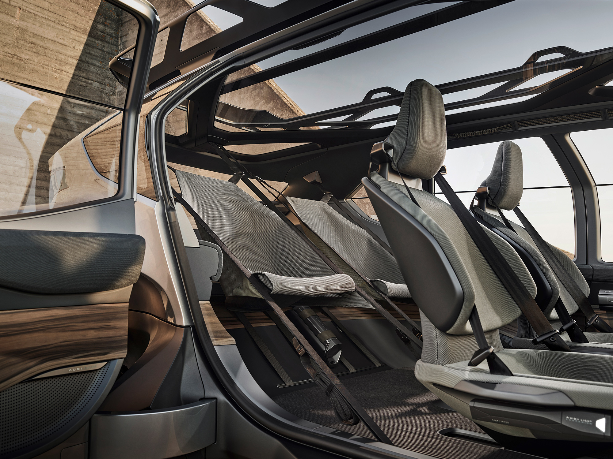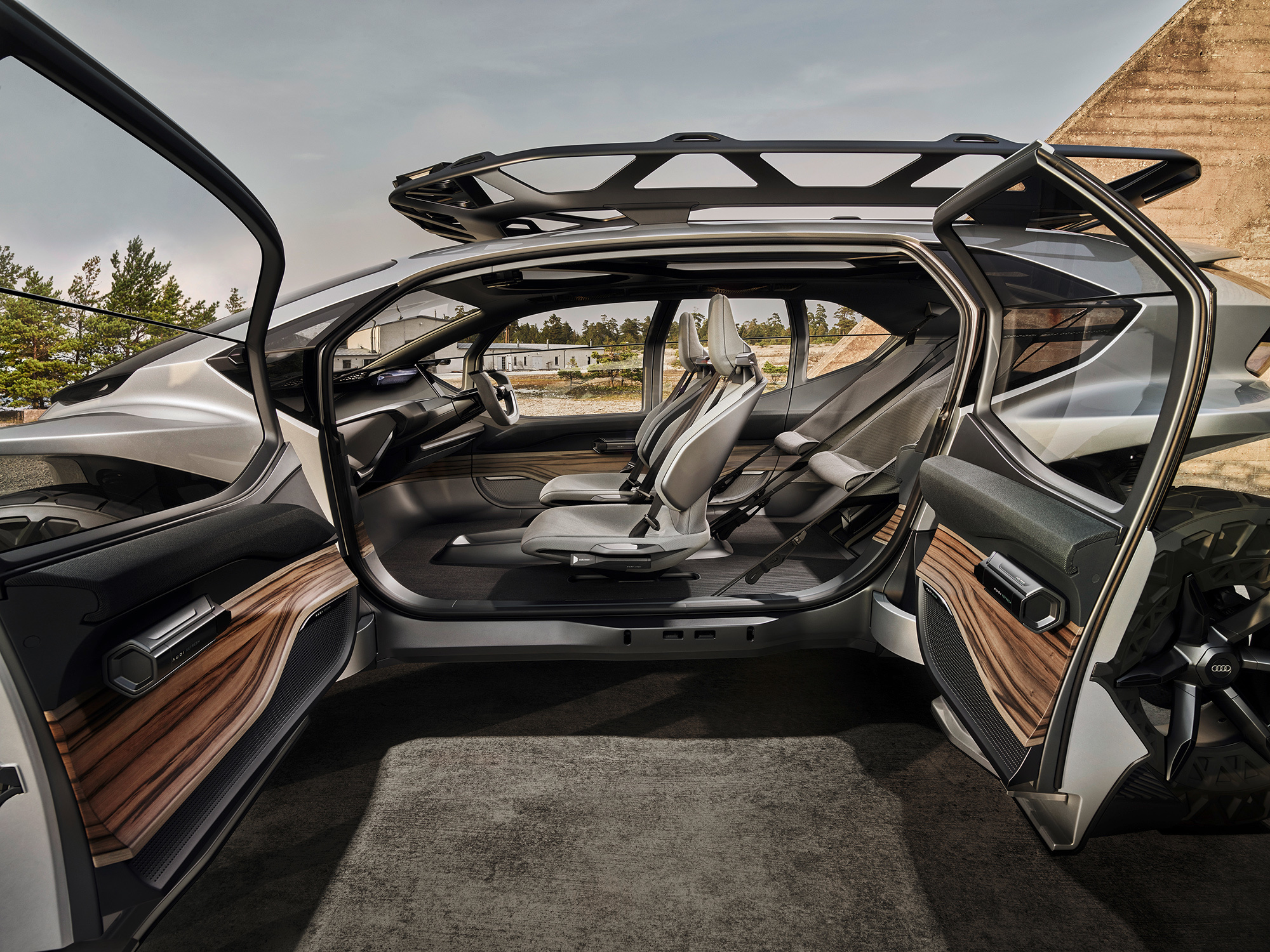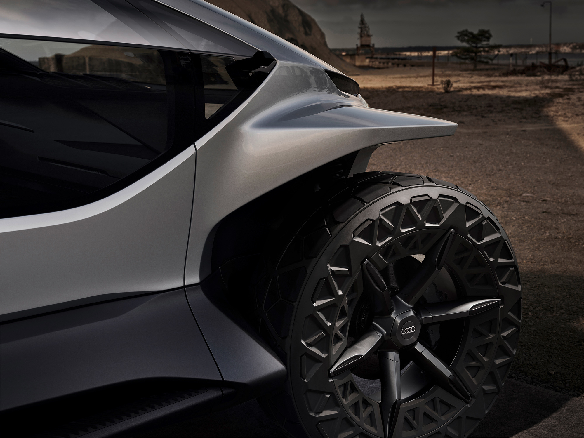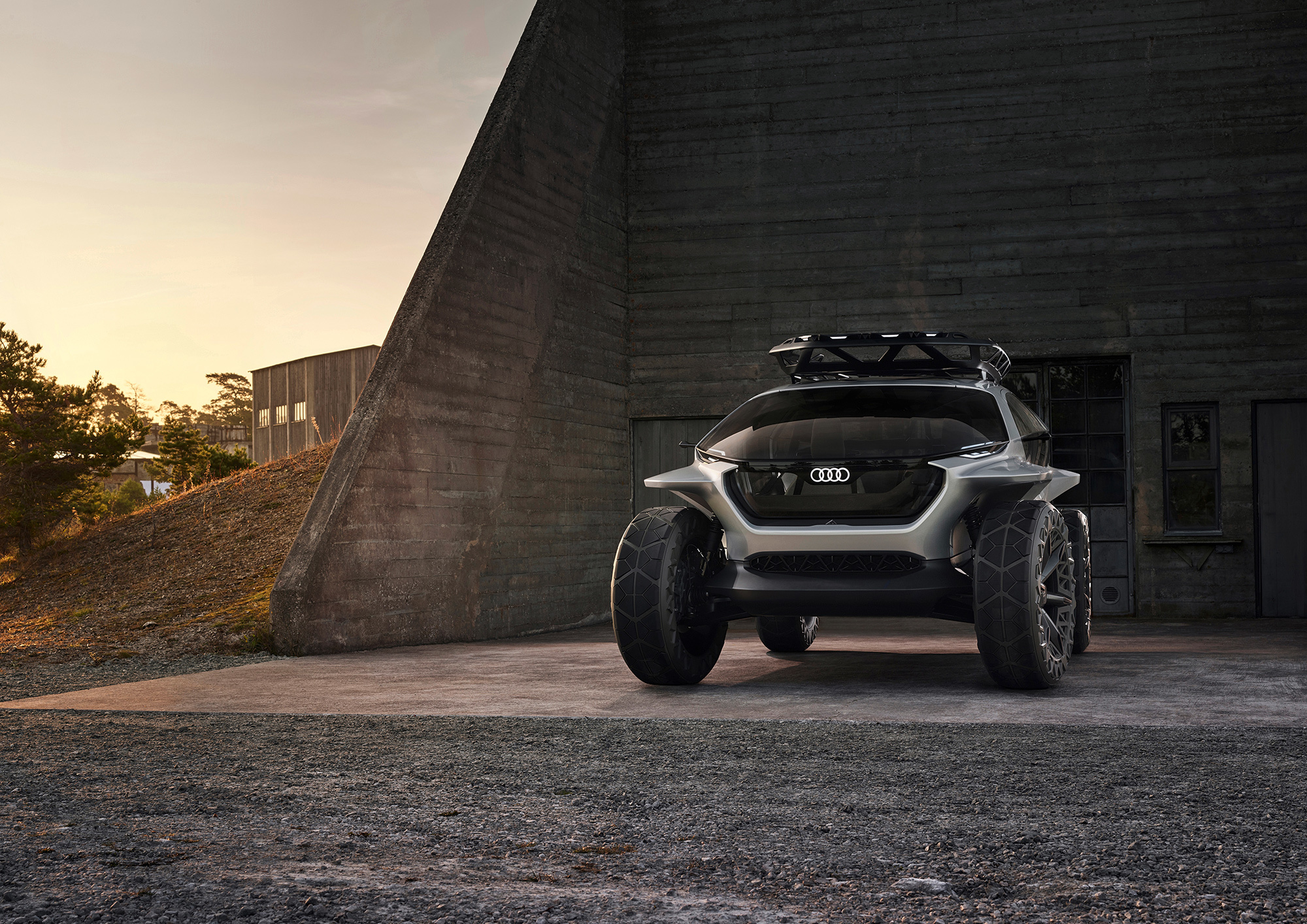 Четыре электромотора установлены рядом с колёсами и приводят их напрямую. Максимальная отдача системы — 320 кВт (435 л.с., 1000 Н•м). Однако вся мощность используется редко, да и привода на одну ось бывает достаточно. Литиево-ионная батарея встроена в днище: запас хода при езде по асфальту и лёгкому бездорожью составляет 400–500 км в цикле WLTP. В сложных условиях пробег меньше вдвое. Скоростной потолок — 130 км/ч. Прозрачный, как аквариум, салон вмещает четверых пассажиров. Экологически чистый внедорожник Audi AI:Trail quattro везёт их на природу. Путь освещают летящие дроны.